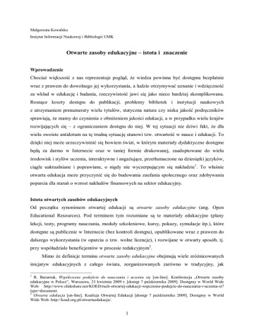 Małgorzata Kowalska Instytut Informacji Naukowej i Bibliologii UMK Otwarte zasoby edukacyjne – istota i znaczenie Wprowadzenie Chociaż większość z nas reprezentuje pogląd, że wiedza powinna być dostępna bezpłatnie wraz z prawem do dowolnego jej wykorzystania, a ludzie otrzymywać uznanie i wdzięczność za wkład w edukację i badania, rzeczywistość jawi się jako nieco bardziej skomplikowana. Rosnące koszty dostępu do publikacji, problemy bibliotek i instytucji naukowych z utrzymaniem prenumeraty wielu tytułów, statyczna natura czy niska jakość podręczników sprawiają, że mamy do czynienia z obniżeniem jakości edukacji, a w przypadku wielu krajów rozwijających się – z ograniczaniem dostępu do niej. W tej sytuacji nie dziwi fakt, że dla wielu swoiste antidotum na tę trudną sytuację stanowi tzw. otwartość w nauce i edukacji. To dzięki niej może urzeczywistnić się bowiem świat, w którym materiały dydaktyczne dostępne będą za darmo w Internecie oraz w taniej formie drukowanej, zaadoptowane do wielu środowisk i stylów uczenia, interaktywne i angażujące, przetłumaczone na dziesiątki języków, ciągle uaktualniane i poprawiane, o nigdy nie wyczerpującym się nakładzie1. To właśnie otwarta edukacja może przyczynić się do budowania zaufania społecznego oraz zdobywania poparcia dla starań o wzrost nakładów finansowych na sektor edukacyjny. Istota otwartych zasobów edukacyjnych Od początku synonimem otwartej edukacji są otwarte zasoby edukacyjne (ang. Open Educational Resources). Pod terminem tym rozumiane są te materiały edukacyjne (plany lekcji, testy, programy nauczania, moduły szkoleniowe, kursy, pokazy, symulacje itp.), które dostępne są publicznie w Internecie (bez kontroli dostępu), opublikowane wraz z prawem do dalszego wykorzystania (w oparciu o tzw. wolne licencje), i rozwijane w otwarty sposób, tj. przy współudziale beneficjentów w procesie redakcyjnym2. Mimo że definicje terminu otwarte zasoby edukacyjne obejmują wiele zróżnicowanych inicjatyw edukacyjnych z całego świata, zorganizowanych zarówno w tradycyjny, jak 1 R. Baraniuk, Współczesne podejście do nauczania i uczenia się [on-line]. Konferencja „Otwarte zasoby edukacyjne w Polsce”, Warszawa, 23 kwietnia 2009 r. [dostęp 7 października 2009]. Dostępny w World Wide Web: http://www.slideshare.net/KOED/ruch-otwartej-edukacji-wspczesne-podejcie-do-nauczania-i-uczenia-si? type=document. 2 Otwarta edukacja [on-line]. Koalicja Otwartej Edukacji [dostęp 7 października 2009]. Dostępny w World Wide Web: http://koed.org.pl/otwartaedukacja/. 1 i innowacyjny sposób, mających różne cele i grupy beneficjentów, zazwyczaj pojęciem tym określa się zawartość merytoryczną, narzędzia oprogramowania, licencje i poradnik opisujący przykłady najlepszego praktycznego użycia wszystkich tych materiałów. Otwarte zasoby edukacyjne (dalej: OZE) mogą zawierać tekst, grafiki, materiały audio i wideo, interaktywne symulacje, zbiory pytań i odpowiedzi oraz gry. Autorzy OZE dają użytkownikom swoich materiałów dużą swobodę działania, przyzwalając między innymi na modyfikację zasobów, ich tłumaczenie czy ulepszanie oraz udostępnianie innym. Po raz pierwszy na tego typu zasoby wskazano w lipcu 2002 r. podczas warsztatów UNESCO (Forum on the Impact of Open Courseware for Higher Education in Developing Countries) związanych z otwartymi programami edukacyjnymi w państwach rozwijających się3. Ich uczestnicy wyrazili swoje „życzenie stworzenia wspólnie uniwersalnych zasobów edukacyjnych dostępnych dla całej ludzkości” i „nadzieję, że to otwarte źródło w przyszłości zmobilizuje całą światową społeczność nauczycieli”4. Choć od tego momentu techniczne, prawne i społeczne fragmenty układanki ułożyły się we wspólną całość, dziś nie istnieje centralna organizacja grupująca, zarządzająca czy standaryzująca procedury OZE. Ruch ten czerpie z doświadczeń ruchu open access – koncentrującego się na promocji otwartej publikacji prac naukowych w Internecie oraz ruchu otwartego oprogramowania (open source) – dążącego do stworzenia swobodnego i wolnego dostępu do oprogramowania dla wszystkich użytkowników Sieci. Kluczowymi narzędziami, umożliwiającymi realizację idei OZE – podobnie jak w inicjatywach poprzedzających – są przede wszystkim technologie (jak Internet, system WWW, język HTML, narzędzia Web 2.0) oraz otwarte licencje prawnoautorskie (jak Creative Commons, GNU Free Documentation License (GFDL)). To dzięki tym dwóm elementom statyczne materiały dydaktyczne mogą być zamieniane w kompleksowe zasoby edukacyjne – stale rozwijane, aktualizowane i cyfrowo dystrybuowane. Obecnie na świecie powstaje wiele inicjatyw, które dzięki innowacyjnym narzędziom i serwisom umożliwiają dzielenie się posiadanymi materiałami oraz współpracę w zakresie ich przygotowywania. Z najpopularniejszych wystarczy wymienić w tym miejscu choćby takie projekty, jak: Wikipedia, Wolne Podręczniki, Connexions, OpenCourseWare, Free High 3 S. Gurell, S. Connelly, D. Wiley, Otwarte zasoby edukacyjne. Podstawowe informacje. Biuletyn EBIB [online] 2009, nr 1 (101) [dostęp 7 października 2009]. Dostępny w World Wide Web: http://www.ebib.info/ 2009/101/a.php?gurell_connelly_wiley. 4 Forum on the impact of open courseware for higher education in developing countries: final report (2002) [online]. UNESCO Documents and Publications [dostęp 7 października 2009]. Dostępny w World Wide Web: http://unesdoc.unesco.org/images/0012/001285/128515e.pdf. 2 School Science Textbooks, WikiEducator czy OpenLearn. Przedsięwzięcia te, podobnie jak setki innych powstających w tym zakresie, skupiają się przede wszystkim na: „tworzeniu wolnych od opłat licencyjnych podręczników do wykorzystania na pierwszym i drugim poziomie nauczania w szkołach (do nauczania w szkole podstawowej i gimnazjum); upraszc