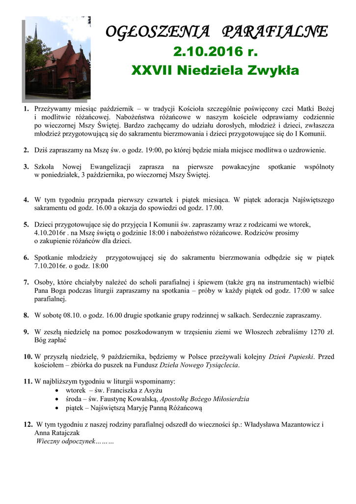 OGŁOSZENIA PARAFIALNE 2.10.2016 r. XXVII Niedziela Zwykła 1. Przeżywamy miesiąc październik – w tradycji Kościoła szczególnie poświęcony czci Matki Bożej i modlitwie różańcowej. Nabożeństwa różańcowe w naszym kościele odprawiamy codziennie po wieczornej Mszy Świętej. Bardzo zachęcamy do udziału dorosłych, młodzież i dzieci, zwłaszcza młodzież przygotowującą się do sakramentu bierzmowania i dzieci przygotowujące się do I Komunii. 2. Dziś zapraszamy na Mszę św. o godz. 19:00, po której będzie miała miejsce modlitwa o uzdrowienie. 3. Szkoła Nowej Ewangelizacji zaprasza na pierwsze w poniedziałek, 3 października, po wieczornej Mszy Świętej. powakacyjne spotkanie wspólnoty 4. W tym tygodniu przypada pierwszy czwartek i piątek miesiąca. W piątek adoracja Najświętszego sakramentu od godz. 16.00 a okazja do spowiedzi od godz. 17.00. 5. Dzieci przygotowujące się do przyjęcia I Komunii św. zapraszamy wraz z rodzicami we wtorek, 4.10.2016r . na Mszę świętą o godzinie 18:00 i nabożeństwo różańcowe. Rodziców prosimy o zakupienie różańców dla dzieci. 6. Spotkanie młodzieży przygotowującej się do sakramentu bierzmowania odbędzie się w piątek 7.10.2016r. o godz. 18:00 7. Osoby, które chciałyby należeć do scholi parafialnej i śpiewem (także grą na instrumentach) wielbić Pana Boga podczas liturgii zapraszamy na spotkania – próby w każdy piątek od godz. 17:00 w salce parafialnej. 8. W sobotę 08.10. o godz. 16.00 drugie spotkanie grupy rodzinnej w salkach. Serdecznie zapraszamy. 9. W zeszłą niedzielę na pomoc poszkodowanym w trzęsieniu ziemi we Włoszech zebraliśmy 1270 zł. Bóg zapłać 10. W przyszłą niedzielę, 9 października, będziemy w Polsce przeżywali kolejny Dzień Papieski. Przed kościołem – zbiórka do puszek na Fundusz Dzieła Nowego Tysiąclecia. 11. W najbliższym tygodniu w liturgii wspominamy: wtorek – św. Franciszka z Asyżu środa – św. Faustynę Kowalską, Apostołkę Bożego Miłosierdzia piątek – Najświętszą Maryję Panną Różańcową 12. W tym tygodniu z naszej rodziny parafialnej odszedł do wieczności śp.: Władysława Mazantowicz i Anna Ratajczak Wieczny odpoczynek………