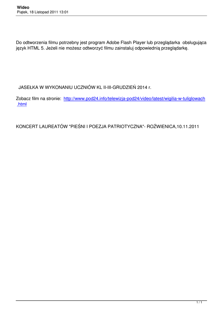 Wideo Piątek, 18 Listopad 2011 13:01 Do odtworzenia filmu potrzebny jest program Adobe Flash Player lub przeglądarka obsługująca język HTML 5. Jeżeli nie możesz odtworzyć filmu zainstaluj odpowiednią przeglądarkę. JASEŁKA W WYKONANIU UCZNIÓW KL II-III-GRUDZIEŃ 2014 r. Zobacz film na stronie: http://www.pod24.info/telewizja-pod24/video/latest/wigilia-w-tuliglowach .html KONCERT LAUREATÓW "PIEŚNI I POEZJA PATRIOTYCZNA"- ROŹWIENICA,10.11.2011 1/1