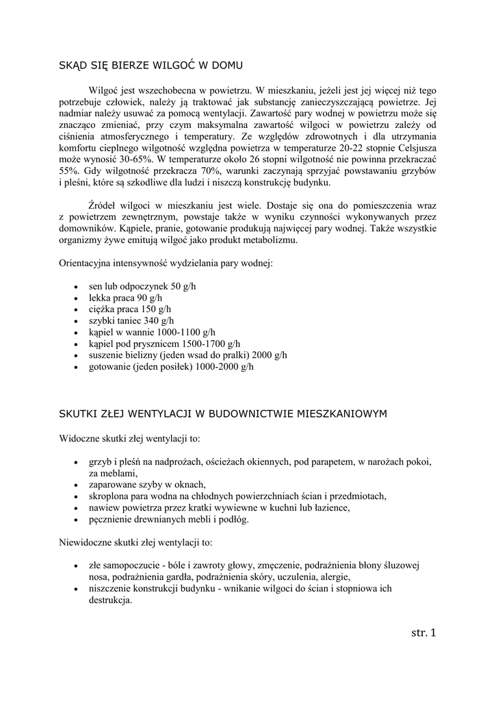 SKĄD SIĘ BIERZE WILGOĆ W DOMU Wilgoć jest wszechobecna w powietrzu. W mieszkaniu, jeżeli jest jej więcej niż tego potrzebuje człowiek, należy ją traktować jak substancję zanieczyszczającą powietrze. Jej nadmiar należy usuwać za pomocą wentylacji. Zawartość pary wodnej w powietrzu może się znacząco zmieniać, przy czym maksymalna zawartość wilgoci w powietrzu zależy od ciśnienia atmosferycznego i temperatury. Ze względów zdrowotnych i dla utrzymania komfortu cieplnego wilgotność względna powietrza w temperaturze 20-22 stopnie Celsjusza może wynosić 30-65%. W temperaturze około 26 stopni wilgotność nie powinna przekraczać 55%. Gdy wilgotność przekracza 70%, warunki zaczynają sprzyjać powstawaniu grzybów i pleśni, które są szkodliwe dla ludzi i niszczą konstrukcję budynku. Źródeł wilgoci w mieszkaniu jest wiele. Dostaje się ona do pomieszczenia wraz z powietrzem zewnętrznym, powstaje także w wyniku czynności wykonywanych przez domowników. Kąpiele, pranie, gotowanie produkują najwięcej pary wodnej. Także wszystkie organizmy żywe emitują wilgoć jako produkt metabolizmu. Orientacyjna intensywność wydzielania pary wodnej: sen lub odpoczynek 50 g/h lekka praca 90 g/h ciężka praca 150 g/h szybki taniec 340 g/h kąpiel w wannie 1000-1100 g/h kąpiel pod prysznicem 1500-1700 g/h suszenie bielizny (jeden wsad do pralki) 2000 g/h gotowanie (jeden posiłek) 1000-2000 g/h SKUTKI ZŁEJ WENTYLACJI W BUDOWNICTWIE MIESZKANIOWYM Widoczne skutki złej wentylacji to: grzyb i pleśń na nadprożach, ościeżach okiennych, pod parapetem, w narożach pokoi, za meblami, zaparowane szyby w oknach, skroplona para wodna na chłodnych powierzchniach ścian i przedmiotach, nawiew powietrza przez kratki wywiewne w kuchni lub łazience, pęcznienie drewnianych mebli i podłóg. Niewidoczne skutki złej wentylacji to: złe samopoczucie - bóle i zawroty głowy, zmęczenie, podrażnienia błony śluzowej nosa, podrażnienia gardła, podrażnienia skóry, uczulenia, alergie, niszczenie konstrukcji budynku - wnikanie wilgoci do ścian i stopniowa ich destrukcja. str. 1 Konsekwencją złej wentylacji i oddychania zanieczyszczonym powietrzem może być astma lub inne choroby dróg oddechowych, a nawet nowotwory. Niesprawnie działająca wentylacja w pomieszczeniach z gazowymi urządzeniami grzewczymi może doprowadzić do wydzielania się tlenku węgla. Zatrucie tlenkiem węgla może mieć bardzo poważne konsekwencje zdrowotne, ze skutkiem śmiertelnym włącznie. WENTYLACJA NATURALNA Najbardziej popularnym rodzajem wentylacji budynków mieszkalnych w Polsce, stosowanym od lat, jest wentylacja naturalna, zwana też grawitacyjną. Siłą napędową wentylacji naturalnej jest różnica gęstości powietrza zimnego (świeżego, na zewnątrz pomieszczeń) i ciepłego (znajdującego się w pomieszczeniach). Powietrze zimne napływa do pomieszczeń przez nieszczelności w oknach i ścianach budynku lub przez nawiewniki instalowane w oknach i ścianach. Po wymieszaniu z powietrzem znajdującym się w pomieszczeniu i ogrzaniu, opuszcza pomieszczenie wraz z zanieczyszczeniami przez kratki wentylacyjne podłączone do kanałów wentylacyjnych. Zgodnie z polskimi przepisami budowlanymi, wloty do przewodów wentylacyjnych muszą się znajdować w kuchni, łazience lub w.c., pomieszczeniach bezokiennych, czasem także w innych pomieszczeniach. Aby wentylacja naturalna działała prawidłowo, do budynku musi się dostać odpowiednia ilość powietrza. Dawniej, gdy okna były niezbyt szczelne, dopływ powietrza był zawsze wystarczający, a niekiedy nawet zbyt duży. Nowoczesne okna, wyposażone w systemy uszczelek nie zapewniają wystarczającego napływu powietrza potrzebnego do wentylacji, dlatego wymagają montażu nawiewników. Powietrze, które dostanie się do pomieszczenia musi przedostać się przez całe mieszkanie w drodze do kratek wywiewnych wentylacji. Aby to było możliwe trzeba zadbać o to, żeby pod skrzydłami drzwiowymi pomiędzy pokojami pozostawić szczelinę o powierzchni 80 cm2 (można podciąć drzwi o 1 cm na całej szerokości). Pod drzwiami do kuchni, łazienki, w.c. i garderoby szczelina musi być większa - 200 cm2. Można podciąć drzwi o 2,5 cm lub zamontować w dolnej części kratkę. Gazowe urządzenia grzewcze potrzebują do prawidłowej pracy odpowiedniej ilości tlenu, a spaliny muszą być bardzo skutecznie usuwane. Konieczna jest sprawna instalacja wentylacyjna. Dlatego szczególnej uwagi wymaga wentylacja kuchni i łazienki wyposażonej w takie urządzenia. str. 2 Nie zawsze działa prawidłowo… Mankamentem wentylacji naturalnej jest zależność skuteczności jej działania od warunków panujących na zewnątrz budynku. Zimą, gdy różnica temperatury na zewnątrz i wewnątrz budynku jest duża, wentylacja działa sprawnie, a czasami nawet jest bardziej intensywna niż to konieczne. Wentylacja naturalna może działać prawidłowo tylko wtedy, gdy temperatura na zewnątrz jest zdecydowanie niższa niż w budynku. Przy małej różnicy temperatury siła ciągu może być zbyt mała, aby była skuteczna. W skrajnym wypadku może dojść nawet do odwrócenia kierunku przepływu powietrza przez kanały wentylacyjne. Powietrze z zewnątrz będzie tłoczone do pomieszczeń przez kratki wentylacyjne. Latem wentylacja naturalna najczęściej działa słabo. Warunkiem działania wentylacji jest oczywiście zapewnienie odpowiedniej ilości powietrza, które przedostaje się do pomieszczeń. Gdy okna są zbyt szczelne, nie ma nawiewników, nawet korzystna różnica gęstości powietrza nie spowoduje wystarczająco dużego ciągu w kanałach wentylacyjnych i wymiana powietrza będzie zła. Na efekty działania wentylacji grawitacyjnej mają wpływ również rozwiązania konstrukcyjne budynków, wymagania urbanistyki oraz warunki użytkowania pomieszczeń. Skuteczność wentylacji naturalnej zależy także od długości kanału wentylacyjneg