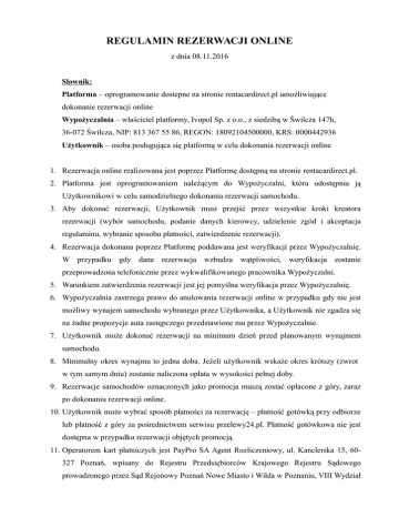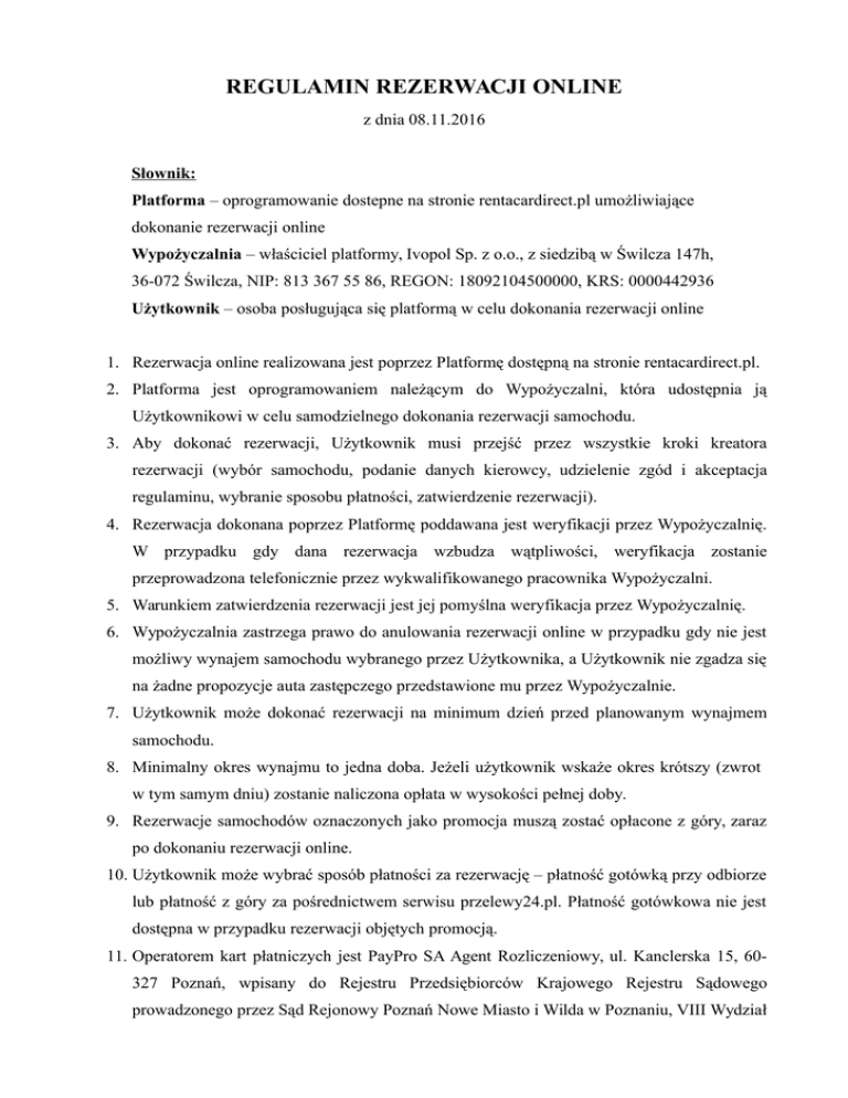 REGULAMIN REZERWACJI ONLINE z dnia 08.11.2016 Słownik: Platforma – oprogramowanie dostepne na stronie rentacardirect.pl umożliwiające dokonanie rezerwacji online Wypożyczalnia – właściciel platformy, Ivopol Sp. z o.o., z siedzibą w Świlcza 147h, 36-072 Świlcza, NIP: 813 367 55 86, REGON: 18092104500000, KRS: 0000442936 Użytkownik – osoba posługująca się platformą w celu dokonania rezerwacji online 1. Rezerwacja online realizowana jest poprzez Platformę dostępną na stronie rentacardirect.pl. 2. Platforma jest oprogramowaniem należącym do Wypożyczalni, która udostępnia ją Użytkownikowi w celu samodzielnego dokonania rezerwacji samochodu. 3. Aby dokonać rezerwacji, Użytkownik musi przejść przez wszystkie kroki kreatora rezerwacji (wybór samochodu, podanie danych kierowcy, udzielenie zgód i akceptacja regulaminu, wybranie sposobu płatności, zatwierdzenie rezerwacji). 4. Rezerwacja dokonana poprzez Platformę poddawana jest weryfikacji przez Wypożyczalnię. W przypadku gdy dana rezerwacja wzbudza wątpliwości, weryfikacja zostanie przeprowadzona telefonicznie przez wykwalifikowanego pracownika Wypożyczalni. 5. Warunkiem zatwierdzenia rezerwacji jest jej pomyślna weryfikacja przez Wypożyczalnię. 6. Wypożyczalnia zastrzega prawo do anulowania rezerwacji online w przypadku gdy nie jest możliwy wynajem samochodu wybranego przez Użytkownika, a Użytkownik nie zgadza się na żadne propozycje auta zastępczego przedstawione mu przez Wypożyczalnie. 7. Użytkownik może dokonać rezerwacji na minimum dzień przed planowanym wynajmem samochodu. 8. Minimalny okres wynajmu to jedna doba. Jeżeli użytkownik wskaże okres krótszy (zwrot w tym samym dniu) zostanie naliczona opłata w wysokości pełnej doby. 9. Rezerwacje samochodów oznaczonych jako promocja muszą zostać opłacone z góry, zaraz po dokonaniu rezerwacji online. 10. Użytkownik może wybrać sposób płatności za rezerwację – płatność gotówką przy odbiorze lub płatność z góry za pośrednictwem serwisu przelewy24.pl. Płatność gotówkowa nie jest dostępna w przypadku rezerwacji objętych promocją. 11. Operatorem kart płatniczych jest PayPro SA Agent Rozliczeniowy, ul. Kanclerska 15, 60327 Poznań, wpisany do Rejestru Przedsiębiorców Krajowego Rejestru Sądowego prowadzonego przez Sąd Rejonowy Poznań Nowe Miasto i Wilda w Poznaniu, VIII Wydział Gospodarczy Krajowego Rejestru Sądowego pod numerem KRS 0000347935, NIP 7792369887, Regon 301345068. 12. Po pomyślnym zarezerwowaniu samochodu poprzez Platformę, pod adres e-mail podany w procesie rezerwacji, zostanie wysłana wiadomość potwierdzająca dokonanie rezerwacji. 13. Użytkownik może zrezygnować z rezerwacji pojazdu w okresie nie krótszym niż 1 dzień przed planowanym wynajmem. Anulowania rezerwacji należy dokonać poprzez kontakt telefoniczny z Wypożyczalnią (podany w wiadomości potwierdzającej, o której mowa w punkcie 11). 14. W przypadku anulowania rezerwacji, w której została dokonana przedpłata, zostanie ona zwrócona Użytkownikowi tym samym kanałem, którym dotarła do Wypożyczalni. 15. W przypadku anulowania przedpłaconej rezerwacji w terminie krótszym niż 1 dzień ale jeszcze przed rozpoczęciem wynajmu, Wypożyczalnia ma prawo do potrącenia kwoty zwrotu o koszty związane z przetrzymaniem pojazdu w wysokości 30% wartości rezerwacji. 16. W przypadku anulowania przedpłaconej rezerwacji po rozpoczęciu wynajmu Wypożyczalnia ma prawo odmówić zwrotu całości kwoty za rezerwację. 17. Akceptacja regulaminu oznacza wyrażenie zgody przez Użytkownika na przetwarzanie jego danych osobowych przez IVOPOL Sp. z o.o. z siedzibą w Świlczy 147H, 36-072 Świlcza, w zakresie, w jakim jest do niezbędne dla przygotowania do zawarcia umowy najmu, w tym rezerwacji samochodu oraz dla realizacji umowy najmu samochodu. Użytkownik oświadcza ponadto, iż dane zostały podane przeze niego dobrowolnie oraz został on poinformowany o prawie dostępu do moich danych i możliwości ich poprawiania. 18. Akceptacja regulaminu oznacza wyrażenie zgody Użytkownika na udostępnianie jego danych osobowych podmiotom trzecim współpracującym z IVOPOL Sp. z o.o. w zakresie, w jakim jest to niezbędne dla celów przygotowania do zawarcia umowy najmu samochodu, w tym rezerwacji samochodu, oraz dla realizacji umowy najmu. 19. W sprawach dotyczących ogólnych zasad wynajmu jak i poszczególnych promocji mają zastosowanie przepisy zawarte http://rentacardirect.pl/regulamin.html w regulaminach dostępnych pod adresem: