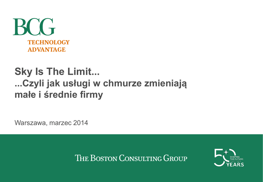 TECHNOLOGY ADVANTAGE Sky Is The Limit... ...Czyli jak usługi w chmurze zmieniają małe i średnie firmy Warszawa, marzec 2014 Dotychczas małym i średnim firmom trudno było zyskać dostęp do nowoczesnych rozwiązań IT • Konieczne kapitałochłonne inwestycje w infrastrukturę IT i oprogramowanie, sprzęt oraz kosztowne utrzymanie tych wszystkich elementów Copyright © 2013 by The Boston Consulting Group, Inc. All rights reserved. • Jakiekolwiek wdrożenie oprogramowania związane z co najmniej kilkumiesięcznym projektem • Konieczne zatrudnianie wyspecjalizowanych informatyków do rozwijania i zarządzania posiadaną infrastrukturą IT i oprogramowaniem • Niezbędna zaawansowana wiedza IT u właściciela firmy, aby mógł określić, czego właściwie potrzebuje i jak to zorganizować • Wykorzystanie usług IT w małych i średnich przedsiębiorstwach jest nieregularne, więc utrzymanie całej infrastruktury IT dla małej skali jest wielce nieefektywne BCG Cloud SME presentation-4Mar14-v7.ppt 1 Usługi IT w chmurze wyrównują szanse małych i średnich przedsiębiorstw w konkurencji z wielkimi graczami • Usługi IT są przechowywane przez dostawcę na jego własnej infrastrukturze i nie wymagają inwestycji ze strony MŚP • Usługi IT w chmurze dostępne od zaraz w postaci pełnych i niezależnych produktów, które wymagają minimalnych funkcjonalności po stronie użytkownika Copyright © 2013 by The Boston Consulting Group, Inc. All rights reserved. • Dostawca usług w chmurze w pełni zarządza systemem i infrastrukturą, co sprawia, że po stronie odbiorcy potrzebne jest zatrudnienie jedynie minimalnego wsparcia • Usługobiorca w chmurze zyskuje dostęp do całego ekosystemu i rodziny produktów – nawet takich, o których użytkownik jeszcze nie wie, że potrzebuje / mógłby wykorzystywać • Za usługi w chmurze płaci się z reguły "per użycie", tj. wtedy, kiedy są rzeczywiście potrzebne i nie ma konieczności ponoszenia kosztów infrastruktury / oprogramowania, gdy nie jest ono wykorzystywane BCG Cloud SME presentation-4Mar14-v7.ppt 2 BCG sprawdziło jak zaplecze technologiczne wpływa na rozwój firm – wyróżniliśmy trzy grupy Wiodące przykłady używanych technologii Naśladowcy Liderzy Komputer PC, laptop Smart phone Portal dla klientów Dostęp do internetu Poczta elektroniczna (e-mail) Portal dla klientów na urządzenia mobilne Programy zwiększania produktywności (np. MS Office) Strona w mediach społecznościowych Usługi IT w chmurze Poziom wykorzystania badanych technologii <30% 30-60% Copyright © 2013 by The Boston Consulting Group, Inc. All rights reserved. Technologiczne "żółwie" >60% Żródło: Analiza BCG, kwiecień 2013 BCG Cloud SME presentation-4Mar14-v7.ppt 3 Technologiczni liderzy rosną szybciej i zwiększają zatrudnienie Rozwinięte rynki Rynki rozwijające się +13 +15 Przychody firm 17 Technologiczne "żółwie" 13 7 4 Naśladowcy Liderzy Rozwinięte rynki Technologiczne "żółwie" Naśladowcy Liderzy Copyright © 2013 by The Boston Consulting Group, Inc. All rights reserved. Średnioroczny wzrost 2010–2012 (%) 28 20 Rynki rozwijające się +10 +4 Miejsca pracy 12 Średnioroczny wzrost 2010–2012 (%) 12 Technologiczne "żółwie" Naśladowcy 16 4 2 Technologiczne "żółwie" 12 Naśladowcy Liderzy Liderzy Source: BCG economic impact study quantitative survey, April 2013. BCG Cloud SME presentation-4Mar14-v7.ppt 4 Usługi w chmurze dostępne również dla polskich małych i średnich przedsiębiorstw – wiele firm już z nich korzysta ...korzystający z przykładowej usługi w chmurze Designer mody Sklep internetowy • Prezentacja produktów • Pośrednictwo sprzedaży Właściciel restauracji Serwis rezerwacji online • Wyszukiwarka wolnych stolików i rezerwacja • Usługa zintegrowana z dużymi portalami restauracyjnymi – np. gastronauci.pl Biuro podróży Serwis CRM (Customer Relationship Mgmt) • Zarządzanie profilami i kontaktami z klientami • Zarządzanie kampaniami i segmentacją klientów Doradca strategiczny Hurtownia danych z ultraszybkim procesowaniem • Analiza danych / Business Intelligence • Generacja szczegółowych raportów BCG Cloud SME presentation-4Mar14-v7.ppt Copyright © 2013 by The Boston Consulting Group, Inc. All rights reserved. Typ przedsiębiorstwa... 5 Bezpieczeństwo w chmurze wymaga zmiany podejścia – zagrożenie nie jest większe, jest po prostu inne Tradycyjne usługi IT na urządzeniach należących do użytkownika Mechanizmy bezpieczeństwa Integralność danych Dostępność Ryzyko prawne Ryzyko operacyjne + − − + − + • Zagrożenie włamania na komputer • W przeciętnej firmie wiele z mechanizmów niestosowanych (np. szyfrowanie, antywirus) • Zagrożenie utraty danych przy częstym braku kopii zapasowych • Wysoka dostępność do danych dla firmy • Użytkownik w pełni obarczony ryzykiem prawnym za utracone dane • Potencjalne oszustwa pracowników lub fizyczna kradzież urządzenia BCG Cloud SME presentation-4Mar14-v7.ppt − + + − + − • Ponad standardowe ryzyka - zagrożenie włamania na infrastrukturę centralną Copyright © 2013 by The Boston Consulting Group, Inc. All rights reserved. Poufność danych Usługi IT dostarczane z chmury • Przeciętny dostawca zapewnia większość mechanizmów bezpieczeństwa • Dane chronione kopiami zapasowymi w czasie rzeczywistym • Ryzyko odcięcia od danych firmy • Ryzyko prawne w dużej mierze przeniesione na dostawcę usług • Ponad standardowe ryzyka – potencjalne przerwania operacji lub bankructwa dostawcy 6 Wnioski dla małych i średnich przedsiębiorstw • Nowoczesne technologie zapewniają wyższą dochodowość, a chmura jako ich najnowsze wcielenie zapewnia dostęp do najbardziej zaawansowanych usług IT i pozwala małym i średnim przedsiębiorstwom konkurować jak równy z równym z największymi firmami • Najlepszym papierkiem lakmusowym dla nowych pomysłów są o