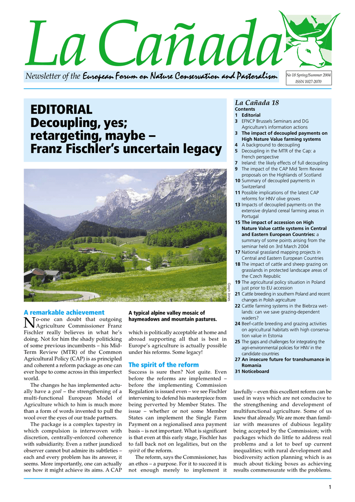 La Cañada Newsletter of the Gwyn Jones N o-one can doubt that outgoing Agriculture Commissioner Franz Fischler really believes in what he’s doing. Not for him the shady politicking of some previous incumbents – his MidTerm Review (MTR) of the Common Agricultural Policy (CAP) is as principled and coherent a reform package as one can ever hope to come across in this imperfect world. The changes he has implemented actually have a goal – the strengthening of a multi-functional European Model of Agriculture which to him is much more than a form of words invented to pull the wool over the eyes of our trade partners. The package is a complex tapestry in which compulsion is interwoven with discretion, centrally-enforced coherence with subsidiarity. Even a rather jaundiced observer cannot but admire its subtleties – each and every problem has its answer, it seems. More importantly, one can actually see how it might achieve its aims. A CAP A typical alpine valley mosaic of haymeadows and mountain pastures. which is politically acceptable at home and abroad supporting all that is best in Europe’s agriculture is actually possible under his reforms. Some legacy! The spirit of the reform Success is sure then? Not quite. Even before the reforms are implemented – before the implementing Commission Regulation is issued even – we see Fischler intervening to defend his masterpiece from being perverted by Member States. The issue – whether or not some Member States can implement the Single Farm Payment on a regionalised area payment basis – is not important. What is significant is that even at this early stage, Fischler has to fall back not on legalities, but on the spirit of the reform. The reform, says the Commissioner, has an ethos – a purpose. For it to succeed it is not enough merely to implement it ISSN 1027-2070 La Cañada 18 EDITORIAL Decoupling, yes; retargeting, maybe – Franz Fischler’s uncertain legacy A remarkable achievement No 18 Spring/Summer 2004 Contents 1 Editorial 3 EFNCP Brussels Seminars and DG Agriculture’s information actions 3 The impact of decoupled payments on High Nature Value farming systems 4 A background to decoupling 5 Decoupling in the MTR of the Cap: a French perspective 7 Ireland: the likely effects of full decoupling 9 The impact of the CAP Mid Term Review proposals on the Highlands of Scotland 10 Summary of decoupled payments in Switzerland 11 Possible implications of the latest CAP reforms for HNV olive groves 13 Impacts of decoupled payments on the extensive dryland cereal farming areas in Portugal 15 The impact of accession on High Nature Value cattle systems in Central and Eastern European Countries: a summary of some points arising from the seminar held on 3rd March 2004 17 National grassland mapping projects in Central and Eastern European Countries 18 The impact of cattle and sheep grazing on grasslands in protected landscape areas of the Czech Republic 19 The agricultural policy situation in Poland just prior to EU accession 21 Cattle breeding in southern Poland and recent changes in Polish agriculture 22 Cattle farming systems in the Biebrza wetlands: can we save grazing-dependent waders? 24 Beef-cattle breeding and grazing activities on agricultural habitats with high conservation value in Estonia 25 The gaps and challenges for integrating the agri-environmental policies for HNV in the candidate countries 27 An insecure future for transhumance in Romania 31 Noticeboard lawfully – even this excellent reform can be used in ways which are not conducive to the strengthening and development of multifunctional agriculture. Some of us knew that already. We are more than familiar with measures of dubious legality being accepted by the Commission; with packages which do little to address real problems and a lot to beef up current inequalities; with rural development and biodiversity action planning which is as much about ticking boxes as achieving results commensurate with the problems. 1 La Cañada – Number 18 Spring/Summer 2004 Eric Bignal which require urgent attention. Bulgaria’s agriculture, for example, has to contend with massive challenges of infrastructure collapse after years of under investment. Poland has millions of small and semi-subsistence farmers and an industry apparently crying out for restructuring. Who can blame these countries if the fate of seminatural grasslands is low on their priority list? And more or less every Member State has its farming elite, usually an agroindustrial complex of its largest producers, processors, suppliers and Average herd-size in Bulgaria is less than ten cows, and most retailers. They may mountain producers have only two to three milking cows which graze communal pastures and return each evening to the represent only a small fraction of village for milking. farms, and the land So why does this cynicism not inform the they manage may not even be a majority of the country’s surface area. Their need for reform? support, as players on the world stage, is certainly limited. Nevertheless such is their Austria is not the norm Someone commented recently that it was political clout that it is to these farmers that notable how the direction and language of policy is targeted. Even LFA (Less Favoured Community policy changed in the last Areas) and agri-environment programmes Accession, when Austria, Sweden and are not immune. Indeed, so common is the Finland joined the Union. Fischler is a divergence from the Austrian ‘norm’ for all symptom of this change as well as its these reasons and more that the surprise will be if any country actually does implemidwife. These countries generally valued their ment the MTR in a balanced way, following countryside – the landscape, the wildlife, the ‘spirit of the reform’. the fine products, the value for the tourist industry and the mental well-being and The reality of the EMA self-image of the populace. They also Why does this matter? Farming is mul