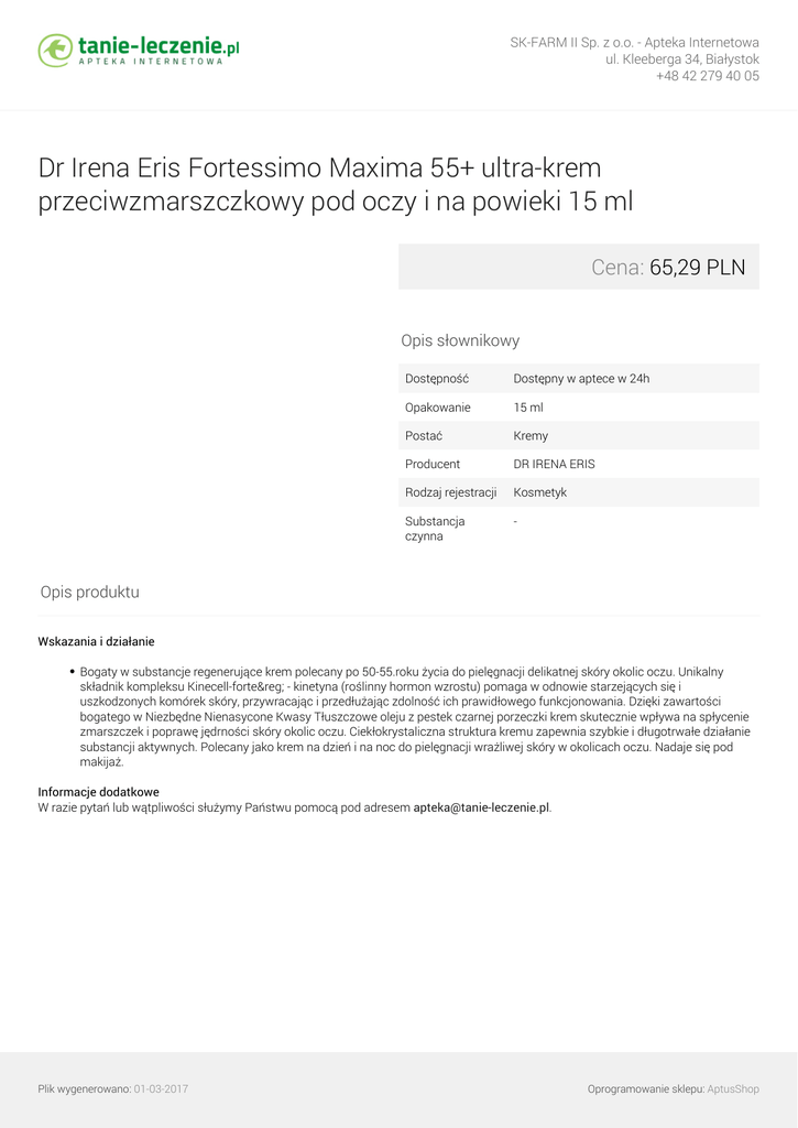 SK-FARM II Sp. z o.o. - Apteka Internetowa ul. Kleeberga 34, Białystok +48 42 279 40 05 Dr Irena Eris Fortessimo Maxima 55+ ultra-krem przeciwzmarszczkowy pod oczy i na powieki 15 ml Cena: 65,29 PLN Opis słownikowy Dostępność Dostępny w aptece w 24h Opakowanie 15 ml Postać Kremy Producent DR IRENA ERIS Rodzaj rejestracji Kosmetyk Substancja czynna - Opis produktu Wskazania i działanie Bogaty w substancje regenerujące krem polecany po 50-55.roku życia do pielęgnacji delikatnej skóry okolic oczu. Unikalny składnik kompleksu Kinecell-forte® - kinetyna (roślinny hormon wzrostu) pomaga w odnowie starzejących się i uszkodzonych komórek skóry, przywracając i przedłużając zdolność ich prawidłowego funkcjonowania. Dzięki zawartości bogatego w Niezbędne Nienasycone Kwasy Tłuszczowe oleju z pestek czarnej porzeczki krem skutecznie wpływa na spłycenie zmarszczek i poprawę jędrności skóry okolic oczu. Ciekłokrystaliczna struktura kremu zapewnia szybkie i długotrwałe działanie substancji aktywnych. Polecany jako krem na dzień i na noc do pielęgnacji wrażliwej skóry w okolicach oczu. Nadaje się pod makijaż. Informacje dodatkowe W razie pytań lub wątpliwości służymy Państwu pomocą pod adresem [email protected]. Plik wygenerowano: 01-03-2017 Powered by TCPDF (www.tcpdf.org) Oprogramowanie sklepu: AptusShop