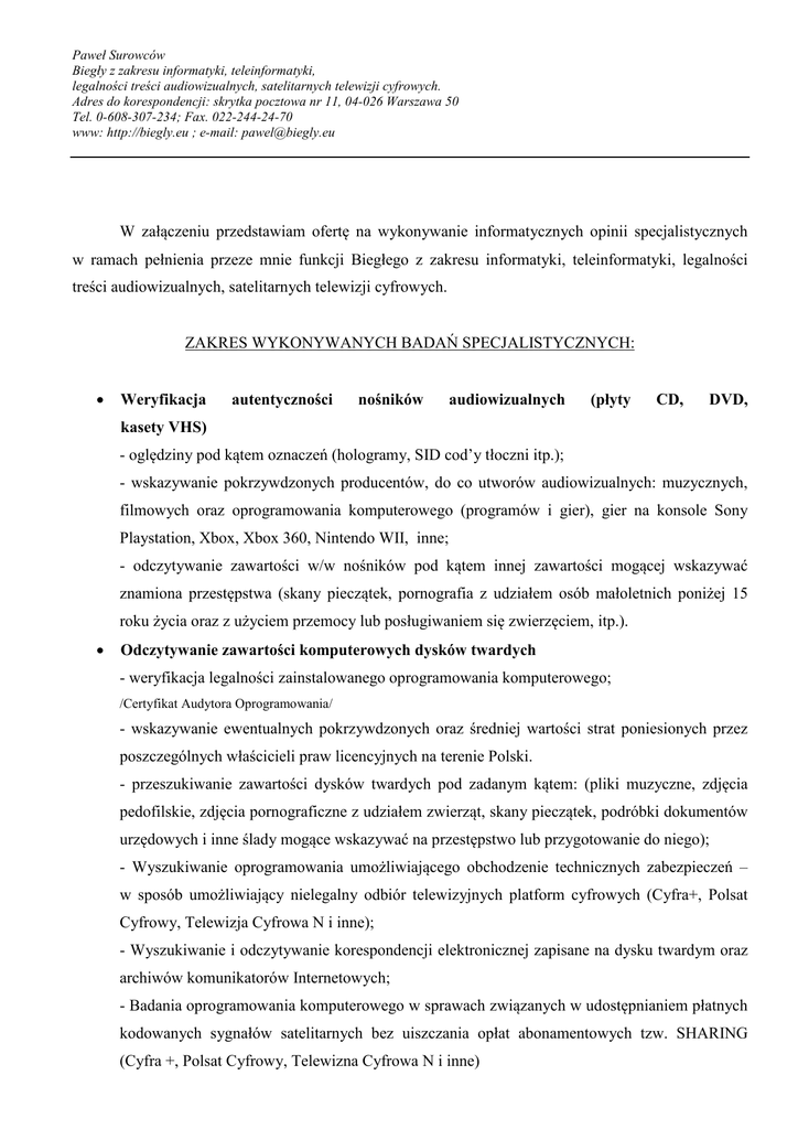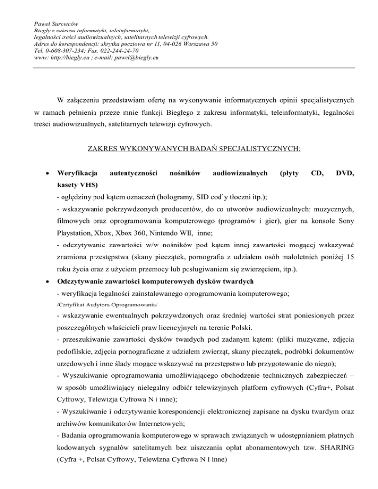 Paweù Surowców Biegùy z zakresu informatyki, teleinformatyki, legalnoœci treœci audiowizualnych, satelitarnych telewizji cyfrowych. Adres do korespondencji: skrytka pocztowa nr 11, 04-026 Warszawa 50 Tel. 0-608-307-234; Fax. 022-244-24-70 www: http://biegly.eu ; e-mail: [email protected] W zaù¹czeniu przedstawiam ofertê na wykonywanie informatycznych opinii specjalistycznych w ramach peùnienia przeze mnie funkcji Biegùego z zakresu informatyki, teleinformatyki, legalnoœci treœci audiowizualnych, satelitarnych telewizji cyfrowych. ZAKRES WYKONYWANYCH BADAÑ SPECJALISTYCZNYCH: Weryfikacja autentycznoœci noœników audiowizualnych (pùyty CD, DVD, kasety VHS) - oglêdziny pod k¹tem oznaczeñ (hologramy, SID cod’y tùoczni itp.); - wskazywanie pokrzywdzonych producentów, do co utworów audiowizualnych: muzycznych, filmowych oraz oprogramowania komputerowego (programów i gier), gier na konsole Sony Playstation, Xbox, Xbox 360, Nintendo WII, inne; - odczytywanie zawartoœci w/w noœników pod k¹tem innej zawartoœci mog¹cej wskazywaã znamiona przestêpstwa (skany piecz¹tek, pornografia z udziaùem osób maùoletnich poni¿ej 15 roku ¿ycia oraz z u¿yciem przemocy lub posùugiwaniem siê zwierzêciem, itp.). Odczytywanie zawartoœci komputerowych dysków twardych - weryfikacja legalnoœci zainstalowanego oprogramowania komputerowego; /Certyfikat Audytora Oprogramowania/ - wskazywanie ewentualnych pokrzywdzonych oraz œredniej wartoœci strat poniesionych przez poszczególnych wùaœcicieli praw licencyjnych na terenie Polski. - przeszukiwanie zawartoœci dysków twardych pod zadanym k¹tem: (pliki muzyczne, zdjêcia pedofilskie, zdjêcia pornograficzne z udziaùem zwierz¹t, skany piecz¹tek, podróbki dokumentów urzêdowych i inne œlady mog¹ce wskazywaã na przestêpstwo lub przygotowanie do niego); - Wyszukiwanie oprogramowania umo¿liwiaj¹cego obchodzenie technicznych zabezpieczeñ – w sposób umo¿liwiaj¹cy nielegalny odbiór telewizyjnych platform cyfrowych (Cyfra+, Polsat Cyfrowy, Telewizja Cyfrowa N i inne); - Wyszukiwanie i odczytywanie korespondencji elektronicznej zapisane na dysku twardym oraz archiwów komunikatorów Internetowych; - Badania oprogramowania komputerowego w sprawach zwi¹zanych w udostêpnianiem pùatnych kodowanych sygnaùów satelitarnych bez uiszczania opùat abonamentowych tzw. SHARING (Cyfra +, Polsat Cyfrowy, Telewizna Cyfrowa N i inne) Odzyskiwanie danych - Odzyskiwanie utraconych/usuniêtych danych z dysków twardych, i wszelkich innych noœników cyfrowych (dyskietki, karty pamiêci, pùyty CD/DVD wielokrotnego zapisu, pamiêci przenoœne /Pendrive/) Badanie urz¹dzeñ elektronicznych - Badania urz¹dzeñ elektronicznych mog¹cych umo¿liwiaã obchodzenie technicznych zabezpieczeñ: (Programatory kart chipowych – telefonia komórkowa, telewizja satelitarna, dekodery cyfrowe do odbioru telewizji satelitarnych); (Sprzêt umo¿liwiaj¹cy odbiór pùatnych kodowanych platform satelitarnych bez uiszczenia opùat abonamentowych tzw. SHARING); - Badania urz¹dzeñ pod k¹tem ich sprawnoœci technicznej – oraz przeznaczenia (np badanie sprzêtu komputerowego pod k¹tem mo¿liwoœci skanowania dokumentów, mo¿liwoœci nagrywania noœników danych /pùyty CD, DVD, dyskietki, kasety VHS itp./, mo¿liwoœci dostêpu do sieci lokalnych lub Internetu) - Odczyty zawartoœci cyfrowych telefonów komórkowych (kontakty, wiadomoœci SMS, pliki filmowe i zdjêciowe itp.) Badanie telefonów komórkowych - Badania kart SIM, odczyt zawartoœci cyfrowej na kartach SIM (kontakty, wiadomoœci SMS, MMS itp.) - Badania telefonów komórkowych - odczyt poù¹czeñ wychodz¹cych i przychodz¹cych, wiadomoœci SMS i MMS, kontaktów, plików audiowizualnych zapisanych w pamiêci telefonów itp. Badania konsol umo¿liwiaj¹cych odtwarzanie gier telewizyjnych - Weryfikacja autentycznoœci gier i konsol platformy Sony Playstation serii 1 i 2, Sony PSP; - Weryfikacja autentycznoœci gier i konsol platformy Xbox, Xbox 360; - Weryfikacja autentycznoœci gier i konsol platformy Nintendo GameBoy Advance Udziaù w czynnoœciach procesowych - Pomoc Funkcjonariuszom Policji podczas wykonywanych czynnoœci sùu¿bowych /przeszukania/ pod k¹tem specjalistycznego zabezpieczania sprzêtu teleinformatycznego; - Dokonywanie wstêpnych oglêdzin sprzêtu teleinformatycznego podczas dziaùañ policyjnych; Zabezpieczanie œladów cyfrowych w sieci Internet - Penetracja sieci Internet pod zadanym k¹tem (wyszukiwanie informacji mog¹cych Wskazywaã na przestêpstwo) - Zabezpieczanie dowodowe materiaùów znajduj¹cych siê w Internecie (zabezpieczanie plików, caùych stron Internetowych itp.) Oglêdziny audiowizualne - Rejestracja foto (cyfrowe) i video (cyfrowe) miejsc przestêpstw oraz zabezpieczanych materiaùów dowodowych. Archiwizacja zgromadzonych materiaùów audiowizualnych na ogólnodostêpnych noœnikach w postaci CD-Video, DVD-Video, VHS i inne. Kopiowanie materiaùów audiowizualnych - Kopiowanie materiaùów audiowizualnych zapisanych na wszelkich noœnikach magnetycznych i cyfrowych na inne noœniki magnetyczne i cyfrowe. Konwertowanie nagrañ Audio/Video - konwertowanie wszelkich nagrañ Audio/Video do z formatów specjalnych do formatów ogólnodostêpnych (nagrania z dyktafonów (cyfrowych i analogowych), telefonów komórkowych, kamer Video, urz¹dzeñ do monitoringu i innych urz¹dzeñ rejestruj¹cych obraz i dêwiêk). Transkrypcje (stenogramy) z nagrañ Audio/Video - Wykonywanie stenogramów nagrañ audio/video odzwierciedlaj¹cych 100% treœci zawartych w nagraniu. Stenogramy wykonywane ze wszelkich noœników oraz wszelkich êródel nagrywaj¹cych takich jak: telefony komórkowe, dyktafony (analogowe, cyfrowe), rozmowy telefoniczne z rejestratorów rozmów, nagrania z kamer video (analogowych i cyfrowych), inne. - Badanie integralnoœci nagrañ audio/video. Informujê równie¿, i¿ materiaùy dowodowe przekazywane mi do badañ zobowi¹zujê siê odb