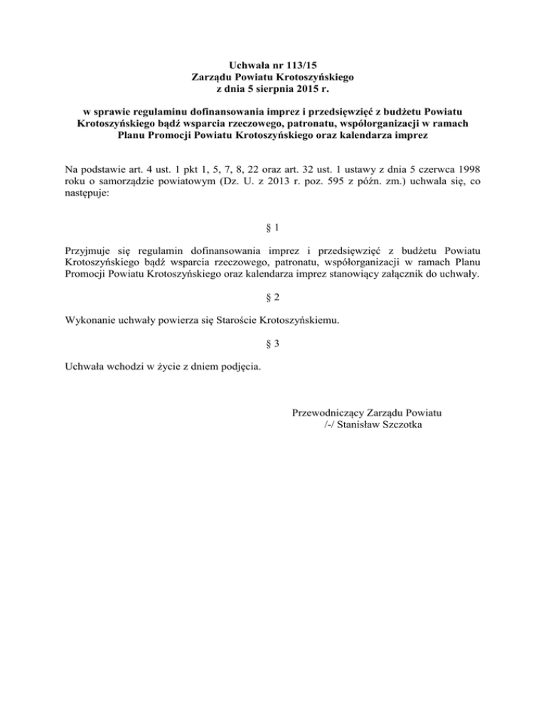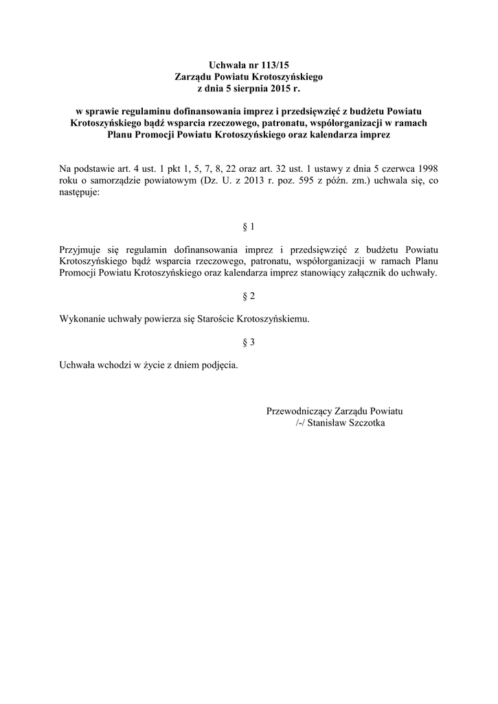 Uchwała nr 113/15 Zarządu Powiatu Krotoszyńskiego z dnia 5