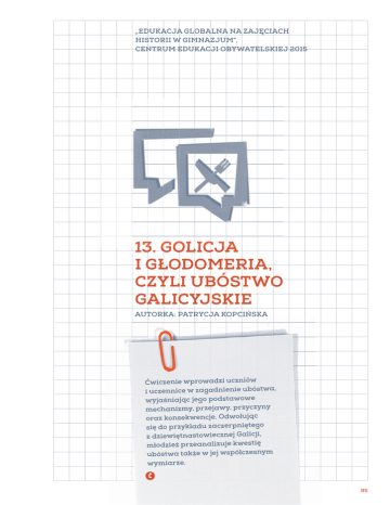 „EDUKACJA GLOBALNA NA ZAJĘCIACH HISTORII W GIMNAZJUM”, CENTRUM EDUKACJI OBYWATELSKIEJ 2015 13. GOLICJA I GŁODOMERIA, CZYLI UBÓSTWO GALICYJSKIE AUTORKA: PATRYCJA KOPCIŃSKA Ćwiczenie wprowadzi uczniów i uczennice w zagadnienie ubóstwa, wyjaśniając jego podstawowe mechanizmy, przejawy, przyczyny oraz konsekwencje. Odwołując się do przykładu zaczerpniętego z dziewiętnastowiecznej Galicji, młodzież przeanalizuje kwestię ubóstwa także w jej współczesnym wymiarze. Õ 85 13. GOLICJA I GŁODOMERIA, CZYLI UBÓSTWO GALICYJSKIE Zagadnienia: Ubóstwo Zdrowie Władza polityczna, demokracja i prawa człowieka Czas trwania: 25 minut Cele ćwiczenia: Podasz przejawy, przyczyny i konsekwencje ubóstwa. Wyjaśnisz, na czym polega złożoność kwestii ubóstwa i co oznacza pojęcie „pętla ubóstwa”. Zastanowisz się nad kwestią ubóstwa w kontekście globalnym. Związek z podstawą programową: I, II, III, 35.3 Środki dydaktyczne i materiały: Załączniki 7 kartek Magnesy min PRZEBIEG ĆWICZENIA: 0 1. Zapytaj młodzież, czy kiedykolwiek słyszała o krainie nazywanej Królestwem Golicji i Głodo- 1 1 merii? Wyjaśnij, że jest to ironiczne określenie Królestwa Galicji i Lodomerii, którym posługiwano się w XIX wieku, obrazując panującą na tych terenach biedę. 6 5 9 3 2. Głośno odczytaj (lub poproś o to ucznia lub uczennicę) fragment tekstu dotyczący dziewiętnastowiecznej Galicji (załącznik nr 1), a następnie poproś klasę, aby jednym słowem określiła panującą tam sytuację. Możesz zadawać pytania pomocnicze, naprowadzając młodzież na pojęcie ubóstwa. 3. Wspólnie z uczniami i uczennicami zastanówcie się, jakie są przejawy ubóstwa, a następnie zaprezentuj plakat z mapą skojarzeń (załącznik nr 2; możesz go wydrukować lub schematycznie narysować na tablicy według podanego wzoru; sam w sobie może być również wykorzystany jako karta pracy). 4.Podziel klasę na 7 zespołów, rozdaj każdemu czystą kartkę i wyjaśnij, że ich zadaniem będzie 22 13 wypisanie skojarzeń – konsekwencji, jakie może przynieść np. brak dostępu do edukacji (grupa 1), niedożywienie (grupa 2) itd. Po 7 minutach poproś, aby przedstawiciele i przedstawicielki poszczególnych grup zaprezentowali swoje skojarzenia i przykleili kartki do plakatu lub przyczepili magnesami do tablicy. Następnie zapytaj, na czym polega złożoność problemu ubóstwa? Dla zobrazowania poproś, aby posłużyli się informacjami z mapy skojarzeń, np. brak pracy powoduje brak pieniędzy, a to uniemożliwia dostęp do edukacji itd. Możesz odwołać się także do materiału dotyczącego ubóstwa z publikacji Edukacja globalna na zajęciach języka polskiego, CEO 2015: „Pomysły zmieniające życie”. 23 1 5. Wyjaśnij, że ubóstwo to złożona kwestia i bardzo często jego przyczyny (np. brak dostępu do edukacji) są równocześnie konsekwencjami (np. brak pracy może wynikać z braku wykształcenia), mamy więc do czynienie z tzw. zjawiskiem pętli ubóstwa. Wytłumacz młodzieży to pojęcie (załącznik nr 3). 6. Podsumuj ćwiczenie. Wyjaśnij, że ludzie od zawsze borykali się z problemem ubóstwa. 25 2 W przeszłości terminem tym określano jedynie skrajny głód, obecnie zaś za granicę ubóstwa przyjmuje się sytuację, w której człowiek żyje za kwotę poniżej 1,25 dolara dziennie. Przyjmując taką definicję ubóstwa, szacuje się, że około 1 miliarda 400 milionów ludzi na świecie żyje w ubóstwie (w tym w Polsce około 2 miliony 800 tys. według danych GUS-u z 2014 roku). Zwróć uwagę, że zarówno w przeszłości, jak i współcześnie za kwestię ubóstwa w znacznym stopniu odpowiada niewłaściwa polityka gospodarcza, choć o ile w przypadku Galicji jest mowa o niskiej produkcji rolnej, o tyle w przypadku ubóstwa współcześnie mają na to wpływ także decyzje podejmowane globalnie – np. zawłaszczanie ziemi w krajach globalnego Południa przez wielkie międzynarodowe koncerny czy polityka rolna Unii Europejskiej. Zwróć również uwagę na inne przyczyny ubóstwa: powolny rozwój gospodarczy państw, brak inwestycji, nienowoczesne metody stosowane w rolnictwie, przeludnienie itp. Załączniki: Załącznik nr 1 – Tekst źródłowy: Fragment tekstu dotyczący XIX-wiecznej Galicji Załącznik nr 2 – Plakat: Mapa skojarzeń: ubóstwo Załącznik nr 3 – Materiał pomocniczy: Pętla ubóstwa 86 13. GOLICJA I GŁODOMERIA, CZYLI UBÓSTWO GALICYJSKIE ZAŁĄCZNIK NR 1 – TEKST ŹRÓDŁOWY FRAGMENT TEKSTU DOTYCZĄCY XIX-WIECZNEJ GALICJI „Jednym z głównych celów działalności każdego społeczeństwa jest zaspakajanie potrzeb materialnych, tzn. dążenie, by ludzie żyli jak najlepiej i jak najdłużej. (…) Przez wiele stuleci zasadniczy problem sprowadzał się do tego, by móc przeżyć do następnego roku. Jeszcze w połowie XIX wieku zdecydowana większość Polaków stale musiała bronić się przed śmiercią spowodowaną głodem lub długim niedożywieniem. W kronikach parafialnych z roku 1847 pisano: W tym roku był straszny i niepamiętny głód, a to z przyczyny, że się ziemniaki nie urodziły. Z plew, pyrzu, otrąb i innych nie do uwierzenia rzeczy chleb ubóstwo piekło i brajki gotowało i z tego wiktu wiele ich, bo 280 umarło. (Parafia Szynwald k/Tarnowa) W 1847 r. nędza do największego stopnia doszła; (…) głód zaczął się już w styczniu; głód zaczął ludziom dokuczać tak, że po kilkoro na dzień z głodu umierali. (…) Gdy to piszę 22 VI w samej wsi Osielec już od N. Roku 203 umarło. (Parafia Osielec k/Myślenic) (…) Redakcja lwowskiego „Tygodnika Rolniczo-Przemysłowego” w swej odezwie z 13 marca 1848 r. pisała: Ratujcie umierających z głodu! (…) Lud nasz w obwodach zachodnich, a mianowicie w wadowickim i sądeckim pada jak muchy, głodem i następnie chorobą wycieńczony (…); w r. już bieżącym, w dwóch miesiącach, tj. w styczniu i lutym umarło tyle, co zwykle w 2 lata. Lata