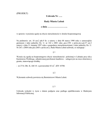 (PROJEKT) Uchwała Nr ….. Rady Miasta Lubań z dnia …………………….. w sprawie: wyrażenia zgody na zbycie nieruchomości w drodze bezprzetargowej Na podstawie: art. 18 ust.2 pkt.9 lit. a ustawy z dnia 08 marca 1990 roku o samorządzie gminnym ( tekst jednolity Dz. U. nr 142 z 2001 roku ,poz.1591 z późn.zm.),art.37 ust.3 ustawy z dnia 21 sierpnia 1997 roku o gospodarce nieruchomościami ( tekst jednolity Dz. U. Nr 261 z 2004 roku poz.2603 z późn.zm.), Rada Miasta Lubań uchwala, co następuje : §1 Wyraża się zgodę na bezprzetargowe zbycie nieruchomości położonej w Lubaniu przy ulicy Kazimierza Wielkiego, zabudowanej pawilonem handlowo – usługowym na rzecz dzierżawcy gruntu, stanowiącego działkę: - nr 27/4, Obr. II, AM 18 o powierzchni 83 m2 , KW 18708. §2 Wykonanie uchwały powierza się Burmistrzowi Miasta Lubań. §3 Uchwała wchodzi w życie z dniem podjęcia oraz podlega opublikowaniu w Biuletynie Informacji Publicznej. UZASADNIENIE W roku 1992 osoba zainteresowana zagospodarowaniem nieruchomości położonej w Lubaniu przy ulicy Kazimierza Wielkiego, stanowiąca działkę geodezyjną nr 27/3, Obr. II, AM 18 wystąpiła z wnioskiem o wydzierżawienie działki z przeznaczeniem na posadowienie pawilonów usługowo-handlowych. W odpowiedzi na wniosek zawarta została umowa dzierżawy pomiędzy Urzędem Miasta Lubań a dzierżawcą terenu . Strony ustaliły, iż umowy mogą być przedłużane na dalszy okres pod warunkiem przedłużenia ważności decyzji o ustaleniu lokalizacji oraz składania oświadczeń woli przez dzierżawcę dokonywanego na piśmie potwierdzającego chęć przedłużenia terminów umowy. Na gruncie tym, dzierżawca wybudował pawilon handlowo – usługowy na podstawie pozwoleń na budowę wydanych w 1991 roku przez Kierownika Urzędu Rejonowego w Lubaniu W latach 1991 – 2004 roku umowy dzierżawy były aktualizowane i na kolejne wnioski dzierżawców przedłużane. W 2004 roku zgodnie z Uchwałą Nr VI/84/2003 Rady Miasta Lubań z dnia 25 lutego 2003 roku w sprawie zasad gospodarowania nieruchomościami stanowiącymi własność Gminy Miejskiej Lubań, wypowiedziano dzierżawcom aktualne umowy dzierżawy i zawarto nowe umowy od dnia 01 marca 2004 roku na czas nieokreślony. W październiku 2006 roku dzierżawca gruntu wystąpił z wnioskiem o bezprzetargową sprzedaż części działki Nr 27/3, zabudowanej pawilonem handlowym. Wniosek o sprzedaż został pozytywnie zaopiniowany przez Wydział Ochrony Środowiska i Gospodarki Przestrzennej, pod względem zgodności z Miejscowym planem Zagospodarowania Przestrzennego . Wykonano podział działki Nr 27/3 (Obręb II, AM 18), w wyniku czego wydzielono działkę w rozmiarze niezbędnym do prawidłowego funkcjonowania posadowionego na niej pawilonu handlowo – usługowego tj. działkę nr 27/4 o powierzchni 83 m2, z przeznaczeniem na zbycie w formie bezprzetargowej na rzecz dzierżawcy.. Zgodnie z art. 37 ust.3 ustawy z dnia 21 sierpnia 1997 roku o gospodarce nieruchomościami (tekst jednolity Dz. U. Nr 261 z 2004 roku poz. 2603, z późn.zm.) grunt, który jest dzierżawiony na podstawie umowy zawartej na okres co najmniej 10 lat, jeżeli nieruchomość ta została zabudowana na podstawie zezwolenia na budowę może być zbyty w drodze bezprzetargowej za zgodą Rady Miasta na rzecz osoby, która ją dzierżawi. Wartość pawilonu handlowo – usługowego przekracza wartość działki i tak: wartość nieruchomości określona przez rzeczoznawcę majątkowego stanowi kwotę: Wartość nieruchomości ogółem stanowi kwotę - 47.320,00 zł.( słownie : czterdzieści siedem tysięcy trzysta dwadzieścia złotych), w tym : - wartość nieruchomości gruntowej (działki Nr 27/4) – 7.150,00 zł - wartość pawilonu handlowo – usługowego - 40.170,00 zł Sprzedaż w/w działki przyczyni się do uporządkowania spraw własnościowych nieruchomości. Przy sprzedaży odliczone zostaną nakłady poniesione przez dzierżawcę na budowę pawilonów.
