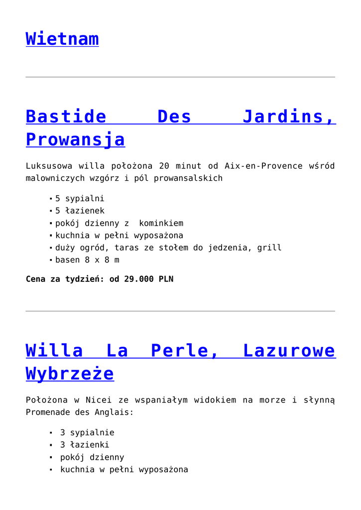 Wietnam Bastide Prowansja Des Jardins, Luksusowa willa położona 20 minut od Aix-en-Provence wśród malowniczych wzgórz i pól prowansalskich 5 sypialni 5 łazienek pokój dzienny z kominkiem kuchnia w pełni wyposażona duży ogród, taras ze stołem do jedzenia, grill basen 8 x 8 m Cena za tydzień: od 29.000 PLN Willa La Wybrzeże Perle, Lazurowe Położona w Nicei ze wspaniałym widokiem na morze i słynną Promenade des Anglais: 3 sypialnie 3 łazienki pokój dzienny kuchnia w pełni wyposażona ogród, taras ze stołem do jedzenia, grill taras z widokiem na morze basen Cena za tydzień: od 25.000 PLN Willa Jade, Lazurowe Wybrzeże Położona pomiędzy St. Tropez i St. Maxime z panoramicznym widokiem na morze: 4 sypialnie 4 łazienki pokój dzienny kuchnia w pełni wyposażona ogród, taras ze stołem do jedzenia, grill basen Cena za 1 tydzień : od 28.000 PLN Słoneczna Prowansja Lazurowe Wybrzeże i Niezwykle malowniczy region Francji, który nieodzownie kojarzy się z obrazami słynnych malarzy, takich jak Cézanne, Matisse, Gauguin, Picasso czy Van Gogh oraz klimatycznymi, średniowiecznymi miasteczkami, jak Arles, Avignon, Orange, Rousillon, Les Baux-de-Provence czy Gordes. Dzięki bliskości Morza Śródziemnego, klimat Prowansji jest łagodny, z gorącym i suchym latem oraz krótką zimą. W Prowansji znajduje się południowa część Alp francuskich z najwyższym szczytem – Pelat (3051 m n.p.m.). Najbardziej znane kurorty Riwiery to: Cannes, Nicea, SaintTropez, Saint-Raphaël, Fréjus, Romatuelle oraz pobliskie Księstwo Monako ze słynnym Monte Carlo. Spektakularne krajobrazy, fioletowe pola lawendowe, orzeźwiające wino rosé, wspaniała kuchnia śródziemnomorska oraz piękne plaże zachęcają do odwiedzenia tego magicznego regionu. Antigua Francja NORTH ISLAND Prywatna, piękna, zielona wyspa, położona 32 km na północ od Mahe, otoczona wspaniała rafą koralową. Można tu podziwiać olbrzymie żółwie, wiele gatunków ptaków oraz kuriozalne palmy kokosowe coco-de-mer, których wielkie orzechy rosną tylko na żeńskich palmach. Wille są wprost na plaży. Otoczone bujną roślinnością, zapewniaą całkowitą prywatność. Elektryczne pojazdy i rowery umożliwiają wyprawy po tej urokliwej wyspie. • 11 przestronnych willi z 2 sypialniami (450m2), • menu codziennie uzgadniane z szefem kuchni, bar, • basen, • sala fitness, nurkowanie, kajaki, wycieczki na pobliskie wyspy, łowienie ryb, • SPA. najlepsza pogoda: marzec – listopad www.north-island.com HOTEL SAINT ANNE RESORT Położony na prywatnej wyspie, 10 minut łodzią od wyspy Mahe, bezpośrednio przy jednym z najwspanialszych parków morskich na Oceanie Indyjskim. Piękne, bezludne plaże, bujna roślinność, tropikalne kwiaty i niezwykle wyrafinowana architektura, tworzą niepowtarzalny klimat romantycznych wakacji. W barze Sans Souci, wieczorem można posłuchać muzyki kameralnej. • 87 ekskluzywnych willi na plaży, w tym 29 z prywatnym basenem, • 4 restauracje, 2 bary, • basen, • sporty wodne niezmotoryzowane, korty tenisowe, rowery górskie, • trekking, wycieczki na inne wyspy, łowienie ryb, • Spa/Clarins. najlepsza pogoda: marzec – maj, wrzesień – grudzień www.beachcomber-hotels.com HOTEL CHATEAU DE FEUILLES Leży na idyllicznej wyspie Praslin, gdzie rosną endemiczne palmy kokosowe, których owoce, uważane za afrodyzjak, osiągają do 20 kg. Ten kameralny hotel jest kwintesencją piękna, elegancji i smaku. • 9 pokoi z widokiem na ocean, • znakomita restauracja, bar, • basen, jacuzzi, sala fitness, SPA, • łowienie ryb, nurkowanie, wycieczki na pobliskie wyspy, wycieczki rowerowe, • pole golfowe w pobliżu. najlepsza pogoda: marzec – maj, wrzesień– grudzień www: www.chateaudefeuilles.com
