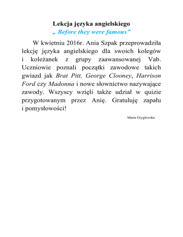 Lekcja języka angielskiego „ Before they were famous” W kwietniu 2016r. Ania Szpak przeprowadziła lekcję języka angielskiego dla swoich kolegów i koleżanek z grupy zaawansowanej Vab. Uczniowie poznali początki zawodowe takich gwiazd jak Brat Pitt, George Clooney, Harrison Ford czy Madonna i nowe słownictwo nazywające zawody. Wszyscy wzięli także udział w quizie przygotowanym przez Anię. Gratuluję zapału i pomysłowości! Marta Gryglewska