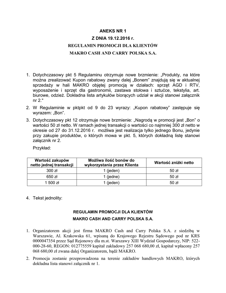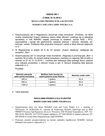 ANEKS NR 1 Z DNIA 19.12.2016 r. REGULAMIN PROMOCJI DLA KLIENTÓW MAKRO CASH AND CARRY POLSKA S.A. 1. Dotychczasowy pkt 5 Regulaminu otrzymuje nowe brzmienie: „Produkty, na które można zrealizować Kupon rabatowy zwany dalej „Bonem” znajdują się w aktualnej sprzedaży w hali MAKRO objętej promocją w działach: sprzęt AGD i RTV, wyposażenie i sprzęt dla gastronomii, zastawa stołowa i sztućce, tekstylia, art. biurowe, odzież. Dokładna lista artykułów biorących udział w akcji stanowi załącznik nr 2." 2. W Regulaminie w pktpkt od 9 do 23 wyrazy: „Kupon rabatowy” zastępuje się wyrazem: „Bon”. 3. Dotychczasowy pkt 12 otrzymuje nowe brzmienie: „Nagrodą w promocji jest „Bon” o wartości 50 zł netto. W ramach jednej transakcji o wartości co najmniej 300 zł netto w okresie od 27 do 31.12.2016 r. możliwa jest realizacja tylko jednego Bonu, jedynie przy zakupie produktów, o których mowa w pkt. 5, których dokładną listę stanowi załącznik nr 2. Przykład: Wartość zakupów netto jednej transakcji 300 zł 650 zł 1 500 zł Możliwa ilość bonów do wykorzystania przez Klienta 1 (jeden) 1 (jedne) 1 (jeden) Wartość zniżki netto 50 zł 50 zł 50 zł 4. Tekst jednolity: REGULAMIN PROMOCJI DLA KLIENTÓW MAKRO CASH AND CARRY POLSKA S.A. 1. Organizatorem akcji jest firma MAKRO Cash and Carry Polska S.A. z siedzibą w Warszawie, Al. Krakowska 61, wpisaną do Krajowego Rejestru Sądowego pod nr KRS 0000047354 przez Sąd Rejonowy dla m.st. Warszawy XIII Wydział Gospodarczy, NIP: 522000-28-60, REGON: 012775559 kapitał zakładowy 257 068 680,00 zł, kapitał wpłacony 257 068 680,00 zł zwana dalej Organizatorem, bądź MAKRO. 2. Promocja zostanie przeprowadzona na terenie zakładów handlowych MAKRO, których dokładna lista stanowi załącznik nr 1. 3. Promocja trwa od 16.12.2016 r. do 31.12.2016 r. lub do wyczerpania puli nagród. 4. Promocja przeznaczona jest wyłącznie dla Klientów MAKRO. Poprzez określenie „Klient” rozumie się podmiot uprawniony do dokonywania zakupów na terenie Hal MAKRO na cele związane z prowadzoną działalnością, nie będący konsumentem. 5. Produkty, na które można zrealizować Kupon rabatowy zwany dalej „Bonem” znajdują się w aktualnej sprzedaży w hali MAKRO objętej promocją w działach: sprzęt AGD i RTV, wyposażenie i sprzęt dla gastronomii, zastawa stołowa i sztućce, tekstylia, art. biurowe, odzież. Dokładna lista artykułów biorących udział w akcji stanowi załącznik nr 2. 6. Promocja nie łączy się z innymi akcjami promocyjnymi w tym z ofertą z gazetki MAKRO. 7. W promocji mogą brać udziału posiadacze kart Pracownik MAKRO. 8. Treść niniejszego regulaminu będzie udostępniona w okresie trwania promocji wszystkim jej potencjalnym uczestnikom w każdej z hal objętych promocją w Punkcie Głównego Kasjera oraz na www.makro.pl. 9. Warunkiem uczestnictwa w promocji jest łączne spełnienie poniższych warunków: a) Dokonanie zakupu w okresie od 16 do 23.12.2016 r. na dowolną kwotę przynajmniej jednego z produktów dostępnych w aktualnej sprzedaży w hali MAKRO objętej promocją, b) Otrzymanie od kasjera Bonu o wartości 50 złotych netto do wykorzystania na kolejne zakupy w okresie od 27 do 31.12.2016 r. na produkty, o których mowa w pkt. 5. 10. Każdy Klient może wziąć udział w promocji, każdorazowo spełniając warunki zawarte w regulaminie, jednakże może otrzymać tylko jeden Bon dziennie. 11. Nagrodę otrzyma każdy Klient, który spełni warunki zawarte w regulaminie. 12. Nagrodą w promocji jest „Bon” o wartości 50 zł netto. W ramach jednej transakcji o wartości co najmniej 300 zł netto w okresie od 27 do 31.12.2016 r. możliwa jest realizacja tylko jednego Bonu, jedynie przy zakupie produktów, o których mowa w pkt. 5, których dokładną listę stanowi załącznik nr 2. Przykład: Wartość zakupów netto jednej transakcji 300 zł 650 zł 1 500 zł Możliwa ilość bonów do wykorzystania przez Klienta 1 (jeden) 1 (jedne) 1 (jeden) Wartość zniżki netto 50 zł 50 zł 50 zł 13. Bon nie podlega wymianie na gotówkę. 14. Bon nie może być zrealizowany, jeśli nosi oznaki fałszerstwa lub zniszczenia (zamazania, kreślenia, klejenia itp.). 15. W przypadku zniszczenia Bonu duplikat nie będzie wydawany. 16. Bon zachowuje ważność w okresie od 27 do 31.12.2016 r i po tej dacie nie może być przedstawiony do realizacji. 17. Wydanie Bonu przez Kasjera nastąpi bezpośrednio po dokonaniu zakupu, o który, mowa w pkt. 9. Bony będą wydawane przez cały okres trwania promocji w kasach na terenie odpowiedniej hali MAKRO biorącej udział w promocji. Odebranie Bonu jest możliwe jedynie w tej hali, w której zostały dokonane zakupy objęte promocją i zgodnie z niniejszym regulaminem. 18. W związku z tym, iż nagroda przypadnie podmiotowi prowadzącemu działalność gospodarczą - osobie fizycznej prowadzącej działalność gospodarczą, osobie prawnej lub jednostce organizacyjnej nie mającej osobowości prawnej - to na niej będzie ciążył obowiązek zapłaty podatku od otrzymanej nagrody. 19. Nadzór nad przebiegiem promocji pełni komisja, w skład, której wejdą: Kierownik Działu Obsługi Klienta odpowiedniej hali MAKRO biorącej udział w Promocji. Dyrektor hali MAKRO biorącej udział w Promocji. 20. Reklamacje dotyczące przebiegu promocji mogą być zgłaszane w ciągu 7 dni od daty zakończenia promocji pod adres odpowiedniej hali MAKRO objętej promocją. 21. Decyzja komisji promocyjnej zostanie przesłana do uczestnika promocji zgłaszającego reklamacje w ciągu 14 dni od daty otrzymania reklamacji. Decyzja komisji jest ostateczna. 22. MAKRO Cash And Carry Polska S.A. ponosi pełną odpowiedzialność za treść regulaminu, przebieg promocji, wydanie nagród oraz ewentualne reklamacje. 23. Organizator zastrzega sobie prawo do wprowadzania zmian w regulaminie w formie pisemnej stosownym aneksem oraz ogłoszenia ich. Załącznik nr 1. List