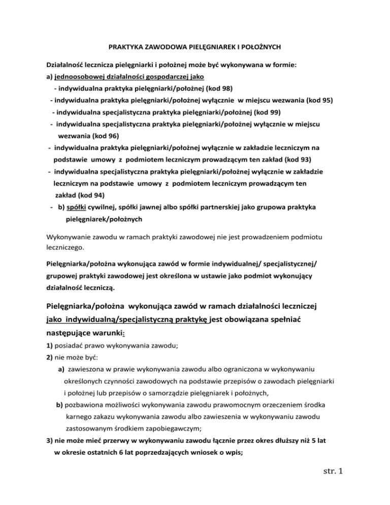 PRAKTYKA ZAWODOWA PIELĘGNIAREK I POŁOŻNYCH Działalność lecznicza pielęgniarki i położnej może być wykonywana w formie: a) jednoosobowej działalności gospodarczej jako - indywidualna praktyka pielęgniarki/położnej (kod 98) - indywidualna praktyka pielęgniarki/położnej wyłącznie w miejscu wezwania (kod 95) - indywidualna specjalistyczna praktyka pielęgniarki/położnej (kod 99) - indywidualna specjalistyczna praktyka pielęgniarki/położnej wyłącznie w miejscu wezwania (kod 96) - indywidualna praktyka pielęgniarki/położnej wyłącznie w zakładzie leczniczym na podstawie umowy z podmiotem leczniczym prowadzącym ten zakład (kod 93) - indywidualna specjalistyczna praktyka pielęgniarki/położnej wyłącznie w zakładzie leczniczym na podstawie umowy z podmiotem leczniczym prowadzącym ten zakład (kod 94) - b) spółki cywilnej, spółki jawnej albo spółki partnerskiej jako grupowa praktyka pielęgniarek/położnych Wykonywanie zawodu w ramach praktyki zawodowej nie jest prowadzeniem podmiotu leczniczego. Pielęgniarka/położna wykonująca zawód w formie indywidualnej/ specjalistycznej/ grupowej praktyki zawodowej jest określona w ustawie jako podmiot wykonujący działalność leczniczą. Pielęgniarka/położna wykonująca zawód w ramach działalności leczniczej jako indywidualną/specjalistyczną praktykę jest obowiązana spełniać następujące warunki: 1) posiadać prawo wykonywania zawodu; 2) nie może być: a) zawieszona w prawie wykonywania zawodu albo ograniczona w wykonywaniu określonych czynności zawodowych na podstawie przepisów o zawodach pielęgniarki i położnej lub przepisów o samorządzie pielęgniarek i położnych, b) pozbawiona możliwości wykonywania zawodu prawomocnym orzeczeniem środka karnego zakazu wykonywania zawodu albo zawieszenia w wykonywaniu zawodu zastosowanym środkiem zapobiegawczym; 3) nie może mieć przerwy w wykonywaniu zawodu łącznie przez okres dłuższy niż 5 lat w okresie ostatnich 6 lat poprzedzających wniosek o wpis; str. 1 4) dysponować pomieszczeniem odpowiadającym wymaganiom określonym w art. 22, wyposażonym w aparaturę i sprzęt medyczny zgodnie z Ustawą z dnia 15 kwietnia 2011 r. (Dz. U. 2015.618 z dnia 2015.05.06); 5) uzyskać wpis do Centralnej Ewidencji i Informacji o Działalności Gospodarczej; 6) zawrzeć umowę ubezpieczenia odpowiedzialności cywilnej w zakresie określonym w art. 25 ust. 1 pkt 1 zgodnie z Ustawą z dnia 15 kwietnia 2011 r. (Dz. U. 2015.618 z dnia 2015.05.06); 7) w przypadku indywidualnej specjalistycznej praktyki posiadać specjalizację w dziedzinie pielęgniarstwa lub położnictwa lub innej dziedzinie mającej zastosowanie w ochronie zdrowia. 8) posiadać sprzęt medyczny umożliwiający udzielanie określonych świadczeń zdrowotnych w miejscu zamieszkania lub pobytu pacjenta [w miejscu wezwania]; 9) wskazać adres praktyki oraz adres miejsca przechowywania dokumentacji medycznej [w miejscu wezwania] Pielęgniarka/położna wykonująca zawód w ramach działalności leczniczej jako grupowa praktyka jest obowiązana spełniać następujące warunki: [pielęgniarki/położne muszą być wspólnikami lub partnerami spółki] 1) posiadać prawo wykonywania zawodu; 2) nie może być: a) zawieszona w prawie wykonywania zawodu albo ograniczona w wykonywaniu określonych czynności zawodowych na podstawie przepisów o zawodach pielęgniarki i położnej lub przepisów o samorządzie pielęgniarek i położnych, b) pozbawiona możliwości wykonywania zawodu prawomocnym orzeczeniem środka karnego zakazu wykonywania zawodu albo zawieszenia w wykonywaniu zawodu zastosowanym środkiem zapobiegawczym; 3) nie może mieć przerwy w wykonywaniu zawodu łącznie przez okres dłuższy niż 5 lat w okresie ostatnich 6 lat poprzedzających wniosek o wpis; 4) dysponować pomieszczeniem odpowiadającym wymaganiom określonym w art. 22, wyposażonym w aparaturę i sprzęt medyczny zgodnie z Ustawą z dnia 15 kwietnia 2011 r. (Dz. U. 2015.618 z dnia 2015.05.06); 5) zawrzeć umowę ubezpieczenia odpowiedzialności cywilnej w zakresie określonym w art. 25 ust. 1 pkt 1 Ustawy z dnia 15 kwietnia 2011 r. o działalności leczniczej (Dz. U. 2015.618 z dnia 2015.05.06); 6) uzyskać wpis do Centralnej Ewidencji i Informacji o działalności Gospodarczej lub wpis do KRS (w zależności od rodzaju spółki); str. 2 Ustawa o działalności leczniczej wprowadziła nowy typ praktyki – INDYWIDUALNĄ PRAKTYKĘ PIELĘGNIARKI/POŁOŻNEJ W ZAKŁADZIE LECZNICZYM NA PODSTAWIE UMOWY Z PODMIOTEM LECZNICZYM PROWADZĄCYM TEN ZAKŁAD. Pielęgniarka/położna prowadząc taką praktykę musi spełniać następujące warunki: 1) posiadać prawo wykonywania zawodu; 2) nie może być: a) zawieszona w prawie wykonywania zawodu albo ograniczona w wykonywaniu określonych czynności zawodowych na podstawie przepisów o zawodach pielęgniarki i położnej lub przepisów o samorządzie pielęgniarek i położnych, b) pozbawiona możliwości wykonywania zawodu prawomocnym orzeczeniem środka karnego zakazu wykonywania zawodu albo zawieszenia w wykonywaniu zawodu zastosowanym środkiem zapobiegawczym; 3) nie może mieć przerwy w wykonywaniu zawodu łącznie przez okres dłuższy niż 5 lat w okresie ostatnich 6 lat poprzedzających wniosek o wpis; 4) uzyskać wpis do Centralnej Ewidencji i Informacji o Działalności Gospodarczej; 5) zawrzeć umowę ubezpieczenia odpowiedzialności cywilnej 6) w przypadku specjalistycznej praktyki posiadać specjalizację w dziedzinie pielęgniarstwa lub położnictwa lub innej dziedzinie mającej zastosowanie w ochronie zdrowia. Wykonując praktykę wyłącznie w zakładzie leczniczym na podstawie umowy z podmiotem leczniczym prowadzącym ten zakład nie można wykonywać działalności poza miejscem określonym dla przedsiębiorstwa. Działalność leczniczą w formie indywidualnej/specjalistycznej/grupowej praktyki pielęgniarki/położnej można rozpocząć po uzyskaniu wpisu 
