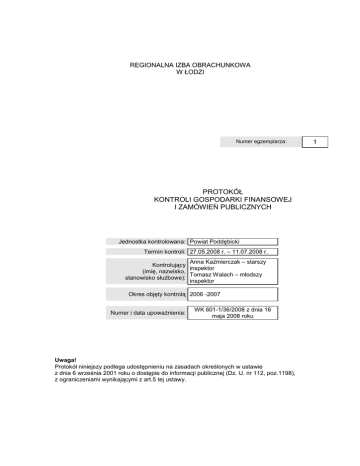 REGIONALNA IZBA OBRACHUNKOWA W ŁODZI Numer egzemplarza: PROTOKÓŁ KONTROLI GOSPODARKI FINANSOWEJ I ZAMÓWIEŃ PUBLICZNYCH Jednostka kontrolowana: Powiat Poddębicki Termin kontroli: 27.05.2008 r. – 11.07.2008 r. Anna Kaźmierczak – starszy Kontrolujący inspektor (imię, nazwisko, Tomasz Walach – młodszy stanowisko słuŜbowe): inspektor Okres objęty kontrolą 2006 -2007 Numer i data upowaŜnienia: WK 601-1/36/2008 z dnia 16 maja 2008 roku Uwaga! Protokół niniejszy podlega udostępnieniu na zasadach określonych w ustawie z dnia 6 września 2001 roku o dostępie do informacji publicznej (Dz. U. nr 112, poz.1198), z ograniczeniami wynikającymi z art.5 tej ustawy. 1 PROTOKÓŁ Z KONTROLI KOMPLEKSOWEJ PRZEPROWADZONEJ W POWIECIE PODDĘBICKIM Regionalna Izba Obrachunkowa w Łodzi, ul. Zamenhofa 10 90-431 Łódź, tel. (0-42) 6366896, fax (0-42) 6367424 I. INFORMACJE WSTĘPNE DANE O JEDNOSTCE Powiat Poddębicki połoŜony jest w zachodniej części Województwa Łódzkiego. Obejmuje obszar o powierzchni 881,3 km 2. W skład Powiatu wchodzi 6 gmin: Dalików, Pęczniew, Poddębice, Uniejów, Wartkowice, Zadzim. Siedziba Starostwa Powiatowego w Poddębicach mieści się przy ul. Łęczyckiej 16. Powiat Poddębicki według Rocznika Statystycznego Województwa Łódzkiego, w 2006 roku liczył 42.359 mieszkańców, natomiast w 2007 roku liczył 42.192 mieszkańców. Stopień bezrobocia według Rocznika Statystycznego Województwa Łódzkiego wynosił w 2006 roku - 16,3% (3.244 bezrobotnych w tym 299 osób z prawem do zasiłku), natomiast w 2007 roku wynosił 16% (3.059 bezrobotnych w tym 470 z prawem do zasiłku). Na podstawie zaświadczenia o numerze identyfikacyjnym z dnia 8 grudnia 1998 roku Starostwo Powiatowe w Poddębicach otrzymało numer identyfikacyjny REGON 730934878. Na podstawie decyzji z dnia 21 stycznia 1999 roku Starostwo Powiatowe w Poddębicach otrzymało numer identyfikacji podatkowej NIP 828-12-41-371. Przeprowadzona kontrola ma charakter kompleksowej kontroli gospodarki finansowej i zamówień publicznych. II. USTALENIA OGÓLNE KIEROWNICTWO JEDNOSTKI Przewodniczący rady powiatu Przewodniczącym Rady Powiatu w Poddębicach jest WOJCIECH KABACIŃSKI wybrany na Przewodniczącego Rady Powiatu na podstawie uchwały nr I/3/06 Rady Powiatu w Poddębicach z dnia 23 listopada 2006 roku. Wiceprzewodniczącymi Rady Powiatu w Poddębicach są: JANINA PUCEK I PIOTR JUSZCZAK, wybrani na podstawie uchwały I/5/06 Rady Powiatu w Poddębicach z dnia 23 listopada 2006 roku. Starosta i pozostali członkowie zarządu powiatu Uchwałą nr II/8/06 Rady Powiatu w Poddębicach z dnia 23 listopada 2006 roku stwierdzono wybór Starosty Poddębickiego w osobie PIOTRA POLAKA. Wicestarostą została DANUTA PECYNA wybrana na mocy uchwały nr II/10/06 Rady Powiatu w Poddębicach z dnia 23 listopada 2006 roku. Uchwałą nr II/12/06 Rady Powiatu w Poddębicach z dnia 23 listopada 2006 roku stwierdzono wybór członków Zarządu Powiatu Poddębickiego innych niŜ Starosta i Wicestarosta, w osobach: RYSZARDA BALCERZAKA, SEWERYNY DUDCZAK, MAŁGORZATY KOMAJDY. Na mocy uchwały nr V/31/07 Rady Powiatu w Poddębicach z dnia 2 lutego 2007 roku odwołany został ze stanowiska Starosty Poddębickiego Piotr Polak oraz pozostali członkowie Zarządu Powiatu. _____________________________________________________ 2 PROTOKÓŁ Z KONTROLI KOMPLEKSOWEJ PRZEPROWADZONEJ W POWIECIE PODDĘBICKIM Regionalna Izba Obrachunkowa w Łodzi, ul. Zamenhofa 10 90-431 Łódź, tel. (0-42) 6366896, fax (0-42) 6367424 Uchwałą nr V/33/07 Rady Powiatu w Poddębicach z dnia 2 lutego 2007 roku stwierdzono wybór Starosty Poddębickiego w osobie PIOTRA POLAKA. Uchwałą nr V/35/07 Rady Powiatu Poddębickiego z dnia 2 lutego 2007 roku stwierdzono wybór Wicestarosty Poddębickiego w osobie DANUTY PECYNY. Uchwałą nr V/37/07 Rady Powiatu w Poddębicach z dnia 2 lutego 2007 roku stwierdzono wybór członków Zarządu Powiatu Poddębickiego innych niŜ Starosta i Wicestarosta w osobach: RYSZARDA BALCERZAKA, SEWERYNY DUDCZAK, MAŁGORZATY KOMAJDY. Uchwałą nr XV/84/07 Rady Powiatu w Poddębicach z dnia 31 października 2007 roku przyjęto rezygnację członków Zarządu Powiatu w Poddębicach. Uchwałą nr XV/86/07 Rady Powiatu w Poddębicach z dnia 31 października 2007 roku stwierdzono wybór Starosty Poddębickiego w osobie STANISŁAWA OLASA. Uchwałą nr XV/88/07 Rady Powiatu w Poddębicach z dnia 31 października 2007 roku stwierdzono wybór DANUTY PECYNY na Wicestarostę Poddębickiego. Uchwałą nr XV/90/07 Rady Powiatu w Poddębicach z dnia 31 października 2007 roku stwierdzono wybór członków Zarządu Powiatu Poddębickiego innych niŜ Starosta i Wicestarosta w osobach: RYSZARDA BALCERZAKA, WIEŃCZYSŁAWA KAŹMIERCZAKA, MAŁGORZATY KOMAJDY. Skarbnik powiatu Uchwałą nr III/17/98 Rady Powiatu Poddębickiego z dnia 29 grudnia 1998 roku na Skarbnika Powiatu powołany został JAN SKÓRKA. Sekretarz powiatu Sekretarzem Powiatu jest IRENA MAŁKIEWICZ, powołana na stanowisko na podstawie uchwały nr VII/35/03 Rady Powiatu Poddębickiego z dnia 16 kwietnia 2003 roku. POWIATOWE JEDNOSTKI ORGANIZACYJNE I PRAWNOORGANIZACYJNE FORMY ICH DZIAŁALNOŚCI W okresie objętym kontrolą na terenie Powiatu w Poddębicach działały następujące jednostki organizacyjne: 1. Jednostki budŜetowe: - Starostwo Powiatowe, - Powiatowy Urząd Pracy w Poddębicach, - Powiatowe Centrum Pomocy Rodzinie, - Liceum Ogólnokształcące im. Marii Konopnickiej w Poddębicach, - Zespół Szkół Ponadgimnazjalnych w Poddębicach, - Szkoła Muzyczna I stopnia w Uniejowie, - Poradnia Psychologiczna - Pedagogiczna w Poddębicach, - Powiatowy Inspektorat Nadzoru Budowlanego, - Dom Pomocy Społecznej w Gostkowie, - Powiatowy Środowiskowy Dom Samopomocy w Pęczniewie, _____________________________________________________ 3 PROTOKÓŁ Z KONTROLI KOMPLEKSOWEJ PRZEPROWADZONEJ W POWIECIE PODDĘBICKIM Regionalna Izba Obrachunkowa w Łodzi, ul. Zamenhofa 10 90-431 Łódź