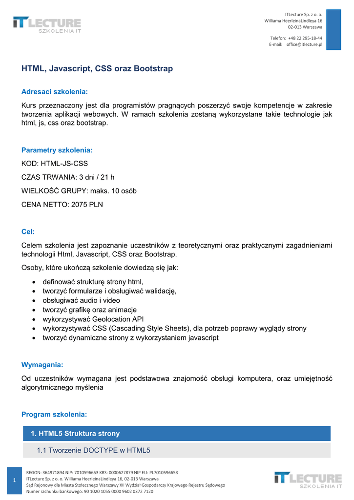 ITLecture Sp. z o. o. Williama HeerleinaLindleya 16 02-013 Warszawa Telefon: +48 22 295-18-44 E-mail: [email protected] HTML, Javascript, CSS oraz Bootstrap Adresaci szkolenia: Kurs przeznaczony jest dla programistów pragnących poszerzyć swoje kompetencje w zakresie tworzenia aplikacji webowych. W ramach szkolenia zostaną wykorzystane takie technologie jak html, js, css oraz bootstrap. Parametry szkolenia: KOD: HTML-JS-CSS CZAS TRWANIA: 3 dni / 21 h WIELKOŚĆ GRUPY: maks. 10 osób CENA NETTO: 2075 PLN Cel: Celem szkolenia jest zapoznanie uczestników z teoretycznymi oraz praktycznymi zagadnieniami technologii Html, Javascript, CSS oraz Bootstrap. Osoby, które ukończą szkolenie dowiedzą się jak: definować strukturę strony html, tworzyć formularze i obsługiwać walidację, obsługiwać audio i video tworzyć grafikę oraz animacje wykorzystywać Geolocation API wykorzystywać CSS (Cascading Style Sheets), dla potrzeb poprawy wyglądy strony tworzyć dynamiczne strony z wykorzystaniem javascript Wymagania: Od uczestników wymagana jest podstawowa znajomość obsługi komputera, oraz umiejętność algorytmicznego myślenia Program szkolenia: 1. HTML5 Struktura strony 1.1 Tworzenie DOCTYPE w HTML5 1 REGON: 364971894 NIP: 7010596653 KRS: 0000627879 NIP EU: PL7010596653 ITLecture Sp. z o. o. Williama HeerleinaLindleya 16, 02-013 Warszawa Sąd Rejonowy dla Miasta Stołecznego Warszawy XII Wydział Gospodarczy Krajowego Rejestru Sądowego Numer rachunku bankowego: 90 1020 1055 0000 9602 0372 7120 ITLecture Sp. z o. o. Williama HeerleinaLindleya 16 02-013 Warszawa Telefon: +48 22 295-18-44 E-mail: [email protected] 1.2 Utworzenie deklaracji strony kodowej 1.3 Podział dokumentu na sekcje 1.4 Tworzenie poszczególnych części dokumentu 1.5 Tworzenie aside 1.6 Tworzenie header 1.7 Grupowanie elementów od <h1> do <h6> 1.8 Tworzenie stopki 1.9 Tworzenie nawigacji w dokumencie 1.10 kompatybilność przeglądarki 1.11 Wykorzystanie tagu <hr> w HTML5 1.12 Wykorzystanie tagu <iFrame> 1.13 Wykorzystanie tagu <area> 2. HTML5 Formularze 2.1. Zrozumienie input types 2.2. Wykorzystanie e-mail input type 2.3. Zastosowanie URL input type 2.4. Walidacja elementów formularza 2.5. Ustawienie placeholder w input type 2.6. Obsługa daty oraz czasu 3. HTML5 Audio oraz Video 3.1. Osadzanie video na stronie 3.2. Rozpoznawanie wsparcia video dla różnych przeglądarek 3.3. Tworzenie własnych video kontrolerów 2 REGON: 364971894 NIP: 7010596653 KRS: 0000627879 NIP EU: PL7010596653 ITLecture Sp. z o. o. Williama HeerleinaLindleya 16, 02-013 Warszawa Sąd Rejonowy dla Miasta Stołecznego Warszawy XII Wydział Gospodarczy Krajowego Rejestru Sądowego Numer rachunku bankowego: 90 1020 1055 0000 9602 0372 7120 ITLecture Sp. z o. o. Williama HeerleinaLindleya 16 02-013 Warszawa Telefon: +48 22 295-18-44 E-mail: [email protected] 3.4. Preloading a video 3.5. Wykorzystanie elementu audio 4. HTML5 Rysowanie i animacje 4.1. Zrozumienie API Canvas 4.2. Rysowanie z wykorzystaniem canvas API 4.3. Wykorzystanie ścieżek i współrzędnych 4.4. Rysowanie kształtów: prostokątów i okręgów 5. HTML5 Lokalny schowek 5.1. Sprawdzenie wsparcia dla różnych przeglądarek 5.2. Wykorzystanie ApplicationCache object 5.3. Zdarzenia typu ApplicationCache 6. HTML5 Geolokalizacja API 6.1. Zrozumienie Geolokalizacji API 6.2. Wykorzystanie obiektu navigator 6.3. Użycie obiektu position 6.4. Śledzenie współrzędnych użytkownika 7. CSS - Rozmieszczenie na stronie 7.1. Rozmieszczenie w web-ie 7.1.1. Grids and boxes 7.1.2. Praca z kolumnami 7.1.3. Projektowanie typu Fixed vs. liquid 7.1.4. Technologia rozmieszczania: Tables vs. CSS 7.1.5. Logiczne umieszczenie elementów 3 REGON: 364971894 NIP: 7010596653 KRS: 0000627879 NIP EU: PL7010596653 ITLecture Sp. z o. o. Williama HeerleinaLindleya 16, 02-013 Warszawa Sąd Rejonowy dla Miasta Stołecznego Warszawy XII Wydział Gospodarczy Krajowego Rejestru Sądowego Numer rachunku bankowego: 90 1020 1055 0000 9602 0372 7120 ITLecture Sp. z o. o. Williama HeerleinaLindleya 16 02-013 Warszawa Telefon: +48 22 295-18-44 E-mail: [email protected] 7.2. Workflow w layout CSS 7.2.1. Anatomia layout: Tables vs. CSS 7.2.2. Tworzenie struktury strony 7.2.3. Formatowanie box 7.3. CSS layouts: Pojedyńczy box 7.3.1. Tworzenie fixed-width wrapper 7.3.2. Dodanie padding, margins, and backgrounds do layout-u 7.3.3. Tworzenie maximum-width layout 7.3.4. Bezwzględne pozycjonowanie, żeby umieścić box w centrum 7.4. Zagnieżdżone boxes: Boxouts 7.4.1. The float property 7.4.2. Tworzenie boxout 7.5. Zaawansowane layouts z wieloma box-ami oraz columnami 7.5.1. Praca z podwójnie strukturalnymi div-ami 7.5.1.1. Manipulowanie dla fixed-width layouts 7.5.1.2. Manipulowanie dla liquid layouts 7.5.2. Operations 7.5.2.1. Umieszczenie kolumn wewnątrz wrapper 7.5.2.2. Czyszczenie floated content 7.5.3. Praca z sidebars oraz multiple boxouts 7.5.3.1. Tworzenie sidebar z faux-column backgrounds 7.5.3.2. Tworzenie wielu boxouts wewnątrz sidebar 7.5.4. Tworzenie flanking sidebars 4 REGON: 364971894 NIP: 7010596653 KRS: 0000627879 NIP EU: PL7010596653 ITLecture Sp. z o. o. Williama HeerleinaLindleya 16, 02-013 Warszawa Sąd Rejonowy dla Miasta Stołecznego Warszawy XII Wydział Gospodarczy Krajowego Rejestru Sądowego Numer rachunku bankowego: 90 1020 1055 0000 9602 0372 7120 ITLecture Sp. z o. o. Williama HeerleinaLindleya 16 02-013 Warszawa Telefon: +48 22 295-18-44 E-mail: [email protected] 7.5.5. Automatyczne layout variations 7.5.5.1. Wykorzystanie body class, żeby zautomatyzować page layouts 7.6. Obszary typu scrollable 7.6.1. Praca z frames 7.6.2. Praca z wewnętrznymi frames (iframes) 7.6.3. Przewijalny obszar CSS 7.7. Bootstrap 7.7.1. Co to jest bootstrap ? 7.7.2. Konfiguracja 7.7.3. Główne reguły 7.7.4. Proste przykłady 8. JS - Język javascript 8.1. Wprowadzenie 8.1.1. JavaScript vs ECMAScript 8.1.2. Specyfika języka 8.2. Składnia 8.2.1. Przegląd składni 8.2.2. Statements vs Expressions 8