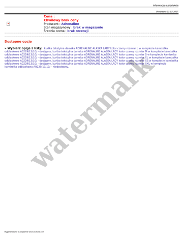 Informacje o produkcie Utworzono 01-03-2017 Cena : Chwilowy brak ceny Producent : Adrenaline Stan magazynowy : brak w magazynie Średnia ocena : brak recenzji Dostępne opcje » Wybierz opcje z listy: kurtka tekstylna damska ADRENALINE ALASKA LADY kolor czarny rozmiar L w komplecie kamizelka w at er m ar k odblaskowa A0229/13/10/ - dostępny, kurtka tekstylna damska ADRENALINE ALASKA LADY kolor czarny rozmiar M w komplecie kamizelka odblaskowa A0229/13/10/ - dostępny, kurtka tekstylna damska ADRENALINE ALASKA LADY kolor czarny rozmiar S w komplecie kamizelka odblaskowa A0229/13/10/ - dostępny, kurtka tekstylna damska ADRENALINE ALASKA LADY kolor czarny rozmiar XL w komplecie kamizelka odblaskowa A0229/13/10/ - dostępny, kurtka tekstylna damska ADRENALINE ALASKA LADY kolor czarny rozmiar XS w komplecie kamizelka odblaskowa A0229/13/10/ - dostępny, kurtka tekstylna damska ADRENALINE ALASKA LADY kolor czarny rozmiar XXL w komplecie kamizelka odblaskowa A0229/13/10/ - niedostępny. Wygenerowano w programie www.oscGold.com