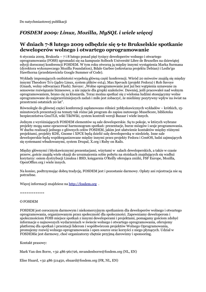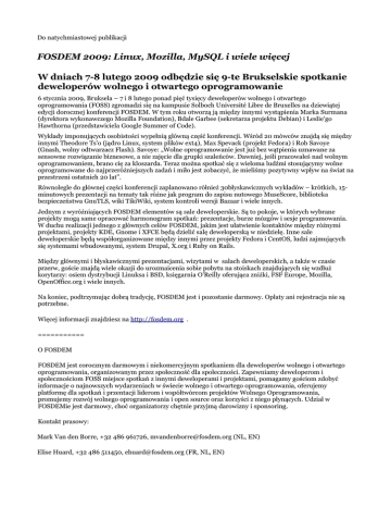 Do natychmiastowej publikacji FOSDEM 2009: Linux, Mozilla, MySQL i wiele więcej W dniach 7-8 lutego 2009 odbędzie się 9-te Brukselskie spotkanie deweloperów wolnego i otwartego oprogramowanie 6 stycznia 2009, Bruksela – 7 i 8 lutego ponad pięć tysięcy deweloperów wolnego i otwartego oprogramowania (FOSS) zgromadzi się na kampusie Solboch Université Libre de Bruxelles na dziewiątej edycji dorocznej konferencji FOSDEM. W tym roku otworzą ją między innymi wystąpienia Marka Surmana (dyrektora wykonawczego Mozilla Foundation), Bdale Garbee (sekretarza projektu Debian) i Leslie'go Hawthorna (przedstawiciela Google Summer of Code). Wykłady imponujących osobistości wypełnią główną część konferencji. Wśród 20 mówców znajdą się między innymi Theodore Ts'o (jądro Linux, system plików ext4), Max Spevack (projekt Fedora) i Rob Savoye (Gnash, wolny odtwarzacz Flash). Savoye: „Wolne oprogramowanie jest już bez wątpienia uznawane za sensowne rozwiązanie biznesowe, a nie zajęcie dla grupki szaleńców. Dawniej, jeśli pracowałeś nad wolnym oprogramowaniem, brano cię za kloszarda. Teraz można spotkać się z wieloma ludźmi stosującymy wolne oprogramowane do najprzeróżniejszych zadań i miło jest zobaczyć, że mieliśmy pozytywny wpływ na świat na przestrzeni ostatnich 20 lat”. Równolegle do głównej części konferencji zaplanowano rółnież 30błyskawicznych wykładów – krótkich, 15minutowych prezentacji na tematy tak różne jak program do zapisu nutowego MuseScore, biblioteka bezpieczeństwa GnuTLS, wiki TikiWiki, system kontroli wersji Bazaar i wiele innych. Jednym z wyróżniających FOSDEM elementów są sale deweloperskie. Są to pokoje, w których wybrane projekty mogą same opracować harmonogram spotkań: prezentacje, burze mózgów i sesje programowania. W duchu realizacji jednego z głównych celów FOSDEM, jakim jest ułatwienie kontaktów między różnymi projektami, projekty KDE, Gnome i XFCE będą dzielić salę deweloperską w niedzielę. Inne sale deweloperskie będą współorganizowane między innymi przez projekty Fedora i CentOS, ludzi zajmujących się systemami wbudowanymi, system Drupal, X.org i Ruby on Rails. Między głównymi i błyskawicznymi prezentacjami, wizytami w salach deweloperskich, a także w czasie przerw, goście znajdą wiele okazji do urozmaicenia sobie pobytu na stoiskach znajdujących się wzdłuż korytarzy: osiem dystrybucji Linuksa i BSD, księgarnia O'Reilly oferująca zniżki, FSF Europe, Mozilla, OpenOffice.org i wiele innych. Na koniec, podtrzymując dobrą tradycję, FOSDEM jest i pozostanie darmowy. Opłaty ani rejestracja nie są potrzebne. Więcej informacji znajdziesz na http://fosdem.org . =========== O FOSDEM FOSDEM jest corocznym darmowym i niekomercyjnym spotkaniem dla deweloperów wolnego i otwartego oprogramowania, organizowanym przez społeczność dla społeczności. Zapewniamy deweloperom i społecznościom FOSS miejsce spotkań z innymi deweloperami i projektami, pomagamy gościom zdobyć informacje o najnowszych wydarzeniach w świecie wolnego i otwartego oprogramowania, oferujemy platformę dla spotkań i przentacji liderom i współtwórcom projektów Wolnego Oprogramowania, promujemy rozwój wolnego oprogramowania i open source oraz korzyści z niego płynących. Udział w FOSDEMie jest darmowy, choć organizatorzy chętnie przyjmą darowizny i sponsoring. Kontakt prasowy: Mark Van den Borre, +32 486 961726, [email protected] (NL, EN) Elise Huard, +32 486 511450, [email protected] (FR, NL, EN)
