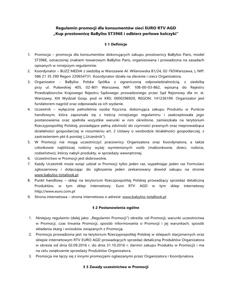 Regulamin promocji dla konsumentów sieci EURO RTV AGD „Kup prostownicę BaByliss ST396E i odbierz perłowe kolczyki” § 1 Definicje 1. Promocja – promocja dla konsumentów dokonujących zakupu prostownicy BaByliss Paris, model ST396E, oznaczonej znakiem towarowym BaByliss Paris, organizowana i prowadzona na zasadach opisanych w niniejszym regulaminie. 2. Koordynator – BUZZ MEDIA z siedzibą w Warszawie Al. Wilanowska 81/24, 02-765Warszawa, ), NIP: 586 21 35 290 Regon 220654731. Koordynator działa na zlecenie i rzecz Organizatora. 3. Organizator - BaByliss Polska Spółka z ograniczoną odpowiedzialnością, z siedzibą przy ul. Puławskiej 405, 02-801 Warszawa, NIP: 108-00-03-862, wpisaną do Rejestru Przedsiębiorców Krajowego Rejestru Sądowego prowadzonego przez Sąd Rejonowy dla m. st. Warszawy, XIII Wydział Gosp. pod nr KRS: 0000296920, REGON: 141236199. Organizator jest fundatorem nagród oraz odpowiada za ich wydanie. 4. Uczestnik – wyłącznie pełnoletnia osoba fizyczna, dokonująca zakupu Produktu w Punkcie handlowym, która zapoznała się z treścią niniejszego regulaminu i zaakceptowała jego postanowienia oraz spełniła wszystkie warunki w nim określone, zamieszkała na terytorium Rzeczypospolitej Polskiej, posiadające pełną zdolność do czynności prawnych oraz nieprowadząca działalności gospodarczej w rozumieniu art. 2 Ustawy o swobodzie działalności gospodarczej, z zastrzeżeniem pkt 6 poniżej („Uczestnik”). 5. W Promocji nie mogą uczestniczyć pracownicy Organizatora oraz Koordynatora, a także członkowie najbliższej rodziny wyżej wymienionych osób (małżonkowie, dzieci, rodzice, rodzeństwo), którzy nabyli produkty, w sprzedaży wewnętrznej. 6. Uczestnictwo w Promocji jest dobrowolne. 7. Każdy Uczestnik może wziąć udział w Promocji tylko jeden raz, wypełniając jeden raz Formularz zgłoszeniowy i dołączając do zgłoszenia jeden zeskanowany dowód zakupu na stronie www.babyliss-totallook.pl. 8. Punkt handlowy – sklep na terytorium Rzeczpospolitej Polskiej prowadzący sprzedaż detaliczną Produktów, w tym sklep internetowy. Euro RTV AGD w tym sklep internetowy http://www.euro.com.pl 9. Strona internetowa – strona internetowa o adresie: www.babyliss-totallook.pl § 2 Postanowienia ogólne 1. Niniejszy regulamin (dalej jako: „Regulamin Promocji”) określa: cel Promocji, warunki uczestnictwa w Promocji, czas trwania Promocji, sposób informowania o Promocji i jej warunkach, sposób składania skarg i wniosków związanych z Promocją. 2. Promocja prowadzona jest na terytorium Rzeczypospolitej Polskiej w sklepach stacjonarnych oraz sklepie internetowym RTV EURO AGD prowadzących sprzedaż detaliczną Produktów Organizatora w okresie od dnia 02.09.2016 r. do dnia 31.10.2016 r. (termin zakupu Produktu w Promocji) i ma na celu zwiększenie sprzedaży Produktów Organizatora. 3. Promocja nie łączy się z innymi promocjami ogłaszanymi przez Organizatora i Koordynatora. § 3 Zasady uczestnictwa w Promocji 1. 2. Warunkiem przystąpienia do Promocji jest prostownicy ST396E marki BaByliss Paris oznaczonej znakiem towarowym BaByliss w sklepach stacjonarnych oraz sklepie internetowym RTV EURO AGD. Lista sklepów biorących udział w Promocji stanowi Załącznik nr 1 do Regulaminu. Celem uzyskania nagrody Uczestnik powinien: a) dokonać zakupu Produktu prostownicy ST396E marki BaByliss Paris oznaczonej znakiem towarowym BaByliss Paris w okresie trwania Promocji w sklepach stacjonarnych oraz sklepie internetowym RTV EURO AGD, b) przesłać za pośrednictwem Strony internetowej, prawidłowo wypełniony formularz zgłoszenia wraz z dołączonym skanem dowodu zakupu dokumentującego nabycie Produktu w Punkcie handlowym. Dowód zakupu powinien zawierać pełną nazwę Produktu (numer modelu), pod rygorem nieważności zgłoszenia. Zgłoszenie z dowodem zakupu, który nie zawiera pełnej nazwy Produktu zostanie odrzucone, jeśli Uczestnik nie potwierdzi Koordynatorowi właściwego numeru modelu. 3. Przez prawidłowo wypełniony formularz zgłoszenia należy rozumieć w szczególności formularz wypełniony w sposób czytelny we wszystkich polach wskazanych jako obligatoryjne. Są to: - imię Uczestnika; - nazwisko Uczestnika; - ulica (adres zamieszkania Uczestnika); - nr domu (adres zamieszkania Uczestnika); - kod pocztowy (adres zamieszkania Uczestnika); - miasto (adres zamieszkania Uczestnika); - numer telefonu Uczestnika; - adres e-mail Uczestnika; - model zakupionej lokówki; - numer seryjny zakupionej lokówki; - data zakupu; - pełny adres sklepu, w którym dokonano zakupu. 4. Data i godzina zakupu Produktu, widniejąca na skanie dołączonego dowodu zakupu Produktu nie może być późniejsza niż data rejestracji formularza zgłoszeniowego za pośrednictwem Strony internetowej. 5. Za zakup Produktu w okresie trwania Promocji Uczestnikowi przysługiwać będzie nagroda w postaci perłowych kolczyków marki Apart („Produkt Gratis”) 6. Liczba Nagród w promocji jest ograniczona i wynosi: 200 sztuk. O wyczerpaniu puli nagród poinformuje koordynator na stronie www.babyliss-totallook.pl, zakładka PROMOCJE. 7. W przypadku, gdy promocja zakończy się o czasie (31.10.2016 r.) Koordynator zobowiązuje się do zamieszczenia informacji „Promocja zakończona” na stronie www.babyliss-totallook.pl, zakładka PROMOCJE. 8. Wartość świadczenia jest zwolniona z podatku dochodowego od osób fizycznych na podstawie art. 21 ust. 1 pkt 68a ustawy z dnia 26 lipca 1991 r. o podatku dochodowym od osób fizycznych (t.j. Dz. U. z 2010 r., Nr 51, poz. 307). 9. Wszystkie zgłoszenia powinny być dokonane w terminie 14 dni od daty dokonania zakupu widniejącej na paragonie lub fakturze (o zachowaniu terminu decyduje data wpłynięcia zgłoszenia na serwer obsługujący ruch zgłoszeń dokonywanych za pośrednictwem Strony internetowej) nie później jak 14.11.2016 r. do godziny 23:59:59 Zgłoszenia dokonane po tym terminie nie będą rozpat