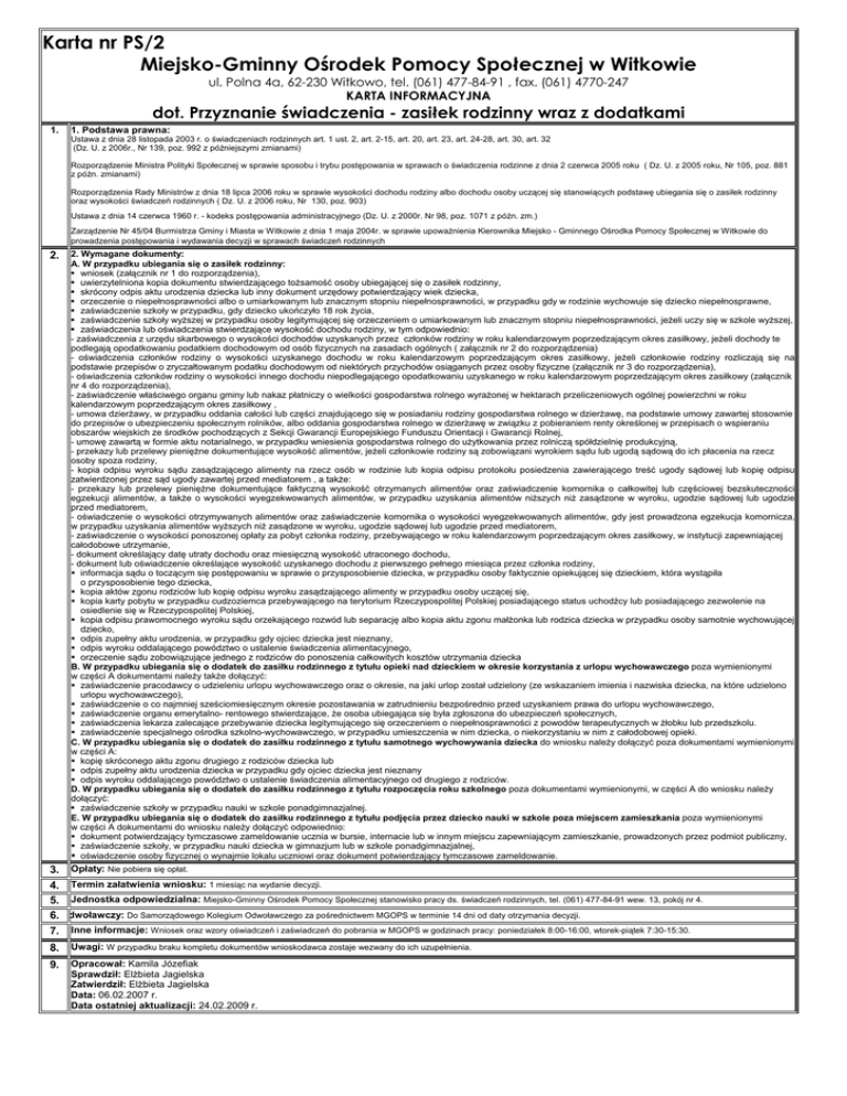 Karta nr PS/2 Miejsko-Gminny Ośrodek Pomocy Społecznej w Witkowie ul. Polna 4a, 62-230 Witkowo, tel. (061) 477-84-91 , fax. (061) 4770-247 KARTA INFORMACYJNA dot. Przyznanie świadczenia - zasiłek rodzinny wraz z dodatkami 1. 1. Podstawa prawna: Ustawa z dnia 28 listopada 2003 r. o świadczeniach rodzinnych art. 1 ust. 2, art. 2-15, art. 20, art. 23, art. 24-28, art. 30, art. 32 (Dz. U. z 2006r., Nr 139, poz. 992 z późniejszymi zmianami) Rozporządzenie Ministra Polityki Społecznej w sprawie sposobu i trybu postępowania w sprawach o świadczenia rodzinne z dnia 2 czerwca 2005 roku ( Dz. U. z 2005 roku, Nr 105, poz. 881 z późn. zmianami) Rozporządzenia Rady Ministrów z dnia 18 lipca 2006 roku w sprawie wysokości dochodu rodziny albo dochodu osoby uczącej się stanowiących podstawę ubiegania się o zasiłek rodzinny oraz wysokości świadczeń rodzinnych ( Dz. U. z 2006 roku, Nr 130, poz. 903) Ustawa z dnia 14 czerwca 1960 r. - kodeks postępowania administracyjnego (Dz. U. z 2000r. Nr 98, poz. 1071 z późn. zm.) Zarządzenie Nr 45/04 Burmistrza Gminy i Miasta w Witkowie z dnia 1 maja 2004r. w sprawie upoważnienia Kierownika Miejsko - Gminnego Ośrodka Pomocy Społecznej w Witkowie do prowadzenia postępowania i wydawania decyzji w sprawach świadczeń rodzinnych 2. 2. Wymagane dokumenty: A. W przypadku ubiegania się o zasiłek rodzinny: § wniosek (załącznik nr 1 do rozporządzenia), § uwierzytelniona kopia dokumentu stwierdzającego tożsamość osoby ubiegającej się o zasiłek rodzinny, § skrócony odpis aktu urodzenia dziecka lub inny dokument urzędowy potwierdzający wiek dziecka, § orzeczenie o niepełnosprawności albo o umiarkowanym lub znacznym stopniu niepełnosprawności, w przypadku gdy w rodzinie wychowuje się dziecko niepełnosprawne, § zaświadczenie szkoły w przypadku, gdy dziecko ukończyło 18 rok życia, § zaświadczenie szkoły wyższej w przypadku osoby legitymującej się orzeczeniem o umiarkowanym lub znacznym stopniu niepełnosprawności, jeżeli uczy się w szkole wyższej, § zaświadczenia lub oświadczenia stwierdzające wysokość dochodu rodziny, w tym odpowiednio: - zaświadczenia z urzędu skarbowego o wysokości dochodów uzyskanych przez członków rodziny w roku kalendarzowym poprzedzającym okres zasiłkowy, jeżeli dochody te podlegają opodatkowaniu podatkiem dochodowym od osób fizycznych na zasadach ogólnych ( załącznik nr 2 do rozporządzenia) - oświadczenia członków rodziny o wysokości uzyskanego dochodu w roku kalendarzowym poprzedzającym okres zasiłkowy, jeżeli członkowie rodziny rozliczają się na podstawie przepisów o zryczałtowanym podatku dochodowym od niektórych przychodów osiąganych przez osoby fizyczne (załącznik nr 3 do rozporządzenia), - oświadczenia członków rodziny o wysokości innego dochodu niepodlegającego opodatkowaniu uzyskanego w roku kalendarzowym poprzedzającym okres zasiłkowy (załącznik nr 4 do rozporządzenia), - zaświadczenie właściwego organu gminy lub nakaz płatniczy o wielkości gospodarstwa rolnego wyrażonej w hektarach przeliczeniowych ogólnej powierzchni w roku kalendarzowym poprzedzającym okres zasiłkowy , - umowa dzierżawy, w przypadku oddania całości lub części znajdującego się w posiadaniu rodziny gospodarstwa rolnego w dzierżawę, na podstawie umowy zawartej stosownie do przepisów o ubezpieczeniu społecznym rolników, albo oddania gospodarstwa rolnego w dzierżawę w związku z pobieraniem renty określonej w przepisach o wspieraniu obszarów wiejskich ze środków pochodzących z Sekcji Gwarancji Europejskiego Funduszu Orientacji i Gwarancji Rolnej, - umowę zawartą w formie aktu notarialnego, w przypadku wniesienia gospodarstwa rolnego do użytkowania przez rolniczą spółdzielnię produkcyjną, - przekazy lub przelewy pieniężne dokumentujące wysokość alimentów, jeżeli członkowie rodziny są zobowiązani wyrokiem sądu lub ugodą sądową do ich płacenia na rzecz osoby spoza rodziny, - kopia odpisu wyroku sądu zasądzającego alimenty na rzecz osób w rodzinie lub kopia odpisu protokołu posiedzenia zawierającego treść ugody sądowej lub kopię odpisu zatwierdzonej przez sąd ugody zawartej przed mediatorem , a także: - przekazy lub przelewy pieniężne dokumentujące faktyczną wysokość otrzymanych alimentów oraz zaświadczenie komornika o całkowitej lub częściowej bezskuteczności egzekucji alimentów, a także o wysokości wyegzekwowanych alimentów, w przypadku uzyskania alimentów niższych niż zasądzone w wyroku, ugodzie sądowej lub ugodzie przed mediatorem, - oświadczenie o wysokości otrzymywanych alimentów oraz zaświadczenie komornika o wysokości wyegzekwowanych alimentów, gdy jest prowadzona egzekucja komornicza, w przypadku uzyskania alimentów wyższych niż zasądzone w wyroku, ugodzie sądowej lub ugodzie przed mediatorem, - zaświadczenie o wysokości ponoszonej opłaty za pobyt członka rodziny, przebywającego w roku kalendarzowym poprzedzającym okres zasiłkowy, w instytucji zapewniającej całodobowe utrzymanie, - dokument określający datę utraty dochodu oraz miesięczną wysokość utraconego dochodu, - dokument lub oświadczenie określające wysokość uzyskanego dochodu z pierwszego pełnego miesiąca przez członka rodziny, § informacja sądu o toczącym się postępowaniu w sprawie o przysposobienie dziecka, w przypadku osoby faktycznie opiekującej się dzieckiem, która wystąpiła o przysposobienie tego dziecka, § kopia aktów zgonu rodziców lub kopię odpisu wyroku zasądzającego alimenty w przypadku osoby uczącej się, § kopia karty pobytu w przypadku cudzoziemca przebywającego na terytorium Rzeczypospolitej Polskiej posiadającego status uchodźcy lub posiadającego zezwolenie na osiedlenie się w Rzeczypospolitej Polskiej, § kopia odpisu prawomocnego wyroku sądu orzekającego rozwód lub separację albo kopia aktu zgonu małżonka lub rodzica dziecka w przypadku o