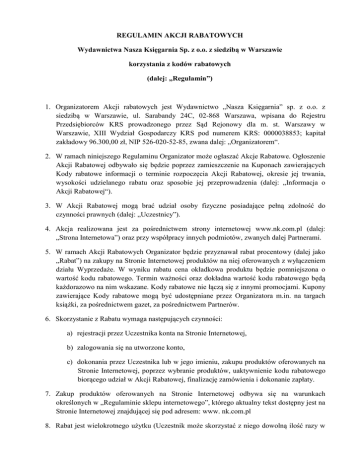 REGULAMIN AKCJI RABATOWYCH Wydawnictwa Nasza Księgarnia Sp. z o.o. z siedzibą w Warszawie korzystania z kodów rabatowych (dalej: „Regulamin”) 1. Organizatorem Akcji rabatowych jest Wydawnictwo „Nasza Księgarnia” sp. z o.o. z siedzibą w Warszawie, ul. Sarabandy 24C, 02-868 Warszawa, wpisana do Rejestru Przedsiębiorców KRS prowadzonego przez Sąd Rejonowy dla m. st. Warszawy w Warszawie, XIII Wydział Gospodarczy KRS pod numerem KRS: 0000038853; kapitał zakładowy 96.300,00 zł, NIP 526-020-52-85, zwana dalej: „Organizatorem“. 2. W ramach niniejszego Regulaminu Organizator może ogłaszać Akcje Rabatowe. Ogłoszenie Akcji Rabatowej odbywało się będzie poprzez zamieszczenie na Kuponach zawierających Kody rabatowe informacji o terminie rozpoczęcia Akcji Rabatowej, okresie jej trwania, wysokości udzielanego rabatu oraz sposobie jej przeprowadzenia (dalej: „Informacja o Akcji Rabatowej“). 3. W Akcji Rabatowej mogą brać udział osoby fizyczne posiadające pełną zdolność do czynności prawnych (dalej: „Uczestnicy”). 4. Akcja realizowana jest za pośrednictwem strony internetowej www.nk.com.pl (dalej: „Strona Internetowa”) oraz przy współpracy innych podmiotów, zwanych dalej Partnerami. 5. W ramach Akcji Rabatowych Organizator będzie przyznawał rabat procentowy (dalej jako „Rabat”) na zakupy na Stronie Internetowej produktów na niej oferowanych z wyłączeniem działu Wyprzedaże. W wyniku rabatu cena okładkowa produktu będzie pomniejszona o wartość kodu rabatowego. Termin ważności oraz dokładna wartość kodu rabatowego będą każdorazowo na nim wskazane. Kody rabatowe nie łączą się z innymi promocjami. Kupony zawierające Kody rabatowe mogą być udostępniane przez Organizatora m.in. na targach książki, za pośrednictwem gazet, za pośrednictwem Partnerów. 6. Skorzystanie z Rabatu wymaga następujących czynności: a) rejestracji przez Uczestnika konta na Stronie Internetowej, b) zalogowania się na utworzone konto, c) dokonania przez Uczestnika lub w jego imieniu, zakupu produktów oferowanych na Stronie Internetowej, poprzez wybranie produktów, uaktywnienie kodu rabatowego biorącego udział w Akcji Rabatowej, finalizację zamówienia i dokonanie zapłaty. 7. Zakup produktów oferowanych na Stronie Internetowej odbywa się na warunkach określonych w „Regulaminie sklepu internetowego”, którego aktualny tekst dostępny jest na Stronie Internetowej znajdującej się pod adresem: www. nk.com.pl 8. Rabat jest wielokrotnego użytku (Uczestnik może skorzystać z niego dowolną ilość razy w Okresie Trwania Akcji Rabatowej). 9. Po upływie Okresu Trwania Akcji Rabatowej Rabaty tracą ważność, co oznacza, że nie będą honorowane, bez prawa do jakiegokolwiek ekwiwalentu z tego tytułu. 10. Rabaty przyznane Uczestnikowi nie sumują się, co oznacza, iż w ramach jednego zamówienia Uczestnik może skorzystać tylko z jednego kodu rabatowego zawierającego. Rabat. 11. Reklamacje co do przebiegu Akcji mogą być zgłaszane pisemnie na adres siedziby Organizatora lub adres poczty elektronicznej [email protected] w terminie 21 dni po Okresie Trwania Akcji. Pisemna reklamacja powinna zawierać w tytule dopisek „Reklamacja przebiegu akcji rabatowej” oraz zawierać: imię, nazwisko, dokładny adres reklamującego, jak również dokładny opis, wskazanie przyczyny reklamacji oraz treść żądania. Reklamacje rozpatrywane są w terminie 14 dni od dnia doręczenia. O rozpatrzeniu reklamacji reklamujący zostanie powiadomiony w tej samej formie, w jakiej złożył reklamację na wskazany adres. 12. Organizator zastrzega sobie prawo do odwołania Akcji Rabatowej, po uprzednim poinformowaniu o tym na Stronie Internetowej, z tym zastrzeżeniem, że prawa Uczestników do Rabatu, które zostały już przez nich nabyte, zostaną zachowane. 13. Treść Regulaminu dostępna jest na Stronie Internetowej http://nk.com.pl/files/regulaminy/regulamin_kody_rabatowe.pdf 14. Niniejszy Regulamin wchodzi w życie z dniem ogłoszenia. pod adresem: