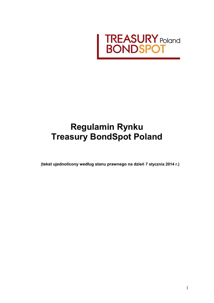 Regulamin Rynku Treasury BondSpot Poland (tekst ujednolicony według stanu prawnego na dzień 7 stycznia 2014 r.) 1 Regulamin Rynku Treasury BondSpot Poland Spis treści: ROZDZIAŁ I – PRZEPISY OGÓLNE ...................................................................................... 3 ROZDZIAŁ II - DOPUSZCZENIE I REZYGNACJA............................................................. 5 ROZDZIAŁ III - OBOWIĄZKI UCZESTNIKÓW ................................................................... 8 ROZDZIAŁ IV – PROWADZENIE OBROTU ...................................................................... 10 ROZDZIAŁ V – TRANSAKCJE ............................................................................................ 11 ROZDZIAŁ VI - INFORMACJE ............................................................................................ 14 ROZDZIAŁ VII – NADZÓR NAD RYNKIEM ..................................................................... 15 ROZDZIAŁ VIII – ODPOWIEDZIALNOŚĆ I ROZWIĄZYWANIE SPORÓW ................. 18 Rozdział IX – LISTA ZAŁĄCZNIKÓW DO REGULAMINU .............................................. 18 Załącznik A – Grupy SPW wg terminów zapadalności ........................................................... 20 Załącznik B – (skreślony) ........................................................................................................ 21 Załącznik C – Minimalna jednostka obrotu ............................................................................. 22 Załącznik D – (skreślony) ........................................................................................................ 23 Załącznik E – Harmonogram Dnia Obrotu .............................................................................. 24 Załącznik F – Dni Obrotu......................................................................................................... 25 Załącznik G – Minimalna jednostka kwotowania / maksymalny Spread w Ofertach dwustronnych ........................................................................................................................... 26 Załącznik H – (skreślony) ........................................................................................................ 27 Załącznik I - Procedury rozliczeniowe.................................................................................... 28 Załącznik J – (skreślony).......................................................................................................... 30 Załącznik K - Zasady zawierania transakcji w ramach segmentu instytucjonalnego .............. 31 Załącznik L - Przydzielanie Płynnych SPW Market Makerom ............................................... 32 Załącznik M – Dzienne statystyki ............................................................................................ 33 Załącznik N – Procedura stosowana w przypadku, gdy Uczestnik nie jest w stanie zweryfikować zawartych transakcji na swoim ekranie ............................................................ 34 Załącznik O - Procedura Anulowania Transakcji ................................................................... 35 Załącznik P – Tabela opłat ....................................................................................................... 38 Załącznik R – Zasady zawierania transakcji warunkowych repo ............................................ 44 Załącznik Q – Prowizje za kwotowanie transakcyjne RFQ .................................................... 47 Załącznik S – Dobre praktyki rynkowe .................................................................................... 48 2 Regulamin Rynku Treasury BondSpot Poland ROZDZIAŁ I – PRZEPISY OGÓLNE § 1. - Definicje W niniejszym Regulaminie następujące określenia mają poniżej wymienione znaczenie: Agent Emitenta oznacza Uczestnika wskazanego przez Emitenta upoważnionego do zawierania transakcji na Rynku na zasadach określonych przez Spółkę w uzgodnieniu z Emitentem; Bazowe SPW oznacza SPW określane przez Ministra Finansów, w szczególności SPW o stałym dochodzie i terminie wykupu nie krótszym niż jeden rok oraz wartości nominalnej nie mniejszej niż 2 mld zł; Cena oznacza wartość wyrażoną w procentach wartości nominalnej SPW, należną z tytułu sprzedaży obligacji skarbowych, z wyłączeniem należnych odsetek, a w przypadku bonów skarbowych wyrażoną procentowo roczną stopę rentowności do terminu wykupu; Dyspozycja oznacza przyjęcie Oferty w całości bądź w części, dokonane za pośrednictwem Systemu i niezwłocznie zarejestrowane przez System; Dyspozycja Mid Price oznacza Dyspozycję, składaną wyłącznie przez Market Makera na rynku kasowym w ramach odrębnego arkusza Ofert Mid Price; Dzień Obrotu oznacza dzień, w którym SPW mogą być przedmiotem obrotu na Rynku, zgodnie z Załącznikiem F; Emitent oznacza Ministra Finansów; Godziny Obrotu oznacza godziny, podczas których odbywa się obrót SPW na Rynku w Dniu Obrotu, za pośrednictwem Systemu, zgodnie z Załącznikiem E; Informacje w czasie rzeczywistym oznacza informacje dotyczące SPW będących przedmiotem obrotu na Rynku, w stosunku do których upłynęło nie więcej niż 600 sekund od chwili gdy takie informacje zostały przekazane do Uczestników; Instytucja Rozliczeniowa oznacza odpowiednio Krajowy Depozyt Papierów Wartościowych S.A. (KDPW), w którym rozliczane są transakcje obligacjami skarbowymi, lub Narodowy Bank Polski prowadzący Rejestr Papierów Wartościowych (RPW), w którym rozliczane są transakcje bonami skarbowymi; Inwestor instytucjonalny oznacza Uczestnika uprawnionego do zawierania transakcji na Rynku zgodnie z § 10 ust. 3; Komitet Rynku organ, o którym mowa w § 35 Regulaminu; Market Maker oznacza Uczestnika uprawnionego do zawierania transakcji na Rynku zgodnie z § 10 ust. 2; 3 Regulamin Rynku Treasury BondSpot Poland Market Take