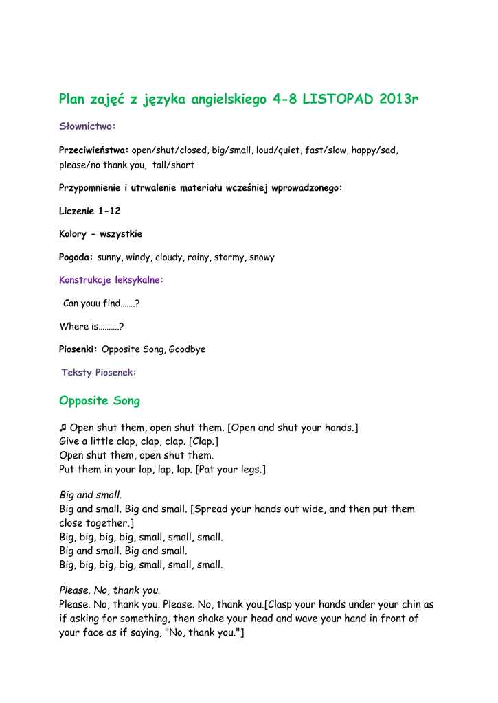 Plan zajęć z języka angielskiego 4-8 LISTOPAD 2013r Słownictwo: Przeciwieństwa: open/shut/closed, big/small, loud/quiet, fast/slow, happy/sad, please/no thank you, tall/short Przypomnienie i utrwalenie materiału wcześniej wprowadzonego: Liczenie 1-12 Kolory - wszystkie Pogoda: sunny, windy, cloudy, rainy, stormy, snowy Konstrukcje leksykalne: Can youu find…….? Where is……….? Piosenki: Opposite Song, Goodbye Teksty Piosenek: Opposite Song ♫ Open shut them, open shut them. [Open and shut your hands.] Give a little clap, clap, clap. [Clap.] Open shut them, open shut them. Put them in your lap, lap, lap. [Pat your legs.] Big and small. Big and small. Big and small. [Spread your hands out wide, and then put them close together.] Big, big, big, big, small, small, small. Big and small. Big and small. Big, big, big, big, small, small, small. Please. No, thank you. Please. No, thank you. Please. No, thank you.[Clasp your hands under your chin as if asking for something, then shake your head and wave your hand in front of your face as if saying, "No, thank you."] Please, please, please, please. No thank you. Please. No, thank you. Please. No, thank you. Please, please, please, please. No thank you. Fast and slow. Fast and slow. Fast and slow. [Move your hands round and round quickly, and then slowly.] Fast, fast, fast, fast, slow, slow, slow. Fast and slow. Fast and slow. Fast, fast, fast, fast, slow, slow, slow. Loud and quiet. Loud and quiet. Loud and quiet. [Cup your hands around your mouth and shout, and then put your finger in front of your mouth like you are saying, "Shh."] Loud, loud, loud, loud. Shh... Quiet. Loud and quiet. Loud and quiet. Loud, loud, loud, loud. Shh... Quiet. Peek-a-boo. Peek-a-boo. Peek-a-boo. [Place your hands in front of your face and then quickly move them away as you say, "Boo!"] Peek-a, peek-a, peek-a-boo! Peek-a-boo. Peek-a-boo. Peek-a, peek-a, peek-a-boo! ♫ Goodbye ♫ Bye bye. Goodbye. [Wave with one hand, then the other hand, then with both hands.] Bye, bye, bye, bye. Goodbye. I I I I can clap my hands. [Clap your hands.] can stamp my feet. [Stamp your feet.] can clap my hands. can stamp my feet. Bye bye. Goodbye. Bye, bye, bye, bye. Goodbye. Bye bye. Goodbye. Bye, bye, bye, bye. Goodbye. GOODBYE! [Jump up with your fist in the air!] ♫