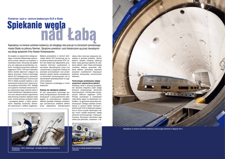 Spiekanie węgla Powietrze i azot w centrum badawczym DLR w Stade nad Łabą Największy na świecie autoklaw badawczy od ubiegłego lata pracuje na obrzeżach powiatowego miasta Stade na północy Niemiec. Sprężone powietrze i azot dostarczane są przez dwustopniową stację sprężarek firmy Kaeser Kompressoren. Ze względu na zapewnienie stałego postępu w zakresie efektywnego wykorzystania energii zalecane są autoklawy o niewielkiej masie. Kluczową rolę będzie przy tym odgrywać przyszłościowy materiał – kompozyt wzmocniony włóknami węglowymi (CFK). CFK jest materiałem lekkim, bardzo odpornym i dającym się dobrze formować. Centrum technologii lekkich ZLP działające przy niemieckim centrum badań lotniczych i kosmicznych DLR w Stade prowadzi badania w celu opracowania praktycznych metod seryjnej produkcji elementów CFK. Miałyby one zapewnić możliwość ekonomicznego zastosowania tego materiału także w innych dziedzinach. Największe wyzwanie w tym zakresie stanowi zapewnienie ekonomicznej produkcji większej liczby sztuk, kontroli procesu produkcji online i wymaganej jakości, a także opracowanie właściwej konstrukcji elementów wykonanych z włókien węglowych. Badania prowadzone w centrum technologii lekkich ZLP koncentrują się na procesie produkcji elementów CFK. Celem tych badań jest odpowiednie przeniesienie informacji uzyskiwanych w warunkach laboratoryjnych przez inne uczestniczące w programie instytuty do procesów przemysłowych oraz przetestowanie zjawisk stanów nieustalonych na elementach konstrukcyjnych lub na stanowiskach doświadczalnych w oryginalnej wielkości. Prace badawcze przebiegają w trzech obszarach: Roboty do układania włókien W celu opracowania technologii produkcji kompozytowych elementów konstrukcyjnych o dużej powierzchni polegającej na automatycznym układaniu włókien) powstała instalacja umożliwiająca symultaniczne układanie włókien przez odpowiednio skoordynowane roboty, która może być elastycznie stosowana w procesie produkcji. Oprócz platform robotów instalacja obejmuje także nowej generacji głowice do układania włókien i taśm. Nowa technologia umożliwia większą sprawność układania włókien, wychodząc naprzeciw przyszłym oczekiwaniom dotyczącym produkcji kompozytów wzmocnionych włóknami. Technologia autoklawów objęta systemem zapewnienia jakości Autoklawy także w dłuższej perspektywie stanowią integralną część całego łańcucha produkcyjnego elementów konstrukcyjnych z kompozytów wzmacnianych włóknem węglowym (CFK). Procesy zachodzące w autoklawach mają istotny wpływ na właściwości materiałów i na geometrię elementów konstrukcyjnych. Dlatego autoklaw zainstalowany w centrum badań lotniczych i kosmicznych DLR w Stade jest wyposażony w liczne czujniki rejestrujące między innymi rozkład temperatur całego elementu konstrukcyjnego i reakcję polimerową. Kluczowym elementem tego układu jest jednostka „masterbox“ z dy- Największy na świecie autoklaw badawczy może przyjąć elementy o długości 20 m. Naukowcy z DLR „okablowują“ do badań element umieszczony w autoklawie. Rzut oka na stację sprężarek wysokiego ciśnienia. Automatyczną linię układania włókien węglowych obsługują roboty namicznym systemem sterowania autoklawem dostosowanym do stanu danego elementu konstrukcyjnego. Moduł symulacyjny „Autoklaw wirtualny“ jest modelem odtwarzającym w realistyczny sposób przebieg procesu. Model ten umożliwia równolegle do przebiegu procesu obliczenie skutków ewentualnego odstępstwa od planowanego przebiegu procesu, przeciwdziałając w ten sposób inercji instalacji autoklawu. Pozwala to na skrócenie czasu realizacji poszczególnych cykli i zmniejszenie zapotrzebowania na energię. Kontrola końcowa objętościowych elementów konstrukcyjnych Roczna produkcja elementów konstrukcyjnych z kompozytów wzmacnianych włóknem węglowym (CFK) na poziomie do 100.000 sztuk wymaga krótkiego czasu realizacji procesu, automatycznej obróbki podzespołów, zaprojektowania właściwego materiału i odpowiedniej technologii. W tym celu przy pomocy wielofunkcyjnej platformy technologicz- nej symulowane są praktyczne aplikacje w zakresie automatyzacji i skalowania elementów konstrukcyjnych. Celem jest uzyskanie w pełni automatycznego łańcucha produkcji kompleksowych kompozytowych elementów konstrukcyjnych oraz obniżenie kosztów produkcji poprzez automatyzację i skrócenie czasu realizacji procesu. Elastyczna platforma produkcji umożliwia przeprowadzenie badania różnych typów elementów konstrukcyjnych, na przykład płaskich elementów konstrukcyjnych 3D o kompleksowej strukturze lub zakrzywionych i profilowanych dźwigarów prętowych, wymaganych między innymi w branży samochodowej. Sprężone powietrze i azot dla „szybkowara“ Nowy autoklaw doświadczalny o długości 20 m i średnicy 5,80 m (długość zewnętrzna 27 m, średnica zewnętrzna 6,50 m) jest naprawdę imponujący. Rura waży 165 ton a szczelna „pokrywa” dodatkowo 16 ton. Autoklaw jest piecem, w którym pod wpływem działania wyso- Po długiej drodze wodą i lądem autoklaw dotarł na miejsce. 8 Report 1/13 – www.kaeser.com kiej temperatury i dużego ciśnienia następuje połączenie materiałów, a więc rzeczywiście przypomina szybkowar. Można w nim wykonać i przeanalizować elementy konstrukcyjne kadłuba samolotu, skrzydła lub usterzenia pionowe. Autoklaw badawczy pracuje w temperaturze 420°C, a maksymalne ciśnienie robocze gazu ochronnego wynosi 10 bar. Jako gaz ochronny stosowany jest azot w celu uniknięcia zapalenia się przedmiotów w gorącym autoklawie. Wytwarzanie azotu jest jednym z głównych zadań dwustopniowej stacji sprężarek zainstalowanej przez firmę Kaeser Kompressoren. Dwie sprężarki śrubowe typu CSD 125 SFC (75 kW, o regulowanej liczbie obrotów) zasilają naprzemiennie sieć sprężonego powietrza pod ciśnieni