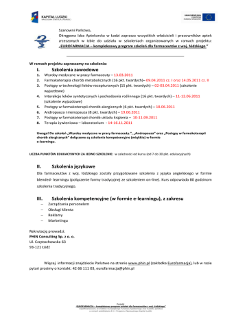 Szanowni Państwo, Okręgowa Izba Aptekarska w Łodzi zaprasza wszystkich właścicieli i pracowników aptek zrzeszonych w Izbie do udziału w szkoleniach organizowanych w ramach projektu: „EUROFARMACJA – kompleksowy program szkoleń dla farmaceutów z woj. łódzkiego ” W ramach projektu zapraszamy na szkolenia: I. Szkolenia zawodowe Wyroby medyczne w pracy farmaceuty – 13.03.2011 Farmakoterapia chorób metabolicznych (16 pkt. twardych)– 09.04.2011 cz. I oraz 14.05.2011 cz. II Postępy w technologii leków recepturowych (15 pkt. twardych) – 02-03.04.2011 (szkolenie wyjazdowe) Interakcje leków syntetycznych i pochodzenia roślinnego (16 pkt. twardych) – 11-12.06.2011 (szkolenie wyjazdowe) Postępy w farmakoterapii chorób alergicznych (6 pkt. twardych) – 18.06.2011 Andropauza i menopauza (8 pkt. twardych) – 19.06.2011 Postępy w farmakoterapii chorób układu krążenia – 10-11.09.2011 Terapia żywieniowa – laboratorium - 14-16.11.2011 1. 2. 3. 4. 5. 6. 7. 8. Uwaga! Do szkoleń „Wyroby medyczne w pracy farmaceuty.”, „Andropauza” oraz „Postępy w farmakoterapii chorób alergicznych” dołączone są szkolenia kompetencyjne (miękkie) w formie e-learningu. LICZBA PUNKTÓW EDUKACYJNYCH ZA JEDNO SZKOLENIE: w zależności od kursu (od 7 do 30 pkt. edukacyjnych) II. Szkolenia językowe Dla farmaceutów z woj. łódzkiego zostały przygotowane szkolenia z języka angielskiego w formie blended- learningu (połączenie formy tradycyjnej ze szkoleniem on-line). Kurs odpowiada 80 godzinom szkolenia tradycyjnego. III. − − − − Szkolenia kompetencyjne (w formie e-learningu), z zakresu Zarządzania personelem Obsługi klienta Reklamy Marketingu Rekrutację prowadzi: PHIN Consulting Sp. z o. o. Ul. Częstochowska 63 93-121 Łódź Więcej informacji znajdziecie Państwo na stronie www.phin.pl (zakładka Eurofarmacja), lub w razie pytań prosimy o kontakt: 42 66 111 03, [email protected] Projekt „EUROFARMACJA – kompleksowy program szkoleń dla farmaceutów z woj. Łódzkiego” współfinansowany ze środków Europejskiego Funduszu Społecznego oraz budżetu państwa w ramach poddziałania 8.1.1 Programu Operacyjnego Kapitał Ludzki