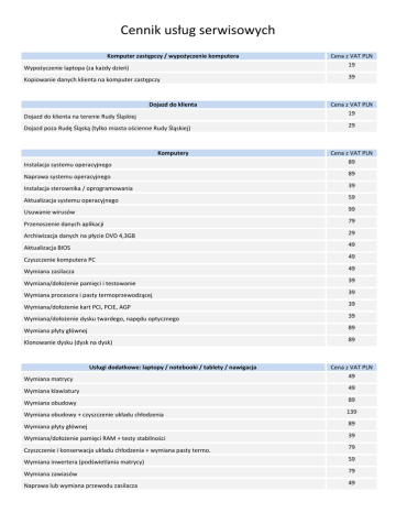 Cennik usług serwisowych Komputer zastępczy / wypożyczenie komputera Wypożyczenie laptopa (za każdy dzień) Kopiowanie danych klienta na komputer zastępczy Dojazd do klienta Dojazd do klienta na terenie Rudy Śląskiej Dojazd poza Rudę Śląską (tylko miasta ościenne Rudy Śląskiej) Komputery Cena z VAT PLN 19 39 Cena z VAT PLN 19 29 Instalacja systemu operacyjnego Cena z VAT PLN 89 Naprawa systemu operacyjnego 89 Instalacja sterownika / oprogramowania 39 Aktualizacja systemu operacyjnego 59 Usuwanie wirusów 99 Przenoszenie danych aplikacji 79 Archiwizacja danych na płycie DVD 4,3GB 29 Aktualizacja BIOS 49 Czyszczenie komputera PC 49 Wymiana zasilacza 49 Wymiana/dołożenie pamięci i testowanie 39 Wymiana procesora i pasty termoprzewodzącej 39 Wymiana/dołożenie kart PCI, PCIE, AGP 39 Wymiana/dołożenie dysku twardego, napędu optycznego 39 Wymiana płyty głównej 89 Klonowanie dysku (dysk na dysk) 89 Usługi dodatkowe: laptopy / notebooki / tablety / nawigacja Wymiana matrycy Cena z VAT PLN 49 Wymiana klawiatury 49 Wymiana obudowy 89 Wymiana obudowy + czyszczenie układu chłodzenia 139 Wymiana płyty głównej 89 Wymiana/dołożenie pamięci RAM + testy stabilności 39 Czyszczenie i konserwacja układu chłodzenia + wymiana pasty termo. 79 Wymiana inwertera (podświetlania matrycy) 59 Wymiana zawiasów 79 Naprawa lub wymiana przewodu zasilacza 49 Cennik usług serwisowych Naprawa lub wymiana gniazda USB w tablecie 59 Naprawa gniazda zasilania w laptopie (gdy pękną luty) 89 Wymiana gniazda zasilania w laptopie 159 Aktualizacja mapy GPS 49 Przywrócenie ustawień fabrycznych Android 39 Wymiana baterii BIOS 69 Usunięcie hasła użytkownika systemu Windows 49 Drukarki Czyszczenie i konserwacja drukarki atramentowej Cena z VAT PLN 79 129 Czyszczenie i konserwacja drukarki laserowej Odzyskiwanie danych Ekspertyza nośnika Odzyskiwanie danych z karty pamięci / pamięci flash Ekspertyza Cena z VAT PLN 0 119 Ekspertyza komputera PC / laptopa / notebooka Cena z VAT PLN 0*/39 Ekspertyza drukarki, nawigacji GPS, monitora LCD 0*/29 Pisemna ekspertyza do zakładu ubezpieczeń (cena pisma, należy doliczyć cenę ekspertyzy urządzenia) Sieci bezprzewodowe / Internet Konfiguracja routera / sieci bezprzewodowej / Internetu z dojazdem do domu Serwis u klienta Godzina pracy serwisanta (z dojazdem) 20 Cena z VAT PLN 79 Cena z VAT PLN 99 69 Usługa do 30 minut (z dojazdem) Szkolenia Szkolenie komputerowe (do 30 minut na miejscu) Pakiet szkoleniowy 8 godzin dydaktycznych (po 45 minut) na miejscu / z dojazdem do klienta Cena z VAT PLN 39 350 / 450 * - ekspertyza jest bezpłatna TYLKO dla klientów, którzy zdecydują się na przeprowadzenie usługi naprawy bądź odzyskiwania danych. W przypadku gdy wyniki ekspertyzy wskazują możliwość naprawy/odzyskania , a klient rezygnuje z dalszego procesu, ponosi on koszty ekspertyzy w wysokości ustalonej w cenniku. Cennik obowiązuje od 27 października 2016 roku, wszystkie ceny zawierają VAT 23% tel. 327 717 212 tel. 533 380 480 Cennik usług serwisowych tel. 516 069 386 Pracujemy: Poniedziałek – Piątek 9:00 – 17:00, Sobota 10:00 – 13:00