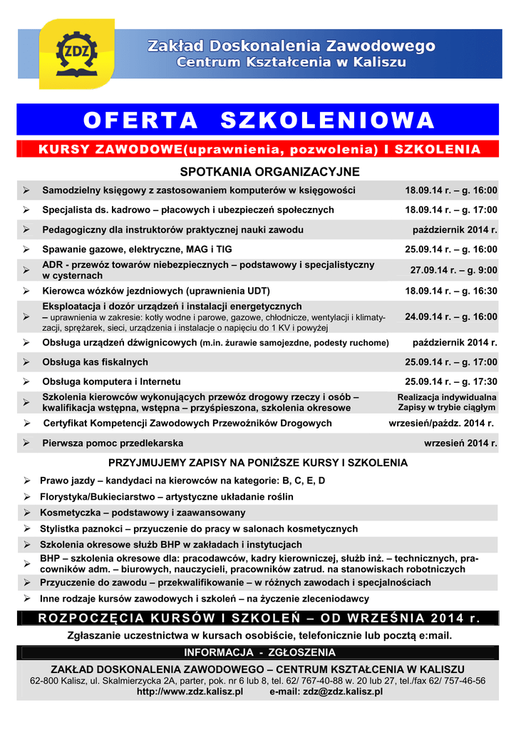 OFERTA SZKOLENIOWA KURSY ZAWODOWE(uprawnienia, pozwolenia) I SZKOLENIA SPOTKANIA ORGANIZACYJNE Samodzielny księgowy z zastosowaniem komputerów w księgowości 18.09.14 r. – g. 16:00 Specjalista ds. kadrowo – płacowych i ubezpieczeń społecznych 18.09.14 r. – g. 17:00 Pedagogiczny dla instruktorów praktycznej nauki zawodu październik 2014 r. Spawanie gazowe, elektryczne, MAG i TIG 25.09.14 r. – g. 16:00 ADR - przewóz towarów niebezpiecznych – podstawowy i specjalistyczny w cysternach 27.09.14 r. – g. 9:00 Kierowca wózków jezdniowych (uprawnienia UDT) 18.09.14 r. – g. 16:30 Eksploatacja i dozór urządzeń i instalacji energetycznych – uprawnienia w zakresie: kotły wodne i parowe, gazowe, chłodnicze, wentylacji i klimaty- 24.09.14 r. – g. 16:00 zacji, sprężarek, sieci, urządzenia i instalacje o napięciu do 1 KV i powyżej Obsługa urządzeń dźwignicowych (m.in. żurawie samojezdne, podesty ruchome) październik 2014 r. Obsługa kas fiskalnych 25.09.14 r. – g. 17:00 Obsługa komputera i Internetu 25.09.14 r. – g. 17:30 Szkolenia kierowców wykonujących przewóz drogowy rzeczy i osób – kwalifikacja wstępna, wstępna – przyśpieszona, szkolenia okresowe Certyfikat Kompetencji Zawodowych Przewoźników Drogowych Realizacja indywidualna Zapisy w trybie ciągłym wrzesień/paźdz. 2014 r.. Pierwsza pomoc przedlekarska wrzesień 2014 r. PRZYJMUJEMY ZAPISY NA PONIŻSZE KURSY I SZKOLENIA Prawo jazdy – kandydaci na kierowców na kategorie: B, C, E, D Florystyka/Bukieciarstwo – artystyczne układanie roślin Kosmetyczka – podstawowy i zaawansowany Stylistka paznokci – przyuczenie do pracy w salonach kosmetycznych Szkolenia okresowe służb BHP w zakładach i instytucjach BHP – szkolenia okresowe dla: pracodawców, kadry kierowniczej, służb inż. – technicznych, pracowników adm. – biurowych, nauczycieli, pracowników zatrud. na stanowiskach robotniczych Przyuczenie do zawodu – przekwalifikowanie – w różnych zawodach i specjalnościach Inne rodzaje kursów zawodowych i szkoleń – na życzenie zleceniodawcy ROZPOCZĘCIA KURSÓW I SZKOLEŃ – OD WRZEŚNIA 2014 r. Zgłaszanie uczestnictwa w kursach osobiście, telefonicznie lub pocztą e:mail. INFORMACJA - ZGŁOSZENIA ZAKŁAD DOSKONALENIA ZAWODOWEGO – CENTRUM KSZTAŁCENIA W KALISZU 62-800 Kalisz, ul. Skalmierzycka 2A, parter, pok. nr 6 lub 8, tel. 62/ 767-40-88 w. 20 lub 27, tel./fax 62/ 757-46-56 http://www.zdz.kalisz.pl e-mail: [email protected]
