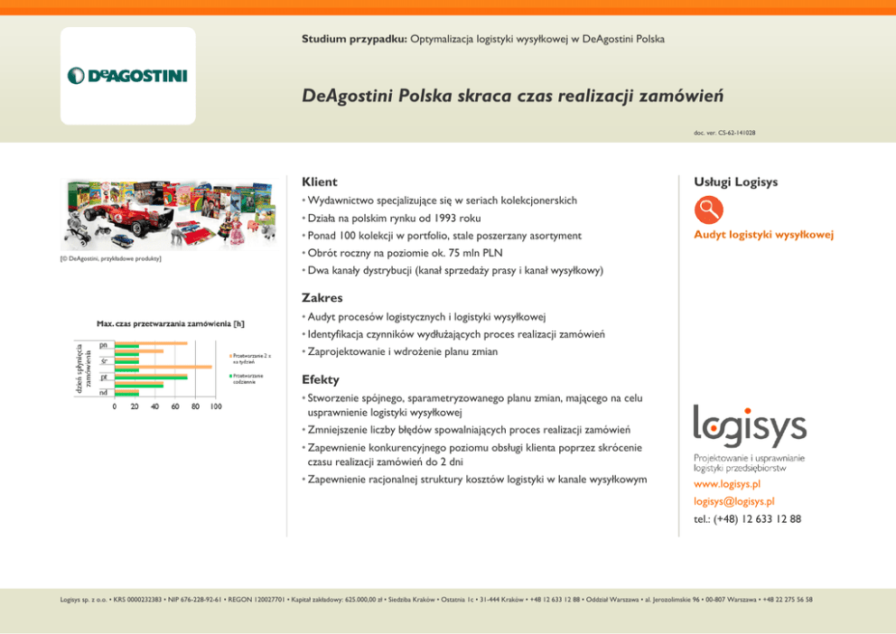 Studium przypadku: Optymalizacja logistyki wysyłkowej w DeAgostini Polska DeAgostini Polska skraca czas realizacji zamówień doc. ver. CS-62-141028 Klient Usługi Logisys • Wydawnictwo specjalizujące się w seriach kolekcjonerskich • Działa na polskim rynku od 1993 roku • Ponad 100 kolekcji w portfolio, stale poszerzany asortyment [© DeAgostini, przykładowe produkty] Audyt logistyki wysyłkowej • Obrót roczny na poziomie ok. 75 mln PLN • Dwa kanały dystrybucji (kanał sprzedaży prasy i kanał wysyłkowy) Zakres • Audyt procesów logistycznych i logistyki wysyłkowej • Identyfikacja czynników wydłużających proces realizacji zamówień • Zaprojektowanie i wdrożenie planu zmian Efekty • Stworzenie spójnego, sparametryzowanego planu zmian, mającego na celu usprawnienie logistyki wysyłkowej • Zmniejszenie liczby błędów spowalniających proces realizacji zamówień • Zapewnienie konkurencyjnego poziomu obsługi klienta poprzez skrócenie czasu realizacji zamówień do 2 dni • Zapewnienie racjonalnej struktury kosztów logistyki w kanale wysyłkowym www.logisys.pl [email protected] tel.: (+48) 12 633 12 88 Logisys sp. z o.o. • KRS 0000232383 • NIP 676-228-92-61 • REGON 120027701 • Kapitał zakładowy: 625.000,00 zł • Siedziba Kraków • Ostatnia 1c • 31-444 Kraków • +48 12 633 12 88 • Oddział Warszawa • al. Jerozolimskie 96 • 00-807 Warszawa • +48 22 275 56 58