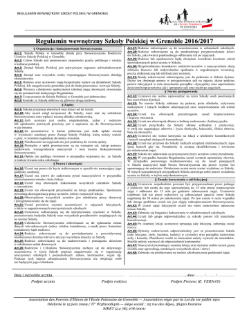 REGULAMIN WEWNĘTRZNY SZKOŁY POLSKIEJ W GRENOBLE _______________________________________________________________________________________ Regulamin wewnętrzny Szkoły Polskiej w Grenoble 2016/2017 § Organizacja i funkcjonowanie Stowarzyszenia Art.1: Szkoła Polska w Grenoble działa przy Stowarzyszeniu Rodziców Uczniów Szkoły Polskiej w Grenoble. Art.2: Celem Szkoły jest promowanie znajomości języka polskiego i wiedzy o kulturze polskiej. Art.3: Zarząd Szkoły Polskiej jest najwyższym organem uchwałodawczym Szkoły. Art.4: Zarząd oraz wszystkie osoby wspomagające Stowarzyszenie działają charytatywnie. Art.5: Rodzice oraz uczniowie mają bezpośredni wpływ na działalność Szkoły Polskiej. Ich zangażowanie potrzebne jest do funkcjonowania i rozwoju Szkoły. Art.6: Wszyscy członkowie społeczności szkolnej mają obowiązek stosowania się do postanowień niniejszego Regulaminu. Art.7: Uczęszczanie do Szkoły Polskiej w Grenoble jest dobrowolne. Art.8: Kontakt ze Szkołą odbywa się głównie drogą mailową. § Zapisy Art.9: Szkoła przyjmuje dorosłych oraz dzieci od lat trzech. Art.10: Aby uczeń mógł uczęszczać do Szkoły, musi stać się członkiem Stowarzyszenia oraz wpłacić roczną składkę członkowską. Art.11: Jeśli uczniem jest osoba niepełnoletnia, jeden z rodziców lub opiekunów prawnych proszony jest o zapisanie się do Stowarzyszenia w jej imieniu. Art.12: Za uczestnictwo w kursie pobierana jest stała opłata roczna w wysokości ustalonej przez Zarząd Szkoły Polskiej, którą należy wnieść z góry, w terminie najpóźniej do końca września. Art.13: Nieobecność na zajęciach nie jest podstawą do zwrotu opłaty. Art.14: Pieniądze z opłat przeznaczone są na wynajem sal, zakup pomocy naukowych, wynagrodzenia nauczycieli i inne koszta funkcjonowania Stowarzyszenia. Art.15: Opłata nie podlega zwrotowi w przypadku wypisania się ze Szkoły w trakcie trwania roku szkolnego. § Prawa i obowiązki Art.16: Uczeń ma prawo do bycia traktowanym w sposób nie naruszający jego godności osobistej. Art.17: Uczeń ma prawo do zadawania pytań nauczycielowi w przypadku niezrozumienia tematu i treści lekcji. Art.18: Uczeń maj obowiązek traktowania wszystkich członków Szkoły z szacunkiem. Art.19: Uczeń ma obowiązek przychodzić na lekcje punktualnie. Spóźnienia powodują dezorganizację pracy uczniów, którzy rozpoczęli lekcje. Art.20: Obowiązkiem wszystkich uczniów jest odrabianie pracy domowej i przygotowywanie się do zajęć. Art.21: Uczeń powinien czynnie uczestniczyć w zajęciach lekcyjnych, a także w organizowanych uroczystościach szkolnych. Art.22: Uczniowie zobowiązują się do utrzymywania czystości w Szkole, poszanowania budynku Szkoły oraz wszystkich przedmiotów znajdujących się na terenie Szkoły. Art.23: Członkowie Stowarzyszenia zobowiązani są do zgłaszania zmian danych tele-adresowych (adres, telefon kontaktowy, e-mail) przez formularz kontaktowy bądź mailowo. Art.24: Rodzice zobowiazani są do powiadamiania o przewidywanej nieobecnosci dziecka lub też o decyzji wycofania dziecka ze Szkoły. Art.25: Rodzice zobowiazani są do nadzorowania i pomagania dzieciom w odrabianiu zadań domowych. Art.26: Rodziców i Członków Stowarzyszenia zachęca się do aktywnego uczestnictwa w życiu Szkoły poprzez angażowanie się w organizację uroczystości szkolnych i pozaszkolnych: zabaw, kiermaszów, wyjść itp. Podczas tych imprez ubezpieczenie Stowarzyszenia nie obejmuje osób nie będącymi jego członkami. Imię i nazwisko ucznia ..................................................................................... Podpis ucznia Podpis rodzica Art.27: Rodzice zobowiązani są do uczestniczenia w zebraniach szkolnych. Art.28: Rodzice zobowiązani są do punktualnego przyprowadzania dzieci do Szkoły, jak również punktualnego odbierania ich po zajęciach. Art.29: Rodzice lub opiekunowie będą obciążani wszelkimi kosztami szkód spowodowanych przez ucznia w Szkole. Art.30: Bezpośredniemu kontaktowi rodziców/uczniów z nauczycielami służą zebrania klasowe lub indywidualne spotkania w uzgodnionym wcześniej, pocztą elektroniczną lub telefonicznie terminie. Art.31: Każdy rodzic/uczeń zobowiązany jest do pełnienia w Szkole dyżuru. Dyżur ten obejmuje pomoc w przygotowaniu sali na zajęcia, dyżur podczas przerw lekcyjnych w celu utrzymania porządku i dyscypliny oraz zapewnienia dzieciom bezpieczeństwa jak i sprzątanie sali oraz toalet po zajęciach. § Normy postępowania Art.32: Uczniowi nie wolno wprowadzać na teren Szkoły osób postronnych bez zezwolenia dyrekcji. Art.33: Na terenie Szkoły zabrania się palenia, picia alkoholu, zażywania narkotyków i innych środków odurzających oraz rozprowadzania ich wśród uczniów. Art.34: Uczeń ma obowiązek przestrzegania zasad bezpieczeństwa i higieny otoczenia. Art.35: Uczeń ma obowiązek dbania o kulturę zachowania i kulturę języka. Art.36: Uczeń przychodzi do Szkoły ubrany schludnie i estetycznie, w strój nie zagrażający zdrowiu i życiu (kolczyki, łańcuszki, śliskie obuwie, buty na obcasach). Art.37: Uczniowi nie wolno korzystać na lekcji z telefonów komórkowych i innych urządzeń służących komunikacji. Art.38: Uczeń nie przynosi do Szkoły żadnych urządzeń elektronicznych, typu ipod, konsoli gier itp. Przedmoity te zostaną skonfiskowane i zwrócone po zakończeniu zajęć. Art.39: Szkoła nie odpowiada za przynoszone przez uczniów cenne przedmioty. Art.40: W przypadku łamania Regulaminu uczeń zostanie upomniany słownie. W przypadku ponownego niedostosowania się do zasad panujących w Szkole nauczyciel bądź Prezes Stowarzyszenia ma prawo wysłać list upominający do rodziców. Ostatecznie uczeń może zostać wydalony ze Szkoły. W innych uzasadnionych przypadkach Szkoła zastrzega sobie prawo wydalenia ucznia ze Szkoły w trybie natychmiastowym. § Zasady korzystania z sali lekcyjnej Art.41: Uczniowie niep