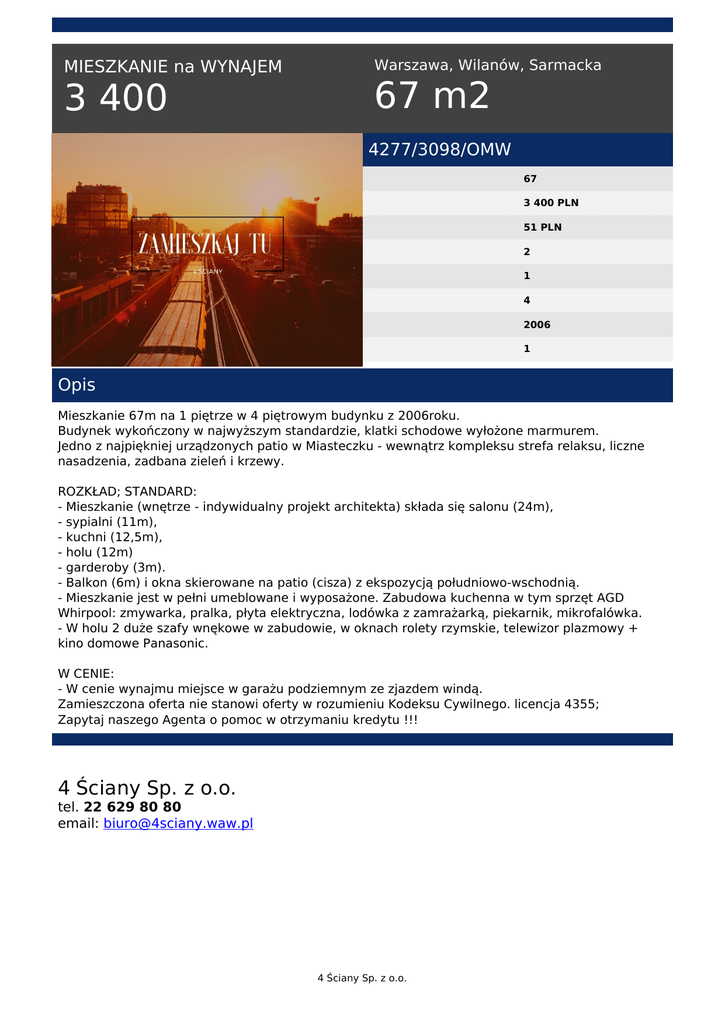 MIESZKANIE na WYNAJEM 3 400 Warszawa, Wilanów, Sarmacka 67 m2 4277/3098/OMW 67 3 400 PLN 51 PLN 2 1 4 2006 1 Opis Mieszkanie 67m na 1 piętrze w 4 piętrowym budynku z 2006roku. Budynek wykończony w najwyższym standardzie, klatki schodowe wyłożone marmurem. Jedno z najpiękniej urządzonych patio w Miasteczku - wewnątrz kompleksu strefa relaksu, liczne nasadzenia, zadbana zieleń i krzewy. ROZKŁAD; STANDARD: - Mieszkanie (wnętrze - indywidualny projekt architekta) składa się salonu (24m), - sypialni (11m), - kuchni (12,5m), - holu (12m) - garderoby (3m). - Balkon (6m) i okna skierowane na patio (cisza) z ekspozycją południowo-wschodnią. - Mieszkanie jest w pełni umeblowane i wyposażone. Zabudowa kuchenna w tym sprzęt AGD Whirpool: zmywarka, pralka, płyta elektryczna, lodówka z zamrażarką, piekarnik, mikrofalówka. - W holu 2 duże szafy wnękowe w zabudowie, w oknach rolety rzymskie, telewizor plazmowy + kino domowe Panasonic. W CENIE: - W cenie wynajmu miejsce w garażu podziemnym ze zjazdem windą. Zamieszczona oferta nie stanowi oferty w rozumieniu Kodeksu Cywilnego. licencja 4355; Zapytaj naszego Agenta o pomoc w otrzymaniu kredytu !!! 4 Ściany Sp. z o.o. tel. 22 629 80 80 email: [email protected] 4 Ściany Sp. z o.o. Powered by TCPDF (www.tcpdf.org)