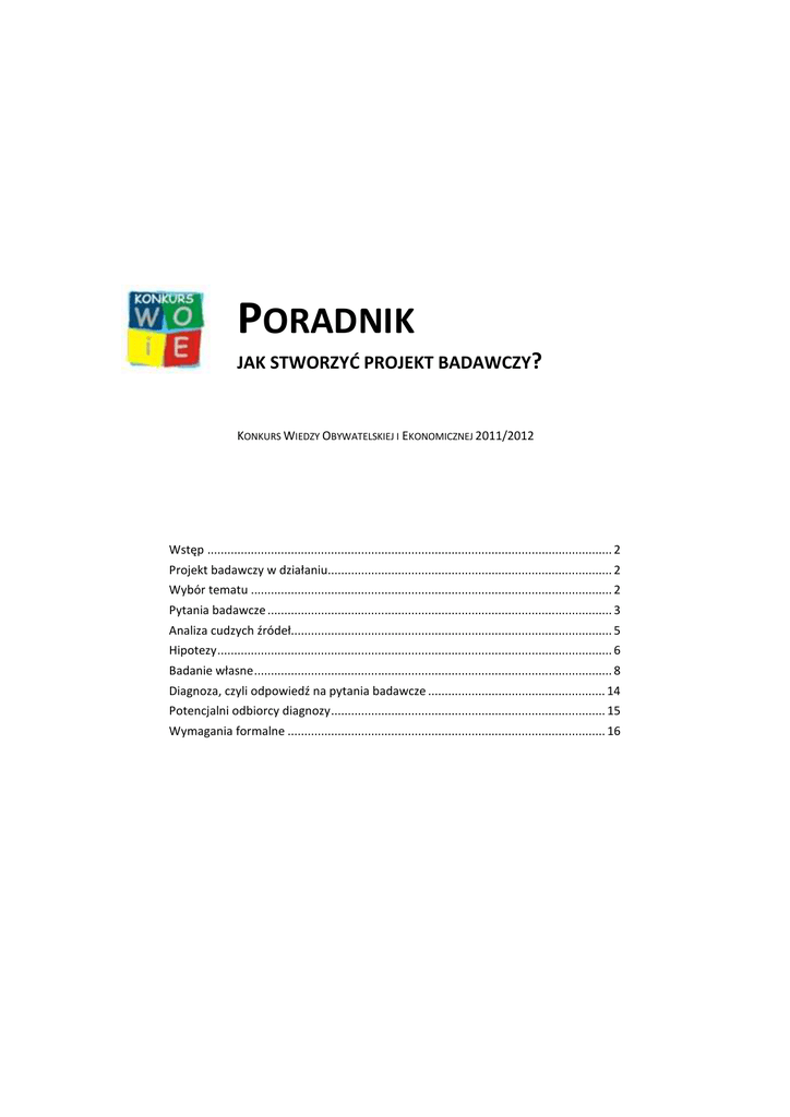 PORADNIK JAK STWORZYĆ PROJEKT BADAWCZY? KONKURS WIEDZY OBYWATELSKIEJ I EKONOMICZNEJ 2011/2012 Wstęp ......................................................................................................................... 2 Projekt badawczy w działaniu..................................................................................... 2 Wybór tematu ............................................................................................................ 2 Pytania badawcze ....................................................................................................... 3 Analiza cudzych źródeł................................................................................................ 5 Hipotezy...................................................................................................................... 6 Badanie własne........................................................................................................... 8 Diagnoza, czyli odpowiedź na pytania badawcze ..................................................... 14 Potencjalni odbiorcy diagnozy.................................................................................. 15 Wymagania formalne ............................................................................................... 16 PORADNIK TWORZENIA PROJEKTU BADAWCZEGO WSTĘP Cel. Poradnik ten pokazuje, w jaki sposób stworzyć projekt badawczy. Struktura. Jest podzielony na rozdziały odpowiadające etapom projektu, które będą podlegały ocenie. W każdym rozdziale znajdziesz: opis zadań z poradami dotyczącymi ich realizacji, elementy, które będą oceniane oraz przykład zapisu, który powinien się pojawić w projekcie po poszczególnych etapach pracy. Przykład projektu. W poradniku znajdziesz nie tylko wyjaśnienia, jak stworzyć projekt. Będziesz mógł także prześledzić realizację przykładowego projektu rozwiązania problemu: na końcu każdego rozdziału znajdziesz propozycję uproszczonego zapisu danego etapu projektu. Sposób korzystania z poradnika. Poradnik warto przeczytać w całości jeszcze przed przystąpieniem do tworzenia projektu. Pozwoli to uniknąć błędów związanych ze skupieniem się na realizacji jednego etapu kosztem innych. Łatwiej ci będzie pracować, gdy będziesz wiedział, co jeszcze pozostało do zrobienia. Pytania? Pisz! Jeśli po lekturze miałbyś dodatkowe pytania czy wątpliwości, podziel się nimi, pisząc na adres: [email protected]. Podyskutuj też o nich z nauczycielem i poszukaj dodatkowych informacji w internecie. PROJEKT BADAWCZY W DZIAŁANIU Wybierz interesujący cię temat badania – zjawisko, które zdiagnozujesz (rozpoznasz). Postaw pytania badawcze, czyli doprecyzuj, czego chcesz się na wybrany temat dowiedzieć. Przeanalizuj źródła, czyli zbierz informacje o badanym zjawisku. Postaw hipotezy, czyli w oparciu o wiedzę, którą do tej pory zdobyłeś, spróbuj odpowiedzieć na pytania badawcze. Wskaż i wyjaśnij, co konkretnie zbadasz (zmienna). Przeprowadź badanie własne, żeby sprawdzić, czy twoje hipotezy sprawdzają się w rzeczywistości. Wskaż zjawiska, które „zmierzysz” i na podstawie których wyciągniesz wnioski dotyczące zmiennych, a przez to – hipotez. Wybierz osoby, które wezmą udział w twoim badaniu. Wybierz narzędzia, które wykorzystasz do przeprowadzenia badania Przygotuj się do „wyjścia w teren”. Przeprowadź badanie. Zgromadź zebrane dane w jednym miejscu. Przeanalizuj wyniki badania. Postaw diagnozę zjawiska, czyli zweryfikuj postawione hipotezy – udziel odpowiedzi na pytania badawcze. Wybierz instytucję lub organizację, która mogłaby wykorzystać twoją diagnozę. WYBÓR TEMATU CO TRZEBA ZROBIĆ? JAKI JEST TEGO CEL? Pierwszą rzeczą, jaką należy zrobić w związku z realizacją projektu jest wybranie jego tematu, czyli nazwanie zjawiska, które będziesz badał. Szczegóły dotyczące tego, jakie elementy tematu będziesz badał i analizował, podasz później – w pytaniach badawczych. 2 PORADNIK TWORZENIA PROJEKTU BADAWCZEGO CO BĘDZIE OCENIANE? • Czy określiłeś temat swojego projektu badawczego? • Czy wybrany temat dotyczy zjawiska społecznego lub jakiejś cechy tego zjawiska? • Czy temat nie jest zbyt szeroki? Czy został zawężony do problemu możliwego do zbadania? JAK WYBRAĆ TEMAT? Czy temat może być dowolny? Nie. Istnieją pewne ograniczenia, np.: • Temat musi dotyczyć zjawiska społecznego lub jakiejś cechy tego zjawiska. Zjawiskiem społecznym jest wszystko, co obserwujemy w rzeczywistości, o charakterze pozytywnym lub negatywnym, np.: - solidarność pokoleń w twojej gminie, - skuteczność działań samorządu uczniowskiego w twojej szkole, - EURO 2012 w twojej gminie, - wpływ środków europejskich na sytuację w twojej gminie, - przyszłość absolwentów twojego gimnazjum. • Temat musi być zawężony. „Korupcja” jest tematem-rzeką, nad którym pracuje sztab ludzi. Z kolei opracowanie projektu na temat „Formy korupcji wśród kwiaciarzy w Skolimowie” jest w twoim zasięgu – sprecyzowaliśmy cechę zjawiska (formy), grupę społeczną (kwiaciarze), miejsce występowania (Skolimów). Jak znaleźć temat? Po pierwsze, zastanów się, co cię interesuje. Najwięcej wiedzy z projektu wyniesiesz ty – wybierz więc takie zjawisko, które jest zgodne z twoimi zainteresowaniami. Możesz skorzystać ze przykładów podanych powyżej, jednak nie zachęcamy do tego. Im ciekawszy temat wybierzesz, tym lepiej dla ciebie i oceny twojego projektu. Po drugie, poszukaj inspiracji w źródłach (np. w dotychczas zrealizowanych badaniach). Temat projektu powinien być istotny, tzn. ma interesować zarówno ciebie, jak i innych ludzi. Wyrazem zainteresowania innych są dyskusje ten temat, artykuły, badania, filmy, audycje itd. Zauważ, że jeśli przed tobą powstał już jakiś obraz badanego zjawiska, będziesz mógł się do niego odnieść w swojej diagnozie – dzięki tem