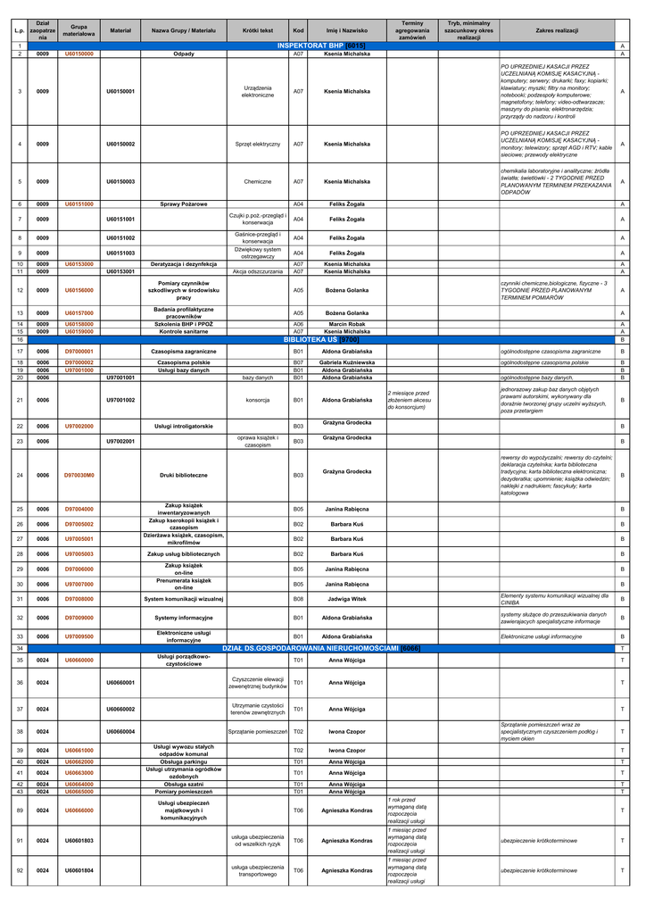 Dział L.p. zaopatrze nia 1 2 0009 Grupa materiałowa Materiał Nazwa Grupy / Materiału Krótki tekst Kod Imię i Nazwisko Terminy agregowania zamówień Tryb, minimalny szacunkowy okres realizacji Zakres realizacji INSPEKTORAT BHP [6015] U60150000 Odpady A07 A A Ksenia Michalska 3 0009 U60150001 Urządzenia elektroniczne A07 Ksenia Michalska PO UPRZEDNIEJ KASACJI PRZEZ UCZELNIANĄ KOMISJĘ KASACYJNĄ komputery; serwery; drukarki; faxy; kopiarki; klawiatury; myszki; filtry na monitory; notebooki; podzespoły komputerowe; magnetofony; telefony; video-odtwarzacze; maszyny do pisania; elektronarzędzia; przyrządy do nadzoru i kontroli 4 0009 U60150002 Sprzęt elektryczny A07 Ksenia Michalska PO UPRZEDNIEJ KASACJI PRZEZ UCZELNIANĄ KOMISJĘ KASACYJNĄ monitory; telewizory; sprzęt AGD i RTV; kable sieciowe; przewody elektryczne A 5 0009 U60150003 Chemiczne A07 Ksenia Michalska chemikalia laboratoryjne i analityczne; źródła światła; świetlówki - 2 TYGODNIE PRZED PLANOWANYM TERMINEM PRZEKAZANIA ODPADÓW A 6 0009 A04 Feliks Żogała A A04 Feliks Żogała A A04 Feliks Żogała A A04 Feliks Żogała A A07 A07 Ksenia Michalska Ksenia Michalska A A A05 Bożena Golanka A05 Bożena Golanka A A06 A07 Marcin Robak Ksenia Michalska A A B Sprawy Pożarowe U60151000 7 0009 U60151001 8 0009 U60151002 Czujki p.poż.-przegląd i konserwacja Gaśnice-przegląd i konserwacja Dźwiękowy system ostrzegawczy 9 0009 10 11 0009 0009 U60153000 U60151003 12 0009 U60156000 13 0009 U60157000 14 15 16 0009 0009 U60158000 U60159000 17 0006 D97000001 Czasopisma zagraniczne B01 Aldona Grabiańska 18 19 20 0006 0006 0006 D97000002 U97001000 Czasopisma polskie Usługi bazy danych Gabriela Kuźniewska Aldona Grabiańska Aldona Grabiańska 21 0006 Aldona Grabiańska 22 0006 23 0006 Deratyzacja i dezynfekcja U60153001 Akcja odszczurzania Pomiary czynników szkodliwych w środowisku pracy Badania profilaktyczne pracowników Szkolenia BHP i PPOŻ Kontrole sanitarne czynniki chemiczne,biologiczne, fizyczne - 3 TYGODNIE PRZED PLANOWANYM TERMINEM POMIARÓW BIBLIOTEKA UŚ [9700] U97001001 bazy danych B07 B01 B01 U97001002 konsorcja B01 Usługi introligatorskie U97002000 B03 oprawa książek i czasopism U97002001 24 0006 D970030M0 25 0006 D97004000 26 0006 D97005002 27 0006 U97005001 28 0006 U97005003 Druki biblioteczne B03 B03 Zakup książek inwentaryzowanych Zakup kserokopii książek i czasopism Dzierżawa książek, czasopism, mikrofilmów Zakup usług bibliotecznych Zakup książek on-line Prenumerata książek on-line A ogólnodostępne czasopisma zagraniczne B ogólnodostępne czasopisma polskie B B B ogólnodostępne bazy danych, 2 miesiące przed złożeniem akcesu do konsorcjum) A jednorazowy zakup baz danych objętych prawami autorskimi, wykonywany dla doraźnie tworzonej grupy uczelni wyższych, poza przetargiem Grażyna Grodecka B B Grażyna Grodecka B rewersy do wypożyczalni; rewersy do czytelni; deklaracja czytelnika; karta biblioteczna tradycyjna; karta biblioteczna elektroniczna; dezyderatka; upomnienie; książka odwiedzin; naklejki z nadrukiem; fascykuły; karta katologowa Grażyna Grodecka B B05 Janina Rabięcna B B02 Barbara Kuś B B02 Barbara Kuś B B02 Barbara Kuś B B05 Janina Rabięcna B B05 Janina Rabięcna B 29 0006 D97006000 30 0006 U97007000 31 0006 D97008000 System komunikacji wizualnej B08 Jadwiga Witek Elementy systemu komunikacji wizualnej dla CINIBA B 32 0006 D97009000 Systemy informacyjne B01 Aldona Grabiańska systemy służące do przeszukiwania danych zawierajacych specjalistyczne informacje B 33 0006 U97009500 Elektroniczne usługi informacyjne B01 Aldona Grabiańska Elektroniczne usługi informacyjne B DZIAŁ DS.GOSPODAROWANIA NIERUCHOMOŚCIAMI [6066] 34 Usługi porządkowoczystościowe T01 Anna Wójciga T Czyszczenie elewacji zewenętrznej budynków T01 Anna Wójciga T U60660002 Utrzymanie czystości terenów zewnętrznych T01 Anna Wójciga T U60660004 Sprzątanie pomieszczeń T02 Iwona Czopor T02 Iwona Czopor T T01 Anna Wójciga T T01 Anna Wójciga T T01 T01 Anna Wójciga Anna Wójciga T T T06 Agnieszka Kondras 1 rok przed wymaganą datą rozpoczęcia realizacji usługi Agnieszka Kondras 1 miesiąc przed wymaganą datą rozpoczęcia realizacji usługi ubezpieczenie krótkoterminowe T Agnieszka Kondras 1 miesiąc przed wymaganą datą rozpoczęcia realizacji usługi ubezpieczenie krótkoterminowe T 35 0024 36 0024 U60660001 37 0024 38 0024 39 0024 U60661000 40 0024 U60662000 41 0024 U60663000 42 43 0024 0024 U60664000 U60665000 89 0024 U60666000 91 92 0024 0024 T U60660000 Usługi wywozu stałych odpadów komunal Obsługa parkingu Usługi utrzymania ogródków ozdobnych Obsługa szatni Pomiary pomieszczeń Usługi ubezpieczeń majątkowych i komunikacyjnych U60601803 usługa ubezpieczenia od wszelkich ryzyk U60601804 usługa ubezpieczenia transportowego T06 T06 Sprzątanie pomieszczeń wraz ze specjalistycznym czyszczeniem podłóg i myciem okien T T Dział L.p. zaopatrze nia Grupa materiałowa Materiał Nazwa Grupy / Materiału Krótki tekst Kod Imię i Nazwisko Terminy agregowania zamówień Tryb, minimalny szacunkowy okres realizacji Zakres realizacji Agnieszka Kondras 1 miesiąc przed wymaganą datą rozpoczęcia realizacji usługi ubezpieczenie krótkoterminowe T 93 0024 U60601805 usługa ubezpieczenia pojazdów mechanicznych 94 0024 U60601806 usługa ubezpieczenia od uszkodzenia lub utraty T06 Agnieszka Kondras 1 miesiąc przed wymaganą datą rozpoczęcia realizacji usługi ubezpieczenie krótkoterminowe T 95 0024 U60601807 usługa ubezpieczenia od ognia T06 Agnieszka Kondras 1 miesiąc przed wymaganą datą rozpoczęcia realizacji usługi ubezpieczenie krótkoterminowe T 96 0024 U60601808 usługa ubezpieczenia od skutków żywiołów T06 Agnieszka Kondras 1 miesiąc przed wymaganą datą rozpoczęcia realizacji usługi ubezpieczenie krótkoterminowe T U60601809 usługa ubezpieczenia od odpowiedzialności cywilnej Agnieszka Kondras 1 miesiąc przed wymaganą datą rozpoczęci
