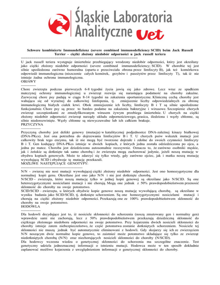 Schwere kombinierte Immundefizienz (severe combined immunodeficiency SCID) beim Jack Russell Terrier - ciężki złożony niedobór odporności u jack russell teriera ======================================================== U jack russell teriera występuje śmiertelnie przebiegający wrodzony niedobór odporności, który jest określany jako ciężki złożony niedobór odporności (severe combined immunodeficiency; SCID). W chorobie tej jest silnie upośledzona zarówno humoralna (oparta o przeciwciała obrona przez limfocyty B), jak też komórkowa odpowiedź immunologiczna (niszczenie całych komórek, grzybów i pasożytów przez limfocyty T), tak iż nie istnieje żadna ochrona immunologiczna. OBJAWY -----------Chore zwierzęta podczas pierwszych 6-8 tygodni życia jawią się jako zdrowe. Lecz wraz ze spadkiem matczynej ochrony immunologicznej u zwierząt rozwija się narastająca podatność na choroby zakaźne. Zazwyczaj chore psy padają w ciągu 8-14 tygodni na zakażenia oportunistyczne. Kliniczną cechą choroby jest wahająca się od wyraźnej do całkowitej limfopenia, tj. zmiejszenie liczby odpowiedzialnych za obronę immunologiczną białych ciałek krwi. Obok zmniejszenie ich liczby, limfocyty B i T są silnie upośledzone funkcjonalnie. Chore psy są przez to bardzo podatne na zakażenia bakteryjne i wirusowe. Szczepienie chorych zwierząt szczepionkami ze zmodyfikowanym wirusem żywym przebiega śmiertelnie. U chorych na ciężki złożony niedobór odporności zwierząt narządy układu odpornościowego, grasica, śledziona i węzły chłonne, są silnie niedorozwinięte. Węzły chłonne są niewyczuwalne lub ich całkiem brakuje. PRZYCZYNA ---------------Przyczyną choroby jest defekt genowy (mutacja) w katalitycznej podjednostce DNA-zależnej kinazy białkowej (DNA-PKcs). Jest ona potrzebna do dojrzewania limfocytów B i T. U chorych psów wskutek mutacji jest całkowity brak tego enzymu, tak iż nie mogą być tworzone dojrzałe i zdolne do swoich czynności limfocyty B i T. Gen kodujący DNA-PKcs istnieje w dwóch kopiach, z których jedna została odziedziczona po ojcu, a jedna po matce. Choroba jest dziedziczona autosomalnie recesywnie. Oznacza to, że zarówno osobniki męskie, jak i żeńskie są dotknięte tak samo chorobą i że zwierzęta mogą zachorować jedynie, jeżeli noszą mutację w obydwu kopiach genowych. Może to zdarzyć się tylko wtedy, gdy zarówno ojciec, jak i matka noszą mutację wywołującą SCID i obydwoje tę mutację przekazali. MOŻLIWE NASTĘPUJĄCE GENOTYPY: -------------------------------------------------N/N - zwierzę nie nosi mutacji wywołującej ciężki złożony niedobór odporności. Jest ono homozygotyczne dla normalnej kopii genu. Określane jest ono jako N/N i nie jest dotknięte chorobą. N/SCID - zwierzęta, które noszą mutację tylko w jednej kopii genowej są określane jako N/SCID. Są one heterozygotycznymi nosicielami mutacji i nie chorują. Mogą one jednak z 50% prawdopodobieństwem przenosić skłonność do choroby na swoje potomstwo. SCID/SCID – zwierzęta, u których obydwie kopie genowe noszą mutację wywołującą chorobę, są określane w wyniku badania jako SCID/SCID, tj. dotknięte schorzeniem. Są one homozygotycznymi nosicielami mutacji i chorują na ciężki złożony niedobór odporności. Przekazują one ze 100% prawdopodobieństwem skłonność do choroby na swoje potomstwo. HODOWLA ---------------Dla hodowli decydujące jest to, iż nosiciele skłonności do schorzenia (noszą zmutowany gen i normalny gen) wprawdzie sami nie zachorują, lecz z 50% prawdopodobieństwem przekazują dziedziczną skłonność do ciężkiego złożonego niedoboru odporności na swoje potomstwo. Przy kojarzeniu dwóch nosicieli skłonności do choroby istnieje zatem niebezpieczeństwo, że część potomstwa zostanie dotkniętych schorzeniem. Nosiciele tej skłonności nie muszą jednak być automatycznie eliminowani z hodowli. Gdy skojarzy się ich ze zwierzęciem N/N noszącym dwie normalne kopie genowe, to zaistnieć może potomstwo składające się tylko ze zwierząt niedotkniętych chorobą (N/N) oraz niechorujących nosicieli skłonności do choroby (N/SCID). Dla hodowcy wczesna wiedza o genetycznej skłonności do schorzenia ma szczególne znaczenie. Test genetyczny udziela jednoznacznej informacji o istnieniu mutacji. Hodowca może w ten sposób dokładnie zaplanować możliwe kojarzenia z uwzględnieniem informacji o genetycznej skłonności do choroby. SCHEMAT KRZYŻOWANIA Osobnik rodzicielski 2 Osobnik rodzicielski 1 N/N ZDROWY N/SCID NOSCIEL SCID/SCID CHORY N/N ZDROWY 100 % zdrowe 50% zdrowe 50% nosiciele 100% nosiciele N/SCID NOSICIEL 50 % zdrowe 50% nosiciele 25% zdrowe 50% nosiciele 25% chore 50% nosiciele 50% chore SCID/SCID CHORY 100% nosiciele 50% nosiciele 50% chore 100% chore PRZEPROWADZENIE BADANIA ----------------------------------------Jako materiał do badania w rachubę wchodzi wymaz ze śluzówki policzka lub też 0,5 ml krwi wersenianowej. O dokładnym pobieraniu próbek informuje osobna ulotka informacyjna. Wynik badania jest z reguły w ciągu 14-21 dni. Na żądanie zleceniodawca otrzymuje materiał do pobrania wymazu policzkowego.