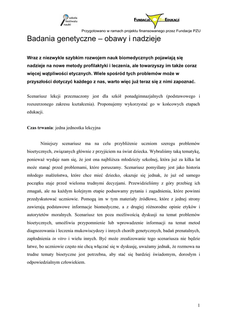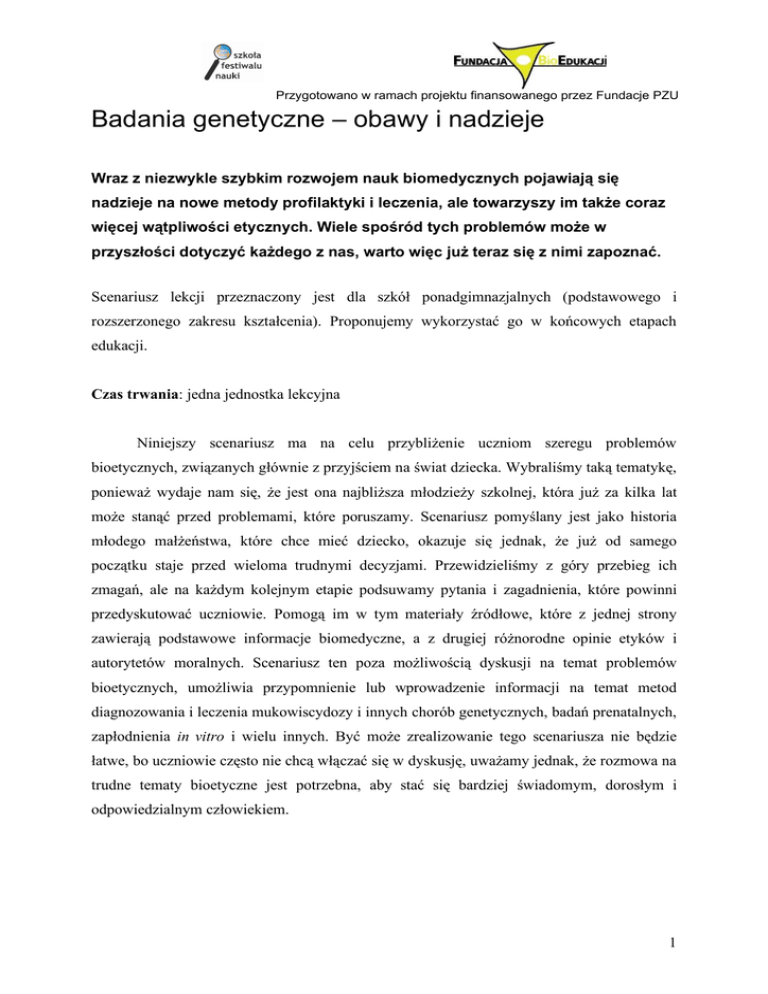 Przygotowano w ramach projektu finansowanego przez Fundacje PZU Badania genetyczne – obawy i nadzieje Wraz z niezwykle szybkim rozwojem nauk biomedycznych pojawiają się nadzieje na nowe metody profilaktyki i leczenia, ale towarzyszy im także coraz więcej wątpliwości etycznych. Wiele spośród tych problemów może w przyszłości dotyczyć każdego z nas, warto więc już teraz się z nimi zapoznać. Scenariusz lekcji przeznaczony jest dla szkół ponadgimnazjalnych (podstawowego i rozszerzonego zakresu kształcenia). Proponujemy wykorzystać go w końcowych etapach edukacji. Czas trwania: jedna jednostka lekcyjna Niniejszy scenariusz ma na celu przybliżenie uczniom szeregu problemów bioetycznych, związanych głównie z przyjściem na świat dziecka. Wybraliśmy taką tematykę, ponieważ wydaje nam się, że jest ona najbliższa młodzieży szkolnej, która już za kilka lat może stanąć przed problemami, które poruszamy. Scenariusz pomyślany jest jako historia młodego małżeństwa, które chce mieć dziecko, okazuje się jednak, że już od samego początku staje przed wieloma trudnymi decyzjami. Przewidzieliśmy z góry przebieg ich zmagań, ale na każdym kolejnym etapie podsuwamy pytania i zagadnienia, które powinni przedyskutować uczniowie. Pomogą im w tym materiały źródłowe, które z jednej strony zawierają podstawowe informacje biomedyczne, a z drugiej różnorodne opinie etyków i autorytetów moralnych. Scenariusz ten poza możliwością dyskusji na temat problemów bioetycznych, umożliwia przypomnienie lub wprowadzenie informacji na temat metod diagnozowania i leczenia mukowiscydozy i innych chorób genetycznych, badań prenatalnych, zapłodnienia in vitro i wielu innych. Być może zrealizowanie tego scenariusza nie będzie łatwe, bo uczniowie często nie chcą włączać się w dyskusję, uważamy jednak, że rozmowa na trudne tematy bioetyczne jest potrzebna, aby stać się bardziej świadomym, dorosłym i odpowiedzialnym człowiekiem. 1 Cele lekcji: Wiadomości - uczeń: wyjaśnia pojęcie bioetyki, podaje przykłady problemów bioetycznych. Umiejętności - uczeń: formułuje własne sądy i opinie, skutecznie porozumiewa się w różnych sytuacjach i prezentuje własny punkt widzenia, wartościuje działania dotyczące ważnych społecznie spraw zdrowia i wykorzystania badań naukowych, potrafi krytycznie oceniać informacje docierające z różnych źródeł, poprawnie stosuje terminologię biologiczną. Postawy – uczeń: uwzględnia i szanuje poglądy innych, uzmysławia sobie własne stanowisko wobec stosowania badań prenatalnych, diagnostyki genetycznej, zapłodnienia in vitro. Formy pracy: indywidualna Metody nauczania: słowne: pogadanka, dyskusja, praca z tekstem Środki dydaktyczne: materiały źródłowe przygotowane przez nauczyciela Przeprowadzenie zajęć: Scenariusz podzielony jest na cztery części, aby można było kontrolować przebieg lekcji. Z pewnych części można zrezygnować, można podzielić scenariusz na kilka zajęć, można wybraną część przekazać uczniom do przemyślenia w domu. Do tekstu, który jest historią młodego małżeństwa, dołączyliśmy teksty źródłowe i dane, dzięki którym uczniowie będą mogli prowadzić świadomą dyskusję. Teksty źródłowe sugerujemy dać uczniom wcześniej, aby mogli zapoznać się z nimi w domu. 2 Dobrym pomysłem, który pomaga w przeprowadzeniu lekcji, jest przygotowanie dla każdego ucznia dwóch kartoników do głosowania na „tak” i na „nie”. Podnosząc je, uczniowie będą określać swoje stanowisko wobec zadanego pytania. Dzięki temu nauczyciel może udzielać głosu na przemian zwolennikom i przeciwnikom omawianego rozwiązania, a dodatkowo wszyscy uczniowie są zmuszeni do choćby symbolicznego udziału w dyskusji. Należy podkreślić, że poruszane kwestie to problemy złożone i każdy uczeń może mieć na nie swoją własną odpowiedź, nie ma jednej „prawidłowej”. Niezbędne jest ustalenie na początku lekcji, co rozumiemy pod pojęciem bioetyki. Można poprosić uczniów, aby wcześniej sprawdzili definicje w różnych źródłach. Oczywiście definicji jest bardzo dużo, oto jedna z propozycji, najbardziej „biologiczna”. BIOETYKA - (gr.bios ‘życie’ i ēthikē ‘moralność’) – jest nauką zajmującą się badaniem problemów etycznych związanych z szeroko pojętymi naukami biomedycznymi, powstających w związku z szybkim postępem w tych dziedzinach. CZĘŚĆ I Co powinienem powiedzieć mojej żonie? Donata i Dobrogost Kowalscy są młodym małżeństwem i planują mieć dzieci. Dobrogosta dręczą jednak pewne obawy, o których nie wie Donata. Jego starszy brat urodził się z poważną chorobą genetyczną – mukowiscydozą i wkrótce potem zmarł. Dobrogost jest zdrowy, jednak niedawno w związku z planowanym małżeństwem zrobił badania, które wykazały, że jest nosicielem jednej wadliwej kopii genu powodującego mukowiscydozę. Oznacza to, że jeśli jego żona również jest nosicielką, ich dzieci mogą urodzić się chore. W Polsce co dwudziesta osoba jest nosicielem mukowiscydozy, Donata również może się do nich zaliczać. Dobrogost boi się, że Donata nie będzie chciała mieć z nim dzieci, jeśli okaże się nosicielką wadliwego genu. Zastanawia się, czy w ogóle mówić jej o swoim problemie, w końcu o wiele bardziej prawdopodobne jest to, że Donata nie jest nosicielką. W Polsce zgodnie z obowiązującym prawem ludzie, którzy mają podobne problemy, mogą poradzić się lekarza i wykwalifikowanych pracowników poradni psychologicznych. 3 Pytania: * Czy Dobrogost powinien powiedzieć żonie o chorobie brata i o tym, że sam jest nosicielem? * Czy lekarz, który przeprowadził badania u Dobrogosta, powinien poinformować Donatę o ich wyniku, nawet jeśli Dobrogost postanowił zachować tajemnicę? * Czy diagnostyka chorób genetycznych powinna być prowadzona rutynowo? Czy wyniki tych bad
