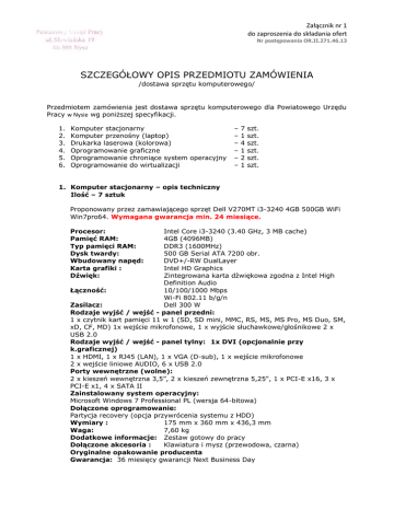 Załącznik nr 1 do zaproszenia do składania ofert Nr postępowania OR.II.271.46.13 SZCZEGÓŁOWY OPIS PRZEDMIOTU ZAMÓWIENIA /dostawa sprzętu komputerowego/ Przedmiotem zamówienia jest dostawa sprzętu komputerowego dla Powiatowego Urzędu Pracy w Nysie wg poniższej specyfikacji. 1. 2. 3. 4. 5. 6. Komputer stacjonarny Komputer przenośny (laptop) Drukarka laserowa (kolorowa) Oprogramowanie graficzne Oprogramowanie chroniące system operacyjny Oprogramowanie do wirtualizacji – – – – – – 7 1 4 1 2 1 szt. szt. szt. szt. szt. szt. 1. Komputer stacjonarny – opis techniczny Ilość – 7 sztuk Proponowany przez zamawiającego sprzęt Dell V270MT i3-3240 4GB 500GB WiFi Win7pro64. Wymagana gwarancja min. 24 miesiące. Procesor: Pamięć RAM: Typ pamięci RAM: Dysk twardy: Wbudowany napęd: Karta grafiki : Dźwięk: Intel Core i3-3240 (3.40 GHz, 3 MB cache) 4GB (4096MB) DDR3 (1600MHz) 500 GB Serial ATA 7200 obr. DVD+/-RW DualLayer Intel HD Graphics Zintegrowana karta dźwiękowa zgodna z Intel High Definition Audio Łączność: 10/100/1000 Mbps Wi-Fi 802.11 b/g/n Zasilacz: Dell 300 W Rodzaje wyjść / wejść - panel przedni: 1 x czytnik kart pamięci 11 w 1 (SD, SD mini, MMC, RS, MS, MS Pro, MS Duo, SM, xD, CF, MD) 1x wejście mikrofonowe, 1 x wyjście słuchawkowe/głośnikowe 2 x USB 2.0 Rodzaje wyjść / wejść - panel tylny: 1x DVI (opcjonalnie przy k.graficznej) 1 x HDMI, 1 x RJ45 (LAN), 1 x VGA (D-sub), 1 x wejście mikrofonowe 2 x wejście liniowe AUDIO, 6 x USB 2.0 Porty wewnętrzne (wolne): 2 x kieszeń wewnętrzna 3,5”, 2 x kieszeń zewnętrzna 5,25", 1 x PCI-E x16, 3 x PCI-E x1, 4 x SATA II Zainstalowany system operacyjny: Microsoft Windows 7 Professional PL (wersja 64-bitowa) Dołączone oprogramowanie: Partycja recovery (opcja przywrócenia systemu z HDD) Wymiary : 175 mm x 360 mm x 436,3 mm Waga: 7,60 kg Dodatkowe informacje: Zestaw gotowy do pracy Dołączone akcesoria : Klawiatura i mysz (przewodowa, czarna) Oryginalne opakowanie producenta Gwarancja: 36 miesięcy gwarancji Next Business Day 2. Komputer przenośny (laptop) – opis techniczny Ilość – 1 sztuk Proponowany przez zamawiającego sprzęt Dell Inspiron 17R. Procesor: Intel® Core™ i7-4500U czwartej generacji (4 MB pamięci podręcznej, do 3,0 GHz) System operacyjny: Windows 8.1 64bit, Polska Wyświetlacz: 17,3 cala z podświetleniem LED i technologią TrueLife o rozdzielczości HD+ (1600 x 900) Pamięć: 8 GB2 DDR3L przy 1600 MHz Dysk twardy: Serial ATA 1 TB (5400 obr./min) Napęd optyczny: 8X DVD-ROM - Slimline Karta graficzna: AMD Radeon™ HD 8870M, 2 GB pamięci GDDR5 Sieć bezprzewodowa Karta Dell™ Wireless 1705 802.11b/g/n z modułem Bluetooth 4.0 Bateria podstawowa: 6-ogniwowy akumulator litowo-jonowy (65 Wh) Gwarancja: 36 miesięcy + 1 rok Next Business Day Waga: 2.73 kg 3. Drukarka laserowa (kolorowa) Ilość – 4 sztuk Proponowany przez zamawiającego sprzęt Samsung CLP-680ND Wymagana gwarancja min. 24 miesiące. Drukowanie Jednoprzyciskowy tryb eko, bezpośredni port USB, funkcja drukowania z urządzeń przenośnych Ogólne Dwurdzeniowy procesor (główny: ARM11 533 MHz / pomocniczy: ARM9 150 MHz) 2-wierszowy wyświetlacz LCD Hi-Speed USB 2.0, Host USB, Ethernet 10 / 100 / 1000 Base-TX Poziom hałasu: Poniżej 52 dBA (drukowanie) / Poniżej 32 dBA (tryb czuwania) Pamięć 256 MB (maks. 512 MB) Kompatybilność z: Windows 2003 / 2008 / XP / Vista / 7 / 2003 Server / 2 Server /2008 Server R2 / Mac OS X 10.4-10.7 / różne Linux, system operacyjny UNIX Miesięczny cykl pracy: 60 000 ilustracji Wymiary 420 x 452,5 x 311,3 mm Waga 20,15 kg Zużycie energii: 450 W (średnio) / 10 W (tryb czuwania) / 1 W (tryb uśpienia) / 1,49 kWH (TEC) Drukowanie Szybkość drukowania (tryb czarno-biały): Do 24 str./min w A4 (25 str./min w formacie Letter) Szybkość drukowania (tryb kolorowy): Do 24 str./min w A4 (25 str./min w formacie Letter) Szybkość drukowania (tryb czarno-biały): poniżej 17 sekund (w trybie gotowości) Szybkość drukowania (tryb kolorowy): poniżej 17 sekund (w trybie gotowości) Do 9 600 x 600 dpi rozdzielczości efektywnej (600 x 600 x 4 bit) Emulacja: PCL5Ce / PCL6C / PS3 / PDF V1.7 / SPL-C (Samsung Printer Language Color) Wbudowana funkcja druku dwustronnego Materiały eksploatacyjne Zużycie materiałów eksploatacyjnych (mono): Standardowa wydajność tonera: 2 000 standardowych stron (drukarka dostarczana z zasobnikiem startowym na 2 000 stron) / Wysoka wydajność tonera: 6 000 standardowych stron * Deklarowana wydajność zasobnika zgodnie z ISO/IEC 19798 Zużycie materiałów eksploatacyjnych (kolor): Standardowa wydajność tonera: 1 500 standardowych stron (drukarka dostarczana z zasobnikiem startowym na 1 500 stron) / Wysoka wydajność tonera: 3 500 standardowych stron Deklarowana wydajność zasobnika zgodnie z ISO / IEC 19798 Pas transferowy: Ok. 100 000 stron Pojemnik na zużyty toner: Ok. 14 000 ilustracji (w czerni i bieli) / 3 500 ilustracji (w kolorze) Podajniki papieru Rodzaj i pojemność podajnika standardowa kaseta na 250 arkuszy / podajnik wielozadaniowy na 50 arkuszy (maks. 820 arkuszy) Rodzaj i pojemność podajnika odbiorczego: 150 arkuszy drukiem do dołu Rozmiar papieru: A4 / Letter / Legal / Oficio / Folio / JIS B5 / ISO B5 / Executive / A5 / raport / A6 / karty / pocztówka / koperta Monarch / koperta No-10 / koperta DL / koperta C5 / koperta C6 / koperta No 9 / użytkownika [76 x 127 mm ~ 216 x 356 mm] Rodzaj papieru: zwykły papier / cienki papier / gruby papier / karty / grubszy papier / dziurkowany / przezrocza / zadrukowany / firmowy / recyklingowy / archiwalny / bond / etykiety / koperta / bawełniany / kolorowy / błyszczący Pojemność podajnika kopert: 20 arkuszy 4. Oprogramowanie graficzne: Ilość sztuk - 1 Proponowany przez zamawiającego produkt CorelDraw Graphics Suite X5 Special Edition Pakiet zawiera: CorelDRAW X5, Corel PHOTO-PAINT X5, Corel PowerTRACE X5, Corel CAPTURE X5. Pakiet CorelDRAW Graphics Suite X5 Special Edi