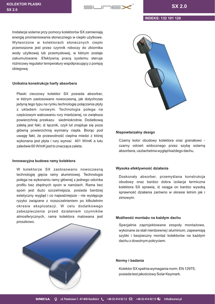 KOLEKTOR PŁASKI SX 2.0 SX 2.0 INDEKS: 132 101 120 Instalacje solarne przy pomocy kolektorów SX zamieniają energię promieniowania słonecznego w ciepło użytkowe. Wytworzone w kolektorach słonecznych ciepło przenoszone jest przez czynnik roboczy do zbiornika wody użytkowej lub przemysłowej, w którym zostaje zakumulowane. Efektywną pracą systemu steruje różnicowy regulator temperatury współpracujący z pompą obiegową. Unikalna konstrukcja harfy absorbera Płaski cieczowy kolektor SX posiada absorber, w którym zastosowano nowoczesną, jak dotychczas jedyną tego typu na rynku technologię połączenia płyty z układem rurowym. Technologia polega na częściowym walcowaniu rury miedzianej, co zwiększa powierzchnię przekazu siedmiokrotnie. Dodatkową zaletą jest fakt, iż łącznik, czyli lut znajduje się poza główną powierzchnią wymiany ciepła. Biorąc pod uwagę fakt, że przewodność cieplna miedzi z której wykonana jest płyta i rury wynosi 401 W/mK a lutu zaledwie 60 W/mK jest to znacząca zaleta. Niepowtarzalny design Czarny kolor obudowy kolektora oraz granatowo czarny odcień widocznego przez szybę solarną absorbera, uszlachetnia wygląd każdego dachu. Innowacyjna budowa ramy kolektora W kolektorze SX zastosowano nowoczesną technologię gięcia ramy aluminiowej. Technologia polega na wykonaniu ramy głównej z jednego odcinka profilu bez zbędnych spoin w narożach. Rama bez spoin jest dużo szczelniejsza, posiada bardziej estetyczny wygląd i co najważniejsze - nie występuje ryzyko związane z rozszczelnieniem po kilkuletnim okresie eksploatacji. W celu dodatkowego zabezpieczenia przed działaniem czynników atmosferycznych, rama kolektora malowana jest proszkowo. Wysoka efektywność działania Doskonały absorber, przemyślana konstrukcja obudowy oraz bardzo dobra izolacja termiczna kolektora SX sprawia, iż osiąga on bardzo wysoką sprawność działania zarówno w okresie letnim jak i zimowym. Możliwość montażu na każdym dachu Specjalnie zaprojektowane zespoły montażowe, wykonane ze stali nierdzewnej i aluminium, zapewniają szybki i bezpieczny montaż kolektorów na każdym dachu z dowolnym pokryciem. Normy i badania Kolektor SX spełnia wymagania norm: EN 12975; posiada test jakościowy Solar Keymark. KOLEKTOR PŁASKI SX 2.0 SX 2.0 Podstawowe dane techniczne: Typ: Kolektor cieczowy płaski SX 2.0 Zastosowanie: Wspomaganie przygotowania c.w.u. Wspomaganie ogrzewania podłogowego Wspomaganie ogrzewania basenów Zgodność z normą 1902 mm 1063 mm 100 mm 38 kg 2,0 m2 1,85 m2 1,84 m2 Aluminium (bez spoin) Klej 1902 Blacha aluminiowa gr.0,4 mm Miedź 0,2 mm wysokoselektywna 0,95 0,05 1,4 l Harfa podwójna 10 x Ø8 x 0,5 mm 2 x Ø22 x 1,0 mm 2 Szkło solarne hartowane 4 mm 0,905 Wełna mineralna 40 mm 20 mm 1063 Max. 204,4°C 6 bar 78,8 % tak 25 l/m2xh Do 7 kolektorów (zalecane do 5) 100 Wymiary: Długość Szerokość Wysokość: Ciężar: Powierzchnie: Powierzchnia brutto Powierzchnia otworu Powierzchnia absorbera Rama : Materiał ramy: Materiał uszczelniający: Dno kolektora: Materiał: Absorber: Materiał: Grubość: Warstwa selektywna: Stopień absorbcji: Stopień emisji: Pojemność absorbera Forma przepływu: Rury podłużne absorbera: Rury zbiorcze Liczba przyłączy Szyba: Rodzaj: Grubość: Stopień transmisji Izolacja cieplna: Materiał: Grubość przy ścianie tylnej: Grubość przy ścianie bocznej: Dane dodatkowe: Temperatura postojowa Max. ciśnienie robocze Sprawność kolektora η0 Mikrowentylacja Zalecany przepływ Połączenie w 1 rzędzie Dostępność kolorów: Czarny Dostępność montażu: RAL 9005 Dach Taras Fundament Ściana EN 12975 1063 800 W/m2 0,9 70 0,8 60 0,7 50 0,6 0,5 40 ηo mbar Wykres strat ciśnienia 80 0,4 30 0,3 20 0,2 10 0,1 0 0 50 100 150 200 250 300 350 400 0 0 20 40 60 80 100 120 140 160 180 ∆T, K l/h Q1 = 3,522 [W/m2xK] Q 2 = 0,010 [W/m2xK2] Typ Kolektor SX 2.0 Uwagi Numer kat. 132 101 120