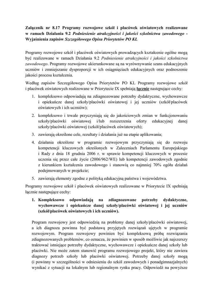Załącznik nr 8.17 Programy rozwojowe szkół i placówek oświatowych realizowane w ramach Działania 9.2 Podniesienie atrakcyjności i jakości szkolnictwa zawodowego Wyjaśnienia zapisów Szczegółowego Opisu Priorytetów PO KL Programy rozwojowe szkół i placówek oświatowych prowadzących kształcenie ogólne mogą być realizowane w ramach Działania 9.2 Podniesienie atrakcyjności i jakości szkolnictwa zawodowego. Programy rozwojowe ukierunkowane są na wyrównywanie szans edukacyjnych uczniów i zmniejszanie dysproporcji w ich osiągnięciach edukacyjnych oraz podnoszenie jakości procesu kształcenia. Według zapisów Szczegółowego Opisu Priorytetów PO KL Programy rozwojowe szkół i placówek oświatowych realizowane w Priorytecie IX spełniają łącznie następujące cechy: 1. kompleksowo odpowiadają na zdiagnozowane potrzeby dydaktyczne, wychowawcze i opiekuńcze danej szkoły/placówki oświatowej i jej uczniów (szkół/placówek oświatowych i ich uczniów); 2. kompleksowo i trwale przyczyniają się do jakościowych zmian w funkcjonowaniu szkoły/placówki oświatowej i/lub rozszerzenia oferty edukacyjnej danej szkoły/placówki oświatowej (szkół/placówek oświatowych); 3. zawierają określone cele, rezultaty i działania już na etapie aplikowania; 4. działania określone w programie rozwojowym przyczyniają się do rozwoju kompetencji kluczowych określonych w Zaleceniach Parlamentu Europejskiego i Rady z dnia 18 grudnia 2006 r. w sprawie kompetencji kluczowych w procesie uczenia się przez całe życie (2006/962/WE) lub kompetencji zawodowych zgodnie z kierunkiem kształcenia zawodowego i stanowią co najmniej 70% ogółu działań podejmowanych w projekcie; 5. zawierają elementy zgodne z polityką edukacyjną państwa i województwa. Programy rozwojowe szkół i placówek oświatowych realizowane w Priorytecie IX spełniają łącznie następujące cechy: 1. Kompleksowo odpowiadają na zdiagnozowane potrzeby dydaktyczne, wychowawcze i opiekuńcze danej szkoły/placówki oświatowej i jej uczniów (szkół/placówek oświatowych i ich uczniów). Program rozwojowy jest odpowiedzią na problemy danej szkoły/placówki oświatowej, a ich diagnoza powinna być podstawą przyjętych rozwiązań ujętych w programie rozwojowym. Program rozwojowy powinien być kompleksową próbą rozwiązania zdiagnozowanych problemów, co oznacza, że powinien w sposób możliwie jak najszerszy traktować istniejące potrzeby dydaktyczne, wychowawcze i opiekuńcze danej szkoły lub placówki. Nie może zatem stanowić programu rozwojowego projekt, który nie zawiera diagnozy potrzeb szkoły lub placówki oświatowej. Potrzeby danej szkoły mogą (i powinny w szczególności w odniesieniu do szkól zawodowych i ponadgimnazjalnych) wynikać z sytuacji na lokalnym lub regionalnym rynku pracy. Odpowiedź na powyższe potrzeby powinna skutkować rozszerzeniem oferty edukacyjnej danej szkoły lub prowadzić do podniesienia jakości świadczonych usług edukacyjnych. Warunkiem spełnienia powyższej przesłanki jest realizacja programu rozwojowego w ramach działalności szkoły (w odróżnieniu do projektów realizowanych w Priorytecie III, w którym zajęcia mogą odbywać się poza szkołą). 2. Kompleksowo i trwale przyczyniają się do jakościowych zmian w funkcjonowaniu szkoły/placówki oświatowej i/lub rozszerzenia oferty edukacyjnej danej szkoły/placówki oświatowej (szkół/placówek oświatowych). W zależności od analizy potrzeb i polityki edukacyjnej danej szkoły lub placówki oświatowej może ona stworzyć program rozwojowy ukierunkowany na: reformę szkoły, w celu podniesienia jakości i atrakcyjności dotychczasowej oferty i/lub program rozwojowy ukierunkowany na rozszerzenie oferty edukacyjnej, w celu dopasowania tej oferty do potrzeb lokalnego/regionalnego rynku pracy. Oba podejścia do programu rozwojowego wpisują się w cele Działania 9.2. Kompleksowe podejście do rozszerzenia oferty edukacyjnej i/lub reformy danej szkoły oznacza systemowe podejście do rozwoju szkoły lub placówki oświatowej i jest powiązane z przesłanką nr 1. Kompleksowość odnosi się zatem zarówno do diagnozy potrzeb, jak i działań podejmowanych w wyniku tej diagnozy. Należy ją rozpatrywać w kontekście wszystkich elementów wniosku oraz w kontekście celów i wartości dodanej projektu. Każdorazowo ocena kompleksowości należy do osoby dokonującej oceny merytorycznej wniosku. Należy zaznaczyć, że programem rozwojowym w żadnym z powyższych rodzajów programów rozwojowych nie mogą być np. jedynie zajęcia z j. obcego czy też zajęcia sportowe, bo mimo że podniosą atrakcyjność oferty edukacyjnej danej szkoły, to nie będzie to systemowe podejście do rozszerzenia oferty edukacyjnej. Program rozwojowy powinien w sposób całościowy (systemowy) i trwały przyczyniać się do rozwoju szkoły/placówki oświatowej. Program rozwojowy powinien zatem koncentrować się na wywołaniu efektu trwałej zmiany pracy szkoły (np. wprowadzeniu nowych elementów nauczania, mechanizmów dostosowania oferty edukacyjnej do potrzeb rynku pracy, itp.). Efekt trwałej zmiany pracy szkoły może również wynikać z osiągniętych rezultatów miękkich programu rozwojowego (np. doświadczenie i kwalifikacje nauczycieli zdobyte podczas realizacji programu rozwojowego są wykorzystywane w dalszej działalności szkoły). Należy jednocześnie zaznaczyć, że program rozwojowy finansowany z EFS nie powinien zastępować działań, które do tej pory były realizowane ze środków organu prowadzącego. Możliwe jest natomiast rozszerzenie lub modyfikacja programów rozwojowych szkół i placówek oświatowych, w przypadku, gdy posiadają one takie programy. 3. Zawierają określone cele, rezultaty i działania już na etapie aplikowania. Cele projektu, założone rezultaty oraz konkretne działania w programie rozwojowym są znane już na etapie aplikowania o środki w ramach 