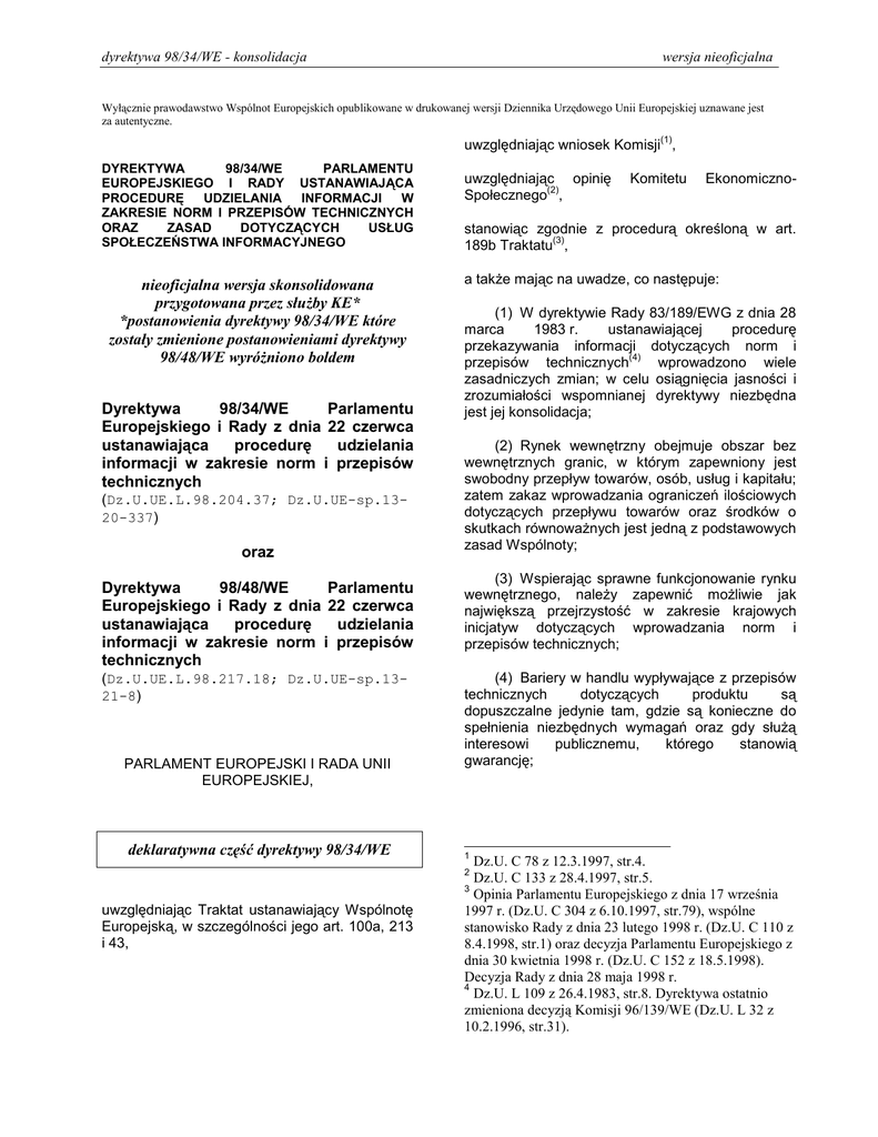 dyrektywa 98/34/WE - konsolidacja wersja nieoficjalna Wyłącznie prawodawstwo Wspólnot Europejskich opublikowane w drukowanej wersji Dziennika Urzędowego Unii Europejskiej uznawane jest za autentyczne. (1) uwzględniając wniosek Komisji , DYREKTYWA 98/34/WE PARLAMENTU EUROPEJSKIEGO I RADY USTANAWIAJĄCA PROCEDURĘ UDZIELANIA INFORMACJI W ZAKRESIE NORM I PRZEPISÓW TECHNICZNYCH ORAZ ZASAD DOTYCZĄCYCH USŁUG SPOŁECZEŃSTWA INFORMACYJNEGO nieoficjalna wersja skonsolidowana przygotowana przez służby KE* *postanowienia dyrektywy 98/34/WE które zostały zmienione postanowieniami dyrektywy 98/48/WE wyróżniono boldem Dyrektywa 98/34/WE Parlamentu Europejskiego i Rady z dnia 22 czerwca ustanawiająca procedurę udzielania informacji w zakresie norm i przepisów technicznych (Dz.U.UE.L.98.204.37; Dz.U.UE-sp.1320-337) oraz Dyrektywa 98/48/WE Parlamentu Europejskiego i Rady z dnia 22 czerwca ustanawiająca procedurę udzielania informacji w zakresie norm i przepisów technicznych (Dz.U.UE.L.98.217.18; Dz.U.UE-sp.1321-8) PARLAMENT EUROPEJSKI I RADA UNII EUROPEJSKIEJ, deklaratywna część dyrektywy 98/34/WE uwzględniając opinię (2) Społecznego , Ekonomiczno- stanowiąc zgodnie z procedurą określoną w art. (3) 189b Traktatu , a także mając na uwadze, co następuje: (1) W dyrektywie Rady 83/189/EWG z dnia 28 marca 1983 r. ustanawiającej procedurę przekazywania informacji dotyczących norm i (4) przepisów technicznych wprowadzono wiele zasadniczych zmian; w celu osiągnięcia jasności i zrozumiałości wspomnianej dyrektywy niezbędna jest jej konsolidacja; (2) Rynek wewnętrzny obejmuje obszar bez wewnętrznych granic, w którym zapewniony jest swobodny przepływ towarów, osób, usług i kapitału; zatem zakaz wprowadzania ograniczeń ilościowych dotyczących przepływu towarów oraz środków o skutkach równoważnych jest jedną z podstawowych zasad Wspólnoty; (3) Wspierając sprawne funkcjonowanie rynku wewnętrznego, należy zapewnić możliwie jak największą przejrzystość w zakresie krajowych inicjatyw dotyczących wprowadzania norm i przepisów technicznych; (4) Bariery w handlu wypływające z przepisów technicznych dotyczących produktu są dopuszczalne jedynie tam, gdzie są konieczne do spełnienia niezbędnych wymagań oraz gdy służą interesowi publicznemu, którego stanowią gwarancję; 1 Dz.U. C 78 z 12.3.1997, str.4. Dz.U. C 133 z 28.4.1997, str.5. 3 Opinia Parlamentu Europejskiego z dnia 17 września 1997 r. (Dz.U. C 304 z 6.10.1997, str.79), wspólne stanowisko Rady z dnia 23 lutego 1998 r. (Dz.U. C 110 z 8.4.1998, str.1) oraz decyzja Parlamentu Europejskiego z dnia 30 kwietnia 1998 r. (Dz.U. C 152 z 18.5.1998). Decyzja Rady z dnia 28 maja 1998 r. 4 Dz.U. L 109 z 26.4.1983, str.8. Dyrektywa ostatnio zmieniona decyzją Komisji 96/139/WE (Dz.U. L 32 z 10.2.1996, str.31). 2 uwzględniając Traktat ustanawiający Wspólnotę Europejską, w szczególności jego art. 100a, 213 i 43, Komitetu dyrektywa 98/34/WE - konsolidacja wersja nieoficjalna (12) Konieczne jest de facto wyjaśnienie pojęcia przepisów technicznych; w szczególności przepisów, na podstawie których organy władzy odnoszą się do specyfikacji technicznych lub innych wymagań lub zachęcają do ich przestrzegania, oraz przepisów dotyczących produktów, z którymi związane są organy władzy publicznej, w interesie publicznym nakładają na taki wymóg lub specyfikację mocniej wiążącą wartość niż miałyby one wyjściowo na mocy ich pochodzenia; (5) Komisja bezwzględnie musi mieć dostęp do niezbędnej informacji technicznej przed przyjęciem przepisów technicznych; zatem Państwa Członkowskie zobowiązane do ułatwiania wykonania tego zadania na mocy art.5 Traktatu powinny powiadamiać Komisję o swoich projektach w dziedzinie przepisów technicznych; (6) Wszystkie Państwa Członkowskie muszą być powiadamiane o przepisach technicznych planowanych przez jakiekolwiek Państwo Członkowskie; (13) Komisja i Państwa Członkowskie muszą mieć wystarczająco długi czas, aby zaproponować poprawki do projektowanych środków, aby usunąć lub zmniejszyć wszelkie bariery, które mogłyby powstać w stosunku do swobodnego przepływu towarów; (7) Celem rynku wewnętrznego jest stworzenie środowiska prowadzącego do zwiększonej konkurencyjności przedsiębiorstw; zwiększona ilość dostarczanych informacji z jednej strony pomaga przedsiębiorstwom lepiej wykorzystać zalety samego rynku; należy zatem umożliwić podmiotom gospodarczym ocenę wpływu krajowych przepisów technicznych planowanych przez inne Państwo Członkowskie, podając do publicznej wiadomości tytuły projektów przepisów, o których powiadomiono, oraz poprzez przepisy dotyczące poufności takich projektów; (14) Dane Państwo Członkowskie musi uwzględnić te poprawki przy tworzeniu ostatecznego tekstu projektowanych środków; (15) Cechą wewnętrznego rynku jest, że tam, gdzie Państwa Członkowskie nie mogą wdrożyć zasady wzajemnego uznawania, Komisja przyjmuje lub występuje z wnioskiem o przyjęcie wiążących wspólnotowych aktów prawnych; został wprowadzony specjalny tymczasowy okres stosowania zasady standstill, aby zapobiec sytuacji, gdy wprowadzenie krajowych środków wpłynie negatywnie na przyjęcie wiążących wspólnotowych aktów prawnych przez Radę lub Komisję w tej samej dziedzinie; (8) Dla zapewnienia bezpieczeństwa prawnego Państwa Członkowskie powinny podać do wiadomości publicznej, że krajowe przepisy techniczne zostały przyjęte zgodnie z formalnościami określonymi w niniejszej dyrektywie; (16) Dane Państwo Członkowskie jest zobowiązane, na mocy ogólnych zobowiązań określonych w art. 5 Traktatu, odroczyć wdrożenie planowanych środków na okres wystarczający do przeprowadzenia wspólnej analizy poprawek lub do przygotowania projektu wiążącego aktu prawnego przez Radę lub do przyjęcia wiążącego aktu prawnego przez Komisję; terminy określone