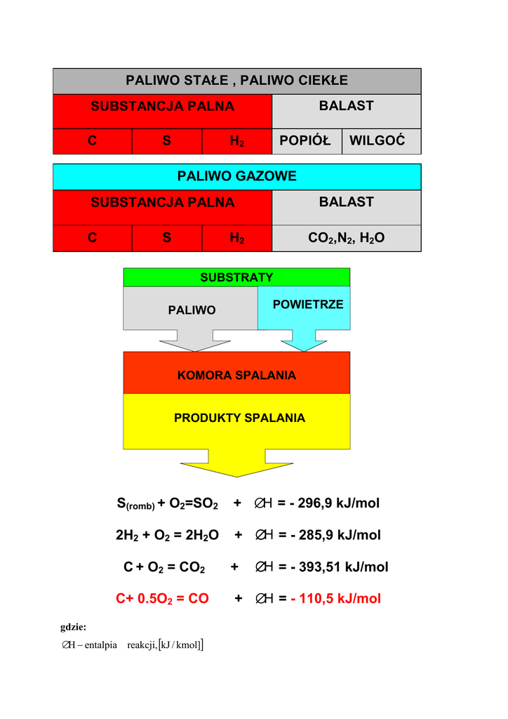 PALIWO STAŁE , PALIWO CIEKŁE BALAST SUBSTANCJA PALNA C S POPIÓŁ H2 WILGOĆ PALIWO GAZOWE BALAST SUBSTANCJA PALNA C S CO2,N2, H2O H2 SUBSTRATY POWIETRZE PALIWO KOMORA SPALANIA PRODUKTY SPALANIA S(romb) + O2=SO2 + ∆H = - 296,9 kJ/mol 2H2 + O2 = 2H2O + ∆H = - 285,9 kJ/mol C + O2 = CO2 C+ 0.5O2 = CO gdzie: ∆H − entalpia reakcji, [kJ / kmol]] + ∆H = - 393,51 kJ/mol + ∆H = - 110,5 kJ/mol Spalanie zupełne – jeżeli w spalinach nie ma palnych części gazowych (np. CO, CxHy). Spalanie całkowite – jeżeli w produktach spalania nie ma palnych części stałych (np. sadza, koksik lotny i in.). Współczynnik nadmiaru powietrza λ : λ= na n a min n a , n a min – rzeczywista ilość powietrza doprowadzonego do spalania, teoretyczna ilość powietrza niezbędna do spalenia zupełnego i całkowitego paliwa [kmol/j.p]. j.p – jednostka ilości paliwa: w przypadku paliw stałych i ciekłych j.p=kg paliwa wilgotnego lub dla paliw gazowych j.p=kmol gazu suchego. Kontrakcja chemiczna ∆Vch – różnica objętości substratów i wilgotnych produktów spalania. Kontrakcja fizyczna ∆Vf – różnica objętości substratów i produktów po uwzględnieniu wykroplenia się pary wodnej. Kontrakcja całkowita ∆V=∆ ∆Vf+∆ ∆Vch – suma kontrakcji chemicznej i fizycznej. Wartość opałowa – Qi jest to ilość ciepła, jaka powstaje w wyniku spalania zupełnego i całkowitego jednostki ilości paliwa przy założeniu, że produkty spalania zostaną ochłodzone do temperatury substratów, a para wodna zawarta w spalinach nie ulega wykropleniu. Ciepło spalania – Qs jest to ilość ciepła, jaka powstaje w wyniku spalania zupełnego i całkowitego jednostki ilości paliwa przy założeniu, że para wodna zawarta w spalinach ulegnie całkowitemu wykropleniu. Q i = Q s − m′′ ⋅ r m′′ – masa skroplin uzyskana ze spalenia jednostki ilości paliwa: dla paliw stałych i ciekłych [kg/kg], dla paliw gazowych [kg/um3] r – entalpia skraplania pary, [kJ/kg] Paliwa ciekłe i stałe: Qi [kJ/kg], Qs [kJ/kg], Paliwa gazowe: Qi [kJ/um3], Qs [kJ/um3]. 1 um³ (umowny metr sześcienny) jest to ilość substancji zawartej w 1 m³ gazu doskonałego lub półdoskonałego o ściśle określonym ciśnieniu pN i temperaturze TN. Parametry pN, TN nazywamy parametrami umownymi. Najczęściej przyjmuje się następujące wartości parametrów umownych: pN = 1 bar, TN = 273,15 K, które nazywa się parametrami umownymi SI. Bilans energetyczny kalorymetru Junkersa E& d = E& w + ∆E& u E& d – strumień energii doprowadzonej do układu, E& w – strumień energii wyprowadzonej z układu, ∆E& u = E& u 2 − E& u1 , to przyrost strumienia energii układu. & Gaz: &Ig , E& kg , E& pg , Q Spaliny: E& ks , E& ps , &Is . Woda chłodząca: &I w1 Woda chłodząca: &I w 2 Powietrze: &I , E& , E& p kp pp Straty ciepła do & otoczenia: Q str gdzie: &I g – strumień entalpii spalanego gazu, &I p – strumień entalpii powietrza doprowadzanego do procesu spalania, &I w1 – strumień entalpii wody chłodzącej, dopływającej do kalorymetru Junkersa, E& kg – strumień energii kinetycznej spalanego gazu, E& kp – strumień energii kinetycznej powietrza doprowadzanego do procesu spalania, E& pg – strumień energii potencjalnej spalanego gazu, E& pp – strumień energii potencjalnej powietrza doprowadzanego do procesu spalania, & Q – strumień ciepła wydzielonego w wyniku spalania gazu, &I s – strumień entalpii spalin, E& ks – strumień energii kinetycznej spalin, E& ps – strumień energii potencjalnej spalin, I& w 2 – strumień entalpii wody chłodzącej, wypływającej z kalorymetru Junkersa, & Q str – strumień strat ciepła do otoczenia. Pomiar powinien być przeprowadzony w stanie ustalonym, wtedy ∆E& u = 0 Warunki, które powinny być spełnione, aby kalorymetr Junkersa znajdował się w stanie ustalonym są następujące: • stałe natężenie przepływu: gazu, powietrza, wody chłodzącej oraz spalin, • stałe ciśnienie gazu, otoczenia, • stały rozkład temperatury. Aby zminimalizować straty ciepła przez konwekcję oraz promieniowanie powinny być dodatkowo spełnione następujące warunki: • • ∆t w między temperaturą wody wypływającej t w 2 i dopływającej t w1 z /do kalorymetru Junkersa powinna mieścić się w przedziale ∆t w = t w 2 − t w1 = 6 ÷ 10K średnia arytmetyczna temperatura wody chłodzącej kalorymetr t w powinna być równa różnica temperatury temperaturze otoczenia t w = 0,5(t w2 + t w1 ) = t ot . Jeżeli kalorymetr Junkersa znajduje się wstanie ustalonym, to przyrost strumienia energii układu ∆E& u = E& u2 − E& u1 = 0 , czyli strumień energii układu pozostaje niezmienny E& u 2 = E& u1 , zatem: E& d = E& w Strumień energii dopływającej do układu E& d : & + &I + E& + E& + &I E& d = &Ig + E& kg + E& pg + Q p kp pp w1 Strumień energii wypływającej z układu E& w : & E& w = &I s + E& ks + E& ps + &I w2 + Q str Wobec tego, że w stanie ustalonym spełnione jest równanie E& d = E& w zatem: & + I& + E& + E& + &I == &I + E& + E& + &I & &I + E& + E& + Q g kg pg p kp pg w1 s ks ps w 2 + Q str Założenia upraszczające bilans energetyczny kalorymetru Junkersa: • ze względu na bardzo małą prędkość przepływu (v≈0 ): gazu, powietrza oraz spalin, można pominąć strumienie energii kinetycznej: gazu, powietrza oraz spalin E& kg , E& kp , E& ks ≈0, • ze względu na to, że różnica poziomów ∆h <80-100m, można pominąć strumienie energii potencjalnej: gazu, powietrza oraz spalin E& pg , E& pp , E& ps ≈0 • nie ma kontrakcji chemicznej, czyli różnica między objętością substratów oraz objętością wilgotnych produktów spalania ∆Vch= 0 ∆Vch = Vsubstratów − Vwi lg otnych produktów = 0 gdzie: Vsubstratów = Vg + Vp = Vwi lg otnych produktów = Vs , Vg , Vp , Vs − objętość gazu, powietrza, spalin - jeżeli założymy dodatkowo, że gęstość gazu ( ρ g ), powietrza ( ρ p ), spalin ( ρs )