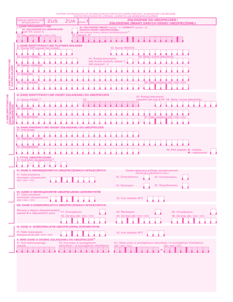 P£ATNIK WYPE£NIA POLA W WYZNACZONYCH KRATKACH KOMPUTEROWO, NA MASZYNIE LUB RÊCZNIE DU¯YMI DRUKOWANYMI LITERAMI, CZARNYM LUB NIEBIESKIM KOLOREM. 01. ZG£OSZENIE DO UBEZPIECZEÑ (jeœli TAK, wpisaæ X) 03. Data nadania (dd / mm / rrrr) 02. ZG£OSZENIE ZMIANY (wpisaæ - 1) / KOREKTY (wpisaæ - 2) DANYCH OSOBY UBEZPIECZONEJ (nie dotyczy zmiany danych identyfikacyjnych) 1) 04. Nalepka „R” 02. Numer REGON 01. Numer NIP (wpisaæ bez kresek) 03. Numer PESEL2) 04. Rodzaj dokumentu: jeœli dowód osobisty, wpisaæ 1, jeœli paszport - 2 III. DANE IDENTYFIKACYJNE OSOBY ZG£ASZANEJ DO UBEZPIECZEÑ 09. Data urodzenia (dd / mm / rrrr) 01. Numer PESEL 2) 02. 07. Data urodzenia (dd / mm / rrrr) 3) 01. Data powstania obowi¹zku ubezpieczeñ (dd / mm / rrrr) 01. Data powstania obowi¹zku ubezpieczenia (dd / mm / rrrr) 02. Emerytalnemu 04. Chorobowemu 03. Rentowym 05. Wypadkowemu 02. Kod oddzia³u NFZ 02. Kod oddzia³u NFZ 4) X. INNE DANE O OSOBIE ZG£ASZANEJ DO UBEZPIECZEÑ 01. Kod wykonywanego 02. Kod pracy w szczególnych zawodu warunkach / w szczególnym charakterze 03. Okres pracy w szczególnych warunkach / w szczególnym charakterze (dd / mm / rrrr) (dd / mm / rrrr) P£ATNIK WYPE£NIA POLA W WYZNACZONYCH KRATKACH KOMPUTEROWO, NA MASZYNIE LUB RÊCZNIE DU¯YMI DRUKOWANYMI LITERAMI, CZARNYM LUB NIEBIESKIM KOLOREM. XI. ADRES ZAMELDOWANIA NA STA£E MIEJSCE POBYTU 08. Symbol pañstwa - zagraniczny kod pocztowy (wype³niæ w przypadku, gdy adres jest inny ni¿ polski) _ XII. ADRES ZAMIESZKANIA (wpisaæ, jeœli adres zamieszkania jest inny ni¿ adres zameldowania na sta³e miejsce pobytu) 08. Symbol pañstwa - zagraniczny kod pocztowy (wype³niæ w przypadku, gdy adres jest inny ni¿ polski) _ XIII. ADRES DO KORESPONDENCJI (wpisaæ, jeœli adres do korespondencji jest inny ni¿ adres zameldowania na sta³e miejsce pobytu lub adres zamieszkania) 08. Symbol pañstwa - zagraniczny kod pocztowy (wype³niæ w przypadku, gdy adres jest inny ni¿ polski) _ XIV. OŒWIADCZENIE P£ATNIKA SK£ADEK XV. OŒWIADCZENIE OSOBY ZG£ASZANEJ / ZG£OSZONEJ DO UBEZPIECZENIA Oœwiadczam, ¿e dane zawarte w formularzu s¹ zgodne ze stanem prawnym i faktycznym. Jestem œwiadomy(-ma) odpowiedzialnoœci karnej za zeznanie nieprawdy lub zatajenie prawdy. Oœwiadczam, ¿e dane zawarte w formularzu s¹ zgodne ze stanem prawnym i faktycznym. Jestem œwiadomy(-ma) odpowiedzialnoœci karnej za zeznanie nieprawdy lub zatajenie prawdy. XVI. ADNOTACJE ZUS 1) W przypadku zmiany danych identyfikacyjnych nale¿y wype³niæ formularz ZUS ZIUA. PESEL podaje siê, o ile zosta³ nadany. Dla okreœlonego kodu tytu³u ubezpieczenia nale¿y wype³niæ formularz ZUS ZAA.. 4) Blok X. wype³nia siê w celu zg³oszenia / korekty danych dotycz¹cych okresu sprzed 1 stycznia 2009 r. 2) Numer 3)