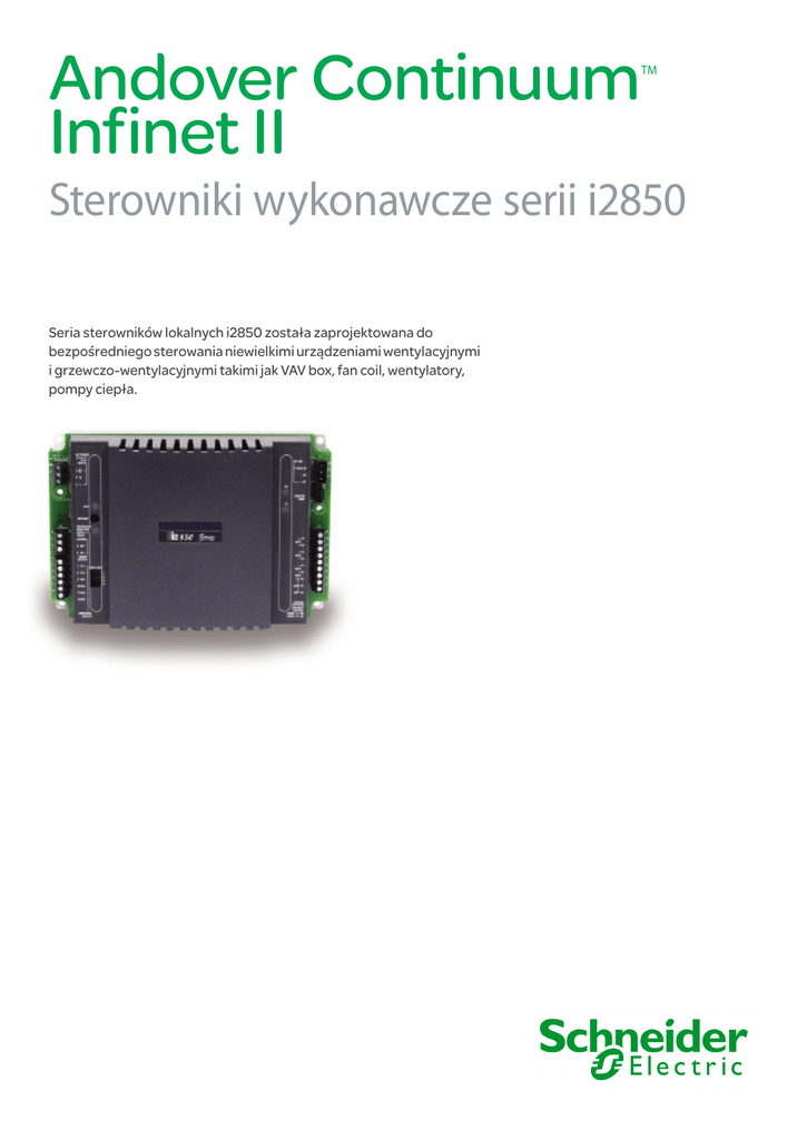 Andover Continuum Infinet II TM Sterowniki wykonawcze serii i2850 Seria sterowników lokalnych i2850 została zaprojektowana do bezpośredniego sterowania niewielkimi urządzeniami wentylacyjnymi i grzewczo-wentylacyjnymi takimi jak VAV box, fan coil, wentylatory, pompy ciepła. 02 Andover Continuum Infinet II Sterowniki wykonawcze serii i2850 Opis produktu Możliwości wykorzystania sterowników serii i2850 zostały zwiększone poprzez zabudowanie portu rozszerzeń, co umożliwia dostosowanie sterownika do różnorodnych wymagań. W skład serii wchodzą następujące sterowniki : • i2850, posiada 4 wejścia uniwersalne oraz wbudowany czujnik przepływu powietrza, sterownik przeznaczony do urządzeń VAV z pojedynczym kanałem. CHARAKTERYSTYKA PRODUKTU • Swobodnie programowany kompaktowy sterownik dla urządzeń typu VAV box i fan coil • Kompatybilność z systemami Continuum i Infinity • Możliwość zwiększenia ilości we/wy • Pamięć Flash zapewnia najwyższą niezawodność – zawiera system operacyjny, programy użytkowe i dane robocze • Wbudowany różnicowy czujnik ciśnienia powietrza • Opcjonalny wyświetlacz z klawiaturą (osobny montaż) • Pozwala na zapamiętywanie logów zmiennych • Opcja lokalnego interfejsu operatora Smart Sensor • Wbudowany port serwisowy • i2851, posiada 4 wejścia uniwersalne, bez wbudowanego czujnika przepływu powietrza, sterownik przeznaczony do klimakonwektorów i pomp ciepła. • i2853, posiada 4 wejścia uniwersalne oraz 2 wbudowane czujniki przepływu powietrza, sterownik przeznaczony do urządzeń VAV z podwójnym kanałem. Wszystkie 3 typy sterowników posiadają wejście dla czujnika pomieszczeniowego temperatury lub interfejsu operatora Smart Sensor Andover Continuum, 3 wyjściowe przekaźniki załączne oraz 1 przekaźnikowe wyjście trójstanowe. Sterowniki serii i2850 posiadają nielotną pamięć typu Flash, zwiększoną pojemność pamięci RAM oraz szybki 32-bitowy procesor nowej generacji, udostępniają także duże pojemności pamięci na aplikacje i dane robocze. Sterowniki serii i2850 komunikują się po magistrali Andover Infinet™ RS-485, co umożliwia komunikację sterowników Infinet i Infinet II w obrębie jednej magistrali oraz komunikację zarówno ze stacjami roboczymi Continuum jak i Infinity SX 8000. Maksymalnie 254 sterowniki Infinet mogą być podłączone do jednego sterownika sieciowego Andover Continuum. Schneider Electric Buildings Polska Sp. z o.o. , ul. Rzymowskiego 53, 02-697 Warszawa, tel.: +48 22 313 24 10, fax: +48 22 313 24 11 www.schneider-electric.com/buildings SDS-I2850-A4.BU.N.EN.11.2007.0.00.CC 03 Andover Continuum Infinet II Sterowniki wykonawcze serii i2850 Opis produktu (ciąg dlaszy) Zwiększona niezawodność dzięki pamięci Flash Wymiary (szkic) Sterowniki serii i2850 posiadają nieulotną pamięć RAM typu Flash dla systemu operacyjnego, programów użytkowych oraz danych roboczych. Po zaniku napięcia zasilania sieciowego, wbudowany na płycie głównej akumulator umożliwia bezpieczny transfer nastaw, trendów oraz innych danych roboczych do pamięci Flash. Po powrocie napięcia zasilającego programy użytkowe oraz dane robocze mogą być odtworzone. Backup pamięci RAM i ustawienia odtwarzania są konfigurowalne. System operacyjny zawarty w pamięci Flash pozwala na łatwą aktualizację wersji bez demontażu układów pamięci. Wejścia Sterowniki serii i2850 posiadają 4 10-bitowe wejścia uniwersalne, konfigurowalne jako napięciowe o zakresie napięć wejściowych 0-5VDC, cyfrowe, licznikowe do 4 Hz, temperaturowe lub parametryczne do zastosowań w systemach bezpieczeństwa. Sterownik i2850 posiada wbudowany czujnik przepływu powietrza, model i2853 posiada 2 takie czujniki. Sterowniki te posiadają także dodatkowe wejście do przyłączenia czujnika/ nastawnika pomieszczeniowego temperatury lub do obsługi interfejsu Smart Sensor Andover Continuum. Wyjścia Sterowniki serii i2850 posiadają 3 wyjścia cyfrowe (przekaźniki załączne) oraz 1 przekaźnikowe wyjście trójstanowe (obciążalność 3A, 24 VAC/ VDC). Te wyjścia mogą być używane do załączania/ wyłączania urządzeń oświetleniowych, grzewczych czy wentylatorów. Wyjście trójstanowe może być wykorzystane do dwukierunkowego sterowania przepustnicami lub zaworami. (każde 2 sąsiadujące wyjścia cyfrowe mogą zostać skonfigurowane jako jedno wyjście trójstanowe). Rozszerzenie we/wy Sterowniki serii i2850 posiadają port rozszerzeń we/wy, co pozwala na dołączenie 2 modułów we/ wy typu xP. Dostępne typy modułów rozszerzeń to xPDI-8, xPUI-4, xPDO-2, xPDO-4, xPAO-2 oraz xPAO-4. Dodatkowo do portu rozszerzeń można dołączyć moduł wyświetlacza z klawiaturą xP-Display. Schneider Electric Buildings Polska Sp. z o.o. , ul. Rzymowskiego 53, 02-697 Warszawa, tel.: +48 22 313 24 10, fax: +48 22 313 24 11 www.schneider-electric.com/buildings SDS-I2850-A4.BU.N.EN.11.2007.0.00.CC 04 Andover Continuum Infinet II Sterowniki wykonawcze serii i2850 Opis produktu (ciąg dlaszy) Programowanie Wejścia (szkic) Pamięć dynamiczna serii sterowników i2850 może zawierać dowolne kombinacje programów, harmonogramów, alarmów i danych dzięki zastosowaniu języka programowania Andover Plain English®. Obiektowy język programowania Plain English zawierający intuicyjne słowa kluczowe umożliwia łatwe zaimplementowanie dowolnie skomplikowanych algorytmów. Programowanie sterowników serii i2850 odbywa się za pośrednictwem stacji roboczej Continuum. Programy są przechowywane i wykonywane bezpośrednio w sterowniku. Programy Plain English wraz ze zmiennymi mogą być łatwo kopiowane z jednego sterownika do drugiego bez żadnych zmian, co skraca czas potrzebny na wykonanie instalacji. 1 Zasilanie 2 Komunikacja Interfejs Smart Sensor Sterowniki z serii i2850 posiadają wbudowany port do obsługi lokalnego interfejsu użytkownika typu Smart Sensor Andover Continuum. Interfejs Smart Sensor po