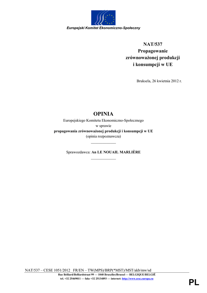 Europejski Komitet Ekonomiczno-Społeczny NAT/537 Propagowanie zrównoważonej produkcji i konsumpcji w UE Bruksela, 26 kwietnia 2012 r. OPINIA Europejskiego Komitetu Ekonomiczno-Społecznego w sprawie propagowania zrównoważonej produkcji i konsumpcji w UE (opinia rozpoznawcza) _____________ Sprawozdawca: An LE NOUAIL MARLIÈRE _____________ NAT/537 – CESE 1051/2012 FR/EN – TW(MPS)/BRP(*MST)/MST/akb/mw/sd Rue Belliard/Belliardstraat 99 — 1040 Bruxelles/Brussel — BELGIQUE/BELGIË tel. +32 25469011 — faks +32 25134893 — internet: http://www.eesc.europa.eu PL -1Dnia 11 stycznia 2012 r. prezydencja duńska, działając na podstawie art. 304 Traktatu o funkcjonowaniu Unii Europejskiej, postanowiła zasięgnąć opinii Europejskiego Komitetu Ekonomiczno-Społecznego w sprawie propagowania zrównoważonej produkcji i konsumpcji w UE (opinia rozpoznawcza). Sekcja Rolnictwa, Rozwoju Wsi i Środowiska Naturalnego, której powierzono przygotowanie prac Komitetu w tej sprawie, przyjęła swoją opinię 10 kwietnia 2012 r. Na 480. sesji plenarnej w dniach 25–26 kwietnia 2012 r. (posiedzenie z 26 kwietnia) Europejski Komitet Ekonomiczno-Społeczny stosunkiem głosów 124 do 8 – 5 osób wstrzymało się od głosu – przyjął następującą opinię: * * * 1. Wnioski i zalecenia 1.1 W odpowiedzi na wniosek prezydencji duńskiej EKES ocenił narzędzia i środki niezbędne, by przejść do zrównoważonej produkcji i konsumpcji. Przyjmując z uznaniem wysiłki instytucji europejskich i fakt, iż uświadamiają one sobie wagę omawianej problematyki, EKES zaleca w tej sprawie, w trosce o zapewnienie sprawiedliwych przemian, opracowanie wspólnej, odnowionej wizji modelu gospodarczego wspólnie ze wszystkimi zainteresowanymi stronami zorganizowanego społeczeństwa obywatelskiego w ramach wyspecjalizowanego forum konsultacyjnego, aby określić cele i przedmiot działania oraz opracować zaktualizowany proces monitorowania. 1.2 Wskazane jest, by: 1 ściśle zintegrować z jednej strony działania na rzecz zrównoważonej konsumpcji i produkcji, a z drugiej wdrożenie planu działania na rzecz zasobooszczędnej Europy1 oraz zachęcać państwa członkowskie do realizacji tej polityki poprzez plan działania i semestr europejski; zastosować szereg narzędzi przekrojowych służących wdrażaniu i zachęcaniu do działania, jak np. stopniowe eliminowanie produktów niezrównoważonych, opracowanie sprawiedliwszej polityki podatkowej, propagowanie „zielonych” przetargów publicznych, stopniowe likwidowanie subwencji, które nie uwzględniają negatywnych skutków dla środowiska, wspieranie badań i innowacji ekologicznych, internalizacja kosztów COM(2011) 571 final. NAT/537 – CESE 1051/2012 FR/EN – TW(MPS)/BRP(*MST)/MST/akb/mw/sd .../... -2środowiskowych, innowacje w zakresie innych środków rynkowych, zwracanie się do konsumentów i pracowników o aktywny udział w procesie tych przemian. 1.3 Należy również oddziaływać na system finansowy2, by na nowo zaczął służyć gospodarce produkcyjnej i zrównoważonej konsumpcji, skupiając się na dziedzinach wywierających największy wpływ na środowisko, jak przemysł rolno-spożywczy, rolnictwo, mieszkalnictwo, infrastruktura i transport. 1.4 Ponadto należy wyjść poza ściśle zakreślone dziedziny energii i emisji gazów cieplarnianych i zainteresować się także innymi zasobami i sposobami wpływania na środowisko, takimi jak zarządzanie wodami i ich ochrona, przeznaczenie gruntów, zanieczyszczenie powietrza oraz uwzględnić ogólny wpływ produktów na środowisko. 1.5 Dzięki doskonaleniu procesów produkcyjnych i samych produktów można będzie zaoferować konsumentom i użytkownikom produkty i usługi, które zaakceptują oni poprzez zmianę zachowań lub oceny. 1.6 Ponadto, aby propagować zrównoważone modele konsumpcji i styl życia należy wzmocnić rolę stowarzyszeń konsumentów i producentów zajmujących się sprawiedliwym handlem oraz promować i chronić inicjatywy alternatywne wobec drapieżnych sposobów konsumpcji, a także wspierać sprawdzone rozwiązania. 2. Wprowadzenie 2.1 W grudniu 2011 r. rząd duński, z myślą o pogodzeniu kwestii wychodzenia z kryzysu, naprawy gospodarczej i zobowiązań UE dotyczących przeciwdziałania zmianie klimatu, zwrócił się do EKES-u o opracowanie opinii rozpoznawczej w sprawie propagowania zrównoważonej produkcji i konsumpcji. Przywołując komisyjny plan działania na rzecz zasobooszczędnej Europy i etapy jego realizacji obejmujące zrównoważoną produkcję 3 i konsumpcję , rząd duński poprosił EKES o ocenę instrumentów niezbędnych do przejścia gospodarki europejskiej do zrównoważonej produkcji i konsumpcji w UE. 2.2 Jak dotąd rozwój gospodarczy opierał się na energii i podstawowych zasobach nieodnawialnych, zgodnie z głównym paradygmatem „człowiek panem i właścicielem przyrody”. Produkcja towarów i usług charakteryzuje się jeszcze ciągle eksternalizacją kosztów, które powinny zostać powiązane z wydobyciem nieodnawialnych zasobów naturalnych i z emisjami do środowiska gazów cieplarnianych i zanieczyszczeń. W gospodarce rynkowej należy narzucić podmiotom gospodarczym internalizację kosztów za 2 Opinia Komitetu „Regulacja usług finansowych dla zapewnienia zrównoważonego wzrostu”, sprawozdawca Edgardo Maria IOZIA, Dz.U. C 107 z 6.4.2011, s. 21 oraz opinia Komitetu „Wzmocnienie koordynacji polityki gospodarczej w interesie stabilności, wzrostu gospodarczego i zatrudnienia – Narzędzia na rzecz silniejszego zarządzania gospodarczego w UE”, sprawozdawca Stefano PALMIERI, Dz.U. C 107 z 6.4.2011, s. 7. 3 COM(2011) 571 final; s. 6–7. NAT/537 – CESE 1051/2012 FR/EN – TW(MPS)/BRP(*MST)/MST/akb/mw/sd .../... -3pomocą wiążących standardów, które – w miarę możliwości – powinny mieć wartość uniwersalną. 2.3 Zrównoważona produkcja i konsumpcja rozumiana jako korzystanie z usług i pro