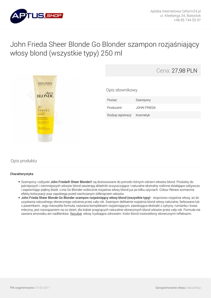 Apteka Internetowa Cefarm24.pl ul. Kleeberga 34, Białystok +48 85 744 55 97 John Frieda Sheer Blonde Go Blonder szampon rozjaśniający włosy blond (wszystkie typy) 250 ml Cena: 27,98 PLN Opis słownikowy Postać Szampony Producent JOHN FRIEDA Rodzaj rejestracji Kosmetyk Opis produktu Charakterystyka Szampony i odżywki John Frieda® Sheer Blonde® są dostosowane do potrzeb różnych odcieni włosów blond. Produkty do jaśniejszych i ciemniejszych włosów blond zawierają składniki oczyszczające i naturalne ekstrakty roślinne działające odżywczo i zapewniając piękny blask. Linia Go Blonder widocznie rozjaśnia włosy blond już po kilku użyciach. Colour Renew wzmacnia efekty koloryzacji oraz zapobiega przed niechcianym żółknięciem włosów. John Frieda Sheer Blonde Go Blonder szampon rozjaśniający włosy blond (wszystkie typy) - stopniowo rozjaśnia włosy, aż do uzyskania naturalnego słonecznego odcienia przez cały rok. Szampon delikatnie rozjaśnia blond włosy naturalne, farbowane lub z pasemkami. Jego niezwykła formuła, nazwana kompleksem rozjaśniającym, zawierająca ekstrakt z cytryny, rumianku i kwas mleczny, jest rozwiązaniem na co dzień, dla kobiet pragnących naturalnie słonecznych blond włosów przez cały rok. Formuła nie zawiera amoniaku ani nadtlenków. Rezultat: włosy tryskające zdrowiem. Kolor blond rozświetlony słonecznymi refleksami. Plik wygenerowano: 01-03-2017 Powered by TCPDF (www.tcpdf.org) Oprogramowanie sklepu: AptusShop