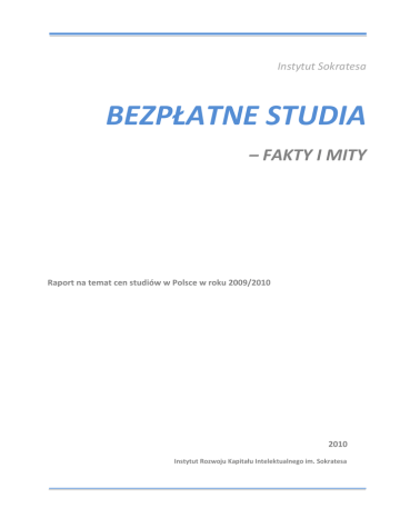 Instytut Sokratesa BEZPŁATNE STUDIA – FAKTY I MITY Raport na temat cen studiów w Polsce w roku 2009/2010 2010 Instytut Rozwoju Kapitału Intelektualnego im. Sokratesa Spis treści I. II. III. IV. V. VI. VII. VIII. IX. X. XI. XII. Szkolnictwo wyższe w Polsce Stan obecny Olbrzymi rynek, czyli trudny wybór Większośd płaci, czyli mit bezpłatnych studiów Bezpłatne studia – przywilej najbogatszych? Studia, czyli zestaw płatnych niespodzianek Dyplom magistra, czyli niepewna przyszłośd Polskie studia, czyli lekko uchylone okno na świat Ceny studiów w roku akademickim 2009/2010 Ceny studiów według województw Ceny studiów w relacji do wynagrodzeo w województwach Podsumowanie 3 5 7 7 8 9 9 10 11 16 17 20 2 I. SZKOLNICTWO WYŻSZE W POLSCE Od kilku lat toczy się w Polsce debata na temat pożądanych kierunków zmian w szkolnictwie wyższym. Mimo, że obowiązująca ustawa powstała stosunkowo niedawno, bo w 2005 roku, to w zasadzie wszystkie środowiska – akademickie, studenckie oraz polityczne – chcą jej zmiany. Oczywiście zarówno wśród rektorów czy studentów jak i wśród polityków pomysłów na transformację ustrojową w obszarze wyższej edukacji jest wiele i jak łatwo przypuszczad znacznie się one od siebie różnią. Pierwsze założenia reformy szkolnictwa wyższego zostały ogłoszone w marcu 2008 roku. Po ponad dwóch latach debaty publicznej do konsultacji społecznych został w koocu skierowany projekt nowelizacji ustawy Prawo o szkolnictwie wyższym, który zgodnie z zapowiedziami Ministerstwa Nauki i Szkolnictwa Wyższego powinien wejśd w życie w roku akademickim 2011/2012. Wypracowany konsensus, wprowadza wiele istotnych zmian jednak jest traktowany bardziej jako wstęp czy też pierwszy krok głębokiej reformy aniżeli podstawa prawna dla szkolnictwa wyższego na następne dziesięciolecia. Debata dotycząca przyszłego modelu polskiego systemu szkolnictwa wyższego będzie więc rozwijała się dalej przez następne miesiące tym bardziej, że w dopiero zakooczono prace nad dwoma wersjami strategii rozwoju szkolnictwa wyższego do 2020 roku. Pierwszy projekt, zaprezentowany przez ekspertów ze środowiska akademickiego, drugi zaś został opracowany przez ekspertów zewnętrznych. Oba przedstawione dokumenty mają pewne cechy wspólne, natomiast główne różnice dotyczą modelu finansowania oraz zarządzania polskimi uczelniami. Większy konsensus panuje odnośnie oceny stanu obecnego polskiego systemu szkolnictwa wyższego. Na pewno wśród pozytywnych cech ostatniego dwudziestolecia polskiego szkolnictwa wyższego należy wymienid zaspokojenie olbrzymiego boomu edukacyjnego. Od 1991 roku powstało w Polsce 326 uczelni niepublicznych i to głównie dzięki nim odsetek młodych ludzi idących obecnie na studia należy w Polsce do najwyższych w Europie. Współczynnik skolaryzacji netto w roku akademickim 2008/2009 wyniósł 40,6%, co w znacznym stopniu przewyższa średnią dla krajów OECD (w 2007 r. wyniosła ona 25%)1. Te osiągnięcia sprawiają, że to właśnie w obszarze edukacji Polska spełnia już propozycje wskaźników zaproponowanych przez Komisję Europejską w Strategii „EU 2020”2. 1 Diagnoza stanu szkolnictwa wyższego, Ernst&Young Business Advisory oraz Instytut Badao nad Gospodarką Rynkową, listopad 2009. 2 Komunikat Komisji Europejskiej „Europa 2020” Strategia na rzecz inteligentnego i zrównoważonego rozwoju sprzyjającemu włączeniu społecznemu, KOM (2010) 2020. 3 Drugą stroną tego samego medalu jest jednak kwestia dyskusyjnej jakości studiów i poziomu absolwentów. Po pierwsze, zdecydowany wzrost współczynnika skolaryzacji w mógł negatywnie wpłynąd na średni poziom umiejętności studentów. 20 lat temu na studia decydowało się pójśd ponad cztery razy mniej młodych ludzi. Obecnie, ze studiów elitarnych (lub właściwiej należałoby powiedzied „dla elit”) weszliśmy w czas studiów masowych. Po drugie, dynamicznemu wzrostowi liczby studentów nie towarzyszył analogiczny proces jeśli chodzi o nauczycieli akademickich. Według opracowao Ministerstwa Nauki i Szkolnictwa Wyższego między rokiem 1994 a 2007 liczba studentów wzrosła o 236%, natomiast doktorów o 67%, doktorów habilitowanych o 87%, a profesorów tytularnych o 123%. Wytworzyło to sytuację w której znacząco zwiększyła się liczba studentów przypadających na jednego nauczyciela akademickiego, co musiało spowodowad zanik relacji uczeo-mistrz oraz utrudnienie kontaktu pomiędzy studentami i ich wykładowcami. Mogła ucierpied na tym jakośd dydaktyki. Ważnym elementem towarzyszącym upowszechnianiu studiów wyższych w Polsce była również gwałtowny wzrost szkolnictwa niepublicznego. O ile jednak sam fakt powstawania szkół niepublicznych ocenid należy pozytywnie z uwagi na zwiększenie konkurencyjności polskiego rynku usług edukacyjnych, o tyle skala i sposób przebiegania tego procesu nie może zostad oceniony w sposób jednoznaczny. Z jednej strony duża liczba uczelni niepublicznych umożliwiła kapilarne dotarcie z ofertą dydaktyczną do poziomu lokalnego oraz uelastyczniła ofertę edukacyjną dzięki rynkowym mechanizmom działania sektora prywatnego. Z drugiej strony widoczne są również słabości tego systemu. Po pierwsze, 456 podmiotów (2/3 to uczelnie niepubliczne) prowadzących edukację na poziomie wyższym wydaje się liczbą zdecydowanie zbyt wysoką, nawet jak na polskie warunki. Prowadzi to do nadmiernego rozdrobnienia zasobów oraz utrudnia stworzenie w uczelni masy krytycznej (infrastruktury, kadry akademickiej czy studentów), która jest często konieczna do osiągnięcia lepszych możliwości rozwojowych. Ubocznym efektem tej sytuacji jest fakt, że polskie uczelnie są słabo widoczne na arenie międzynarodowej i bardzo rzadko pojawiają się w międzynarodowych rankingach. Kwestia dużego rozproszenia zasobów w wielu instytucjach szkolnictwa wyższego może okazad się szczegó