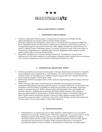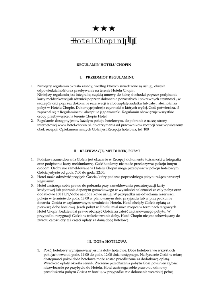 REGULAMIN HOTELU CHOPIN I. 1. 2. PRZEDMIOT REGULAMINU Niniejszy regulamin określa zasady, według których świadczone są usługi, określa odpowiedzialność oraz przebywanie na terenie Hotelu Chopin. Niniejszy regulamin jest integralną częścią umowy do której dochodzi poprzez podpisanie karty meldunkowej jak również poprzez dokonanie pozostałych i pokrewnych czynności , w szczególności poprzez dokonanie rezerwacji i/albo zapłatę zadatku lub całej należności za pobyt w Hotelu Chopin. Dokonując jednej z czynności o których wyżej, Gość potwierdza, iż zapoznał się z Regulaminem i akceptuje jego warunki. Regulamin obowiązuje wszystkie osoby przebywające na terenie Chopin Hotel. Regulamin dostępny jest w każdym pokoju hotelowym, do pobrania z naszej strony internetowej www.hotel-chopin.pl, do otrzymania od pracowników recepcji oraz wywieszony obok recepcji. Opiekunem naszych Gości jest Recepcja hotelowa, tel. 100 II. REZERWACJE, MELDUNEK, POBYT 1. 2. 3. Podstawą zameldowania Gościa jest okazanie w Recepcji dokumentu tożsamości z fotografią oraz podpisanie karty meldunkowej. Gość hotelowy nie może przekazywać pokoju innym osobom. Osoby nie zameldowane w Hotelu Chopin mogą przebywać w pokoju hotelowym Gościa jedynie od godz. 7:00 do godz. 22:00. Hotel może odmówić przyjęcia Gościa, który podczas poprzedniego pobytu rażąco naruszył Regulamin. Hotel zastrzega sobie prawo do pobrania przy zameldowaniu preautoryzacji karty kredytowej lub pobrania depozytu gotówkowego w wysokości należności za cały pobyt oraz dodatkowo 150 PLN/dobę na dodatkowe usługi.W przypadku nie odwołania rezerwacji pokoju w terminie do godz. 18:00 w planowanym dniu przyjazdu lub w przypadku nie dotarcia Gościa w zaplanowanym terminie do Hotelu, Hotel obciąży Gościa opłatą za pierwszą dobę hotelową. Jeżeli pobyt w Hotelu miał mieć miejsce w terminach targowych Hotel Chopin będzie miał prawo obciążyć Gościa za całość zaplanowanego pobytu. W przypadku rezygnacji Gościa w trakcie trwania doby, Hotel Chopin nie jest zobowiązany do zwrotu całości czy też części opłaty za daną dobę hotelową. III. DOBA HOTELOWA 1. Pokój hotelowy wynajmowany jest na doby hotelowe. Doba hotelowa we wszystkich pokojach trwa od godz. 14:00 do godz. 12:00 dnia następnego. Na życzenie Gości w miarę dostępności pokoi doba hotelowa może zostać przedłużona za dodatkową opłatą. Wysokość opłaty określa cennik. Życzenie przedłużenia pobytu Gość powinien zgłosić niezwłocznie po przybyciu do Hotelu. Hotel zastrzega sobie prawo do odmowy przedłużenia pobytu Gościa w hotelu, w przypadku nie dokonania wcześniej pełnej 2. płatności za dotychczasowy okres pobytu oraz w przypadku nieprzestrzegania Regulaminu. W Hotelu Chopin obowiązuje cisza nocna w godzinach: od godz. 22:00 do godz. 7:00 dnia następnego. IV. USŁUGI HOTELU CHOPIN 1. 2. 3. 4. Hotel Chopin świadczy usługi zgodnie ze swoją kategorią i standardem. Ewentualne zastrzeżenia dotyczących jakości świadczonych usług prosimy zgłaszać bezpośrednio pracownikom Recepcji, co pozwoli na naszą szybką reakcję i podniesienie standardu świadczonych usług. Hotel Chopin zapewnia swoim Gościom: bezpieczeństwo pobytu, w tym bezpieczeństwo zachowania tajemnicy informacji o Gościu, w pełni profesjonalną i uprzejmą obsługę w zakresie wszystkich usług świadczonych w Hotelu, sprzątanie pokoju i wykonywanie niezbędnej naprawy urządzeń podczas nieobecności Gościa (na życzenie również w czasie jego obecności) oraz warunki pełnego wypoczynku. Na życzenie Gościa Hotel Chopin świadczy również nieodpłatnie następujące usługi: budzenie o wyznaczonej godzinie, zamawianie taxi, udzielanie informacji związanych z pobytem i podróżą, przechowywanie pieniędzy i przedmiotów wartościowych w czasie pobytu Gościa w Hotelu, w depozycie z zastrzeżeniem VI pkt 3 Regulaminu. Wszystkie pokoje Hotelu Chopin wyposażone są w minibar serwujący napoje bezalkoholowe, alkoholowe oraz przekąski. Korzystanie z minibaru jest odpłatne. Cennik produktów z minibaru znajduje się w karcie informacyjnej umieszczonej w każdym pokoju. Informacje te dostępne są również telefonicznie w Recepcji (tel. nr 100). Hotel Chopin oferuje odpłatnie (na zapytanie) pomieszczenie konferencyjne z odpowiednim zapleczem multimedialnym do przeprowadzania szkoleń, organizacji imprez firmowych oraz innych eventów. V. ODPOWIEDZIALNOŚĆ GOŚCI 1. 2. 3. Gość Hotelu Chopin ponosi pełną odpowiedzialność materialną za wszelkiego rodzaju uszkodzenia lub zniszczenia przedmiotów wyposażenia i urządzeń technicznych Hotelu powstałe z winy jego lub odwiedzających. Hotel zastrzega sobie możliwość obciążenia karty kredytowej Gościa za wyrządzone szkody po jego wyjeździe. Cennik wyposażenia stanowi załącznik nr 1 do Regulaminu. Opuszczając pokój Gość każdorazowo zobowiązany jest ze względów bezpieczeństwa wyjąć z czytnika kartę hotelową zabierając ją ze sobą, zamknąć krany oraz sprawdzić zamknięcie drzwi. Kartę hotelową przy wymeldowaniu należy bezwzględnie zwrócić na Recepcji. Hotelowi przysługuje ustawowe prawo zastawu na rzeczach wniesionych przez Gościa do Hotelu w razie opóźniania się Gościa z uregulowaniem płatności za pobyt lub nieuregulowania należności za inne świadczone usługi. W przypadku naruszenia postanowień Regulaminu, Hotel może odmówić świadczenia usług osobie, która je narusza. Na terenie Hotelu Chopin dzieci w wieku poniżej 12 lat muszą znajdować się pod stałym nadzorem swoich opiekunów prawnych. Opiekunowie prawni ponoszą pełną odpowiedzialność materialną za szkody przedmiotów wyposażenia i urządzeń technicznych powstałe w wyniku działania dzieci. VI. ODPOWIEDZIALNOŚĆ HOTELU 1. 2. 3. Hotel ponosi odpowiedzialność za utratę lub uszkodzenie rzeczy wniesionych przez osoby korzystające z jego usług w