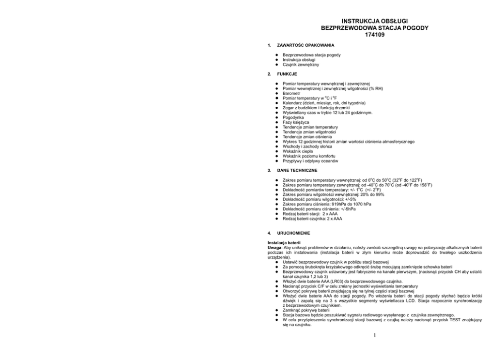 INSTRUKCJA OBSŁUGI BEZPRZEWODOWA STACJA POGODY 174109 1. ZAWARTOŚC OPAKOWANIA Bezprzewodowa stacja pogody Instrukcja obsługi Czujnik zewnętrzny 2. FUNKCJE Pomiar temperatury wewnętrznej i zewnętrznej Pomiar wewnętrznej i zewnętrznej wilgotności (% RH) Barometr o o Pomiar temperatury w C i F Kalendarz (dzień, miesiąc, rok, dni tygodnia) Zegar z budzikiem i funkcją drzemki Wyświetlany czas w trybie 12 lub 24 godzinnym. Pogodynka Fazy księżyca Tendencje zmian temperatury Tendencje zmian wilgotności Tendencje zmian ciśnienia Wykres 12 godzinnej historii zmian wartości ciśnienia atmosferycznego Wschody i zachody słońca Wskaźnik ciepła Wskaźnik poziomu komfortu Przypływy i odpływy oceanów 3. DANE TECHNICZNE o o o o Zakres pomiaru temperatury wewnętrznej: od 0 C do 50 C (32 F do 122 F) o o o o Zakres pomiaru temperatury zewnętrznej: od -40 C do 70 C (od -40 F do 158 F) o o Dokładność pomiarów temperatury: +/- 1 C (+/- 2 F) Zakres pomiaru wilgotności wewnętrznej: 20% do 99% Dokładność pomiaru wilgotności: +/-5% Zakres pomiaru ciśnienia: 919hPa do 1070 hPa Dokładność pomiaru ciśnienia: +/-5hPa Rodzaj baterii stacji: 2 x AAA Rodzaj baterii czujnika: 2 x AAA 4. URUCHOMIENIE Instalacja baterii Uwaga: Aby uniknąć problemów w działaniu, należy zwrócić szczególną uwagę na polaryzację alkalicznych baterii podczas ich instalowania (instalacja baterii w złym kierunku może doprowadzić do trwałego uszkodzenia urządzenia). Ustawić bezprzewodowy czujnik w pobliżu stacji bazowej Za pomocą śrubokręta krzyżakowego odkręcić śrubę mocującą zamknięcie schowka baterii Bezprzewodowy czujnik ustawiony jest fabrycznie na kanale pierwszym, (nacisnąć przycisk CH aby ustalić kanał czujnika 1,2 lub 3) Włożyć dwie baterie AAA (LR03) do bezprzewodowego czujnika. Nacisnąć przycisk C/F w celu zmiany jednostki wyświetlania temperatury Otworzyć pokrywę baterii znajdującą się na tylnej części stacji bazowej Włożyć dwie baterie AAA do stacji pogody. Po włożeniu baterii do stacji pogody słychać będzie krótki dźwięk i zapalą się na 3 s wszystkie segmenty wyświetlacza LCD. Stacja rozpocznie synchronizację z bezprzewodowym czujnikiem. Zamknąć pokrywę baterii Stacja bazowa będzie poszukiwać sygnału radiowego wysyłanego z czujnika zewnętrznego. W celu przyśpieszenia synchronizacji stacji bazowej z czujką należy nacisnąć przycisk TEST znajdujący się na czujniku. 1 Poczekać do 3 minut aż pojawią się na wyświetlaczu odczyty temperatur z zewnętrznego czujnika bezprzewodowego UWAGA: Nie naciskać żadnych przycisków przed pojawieniem się zewnętrznych wskazań. Zamknąć pokrywę baterii w czujniku bezprzewodowym. Aby odczytywać zewnętrzną temperaturę należy umieścić czujnik na zewnątrz pomieszczenia. Czujnik będzie mierzył i wysyłał zarejestrowane wartości z miejsca, w którym jest zamontowany. Każdorazowo, gdy w czujniku zewnętrznym wymieniane są baterie, do stacji wysyłany jest losowy kod ochronny. Powinna nastąpić automatyczna synchronizacja obu urządzeń. Zaleca się jednak, aby w przypadku wymiany baterii w czujniku, zrestartować również stację pogody przez chwilowe wyjęcie baterii. Umożliwi to odzyskanie kontaktu z czujnikiem. Uwaga: Po pojawieniu się na wyświetlaczu wszystkich (wew. i zew.) mierzonych wartości, można umieścić bezprzewodowy czujnik na zewnątrz, a stację w wybranym miejscu. Jeśli na stacji pogody nie pokażą się zewnętrzne pomiary, upewnij się czy czujnik jest w zasięgu stacji lub powtórz procedurę instalacji baterii. Jeśli przed pojawieniem się wszystkich odczytów na wyświetlaczu stacji, został naciśnięty jakiś klawisz należy ponownie przeprowadzić procedurę instalacji baterii. Przed ponownym zainstalowaniem baterii prosimy poczekać minimum 10 sekund, aby mieć pewność, że zarówno stacja jak i czujnik zresetują się poprawnie. 5. FUNKCJE PROGRAMOWANIA Ustawienie wysokości nad poziomem morza Po uruchomieniu się stacji bazowej na wyświetlaczu zacznie migać liczba oznaczająca wysokość nad poziomem morza z dokładnością do 10m n.p.m. Przyciskiem UP lub DOWN ustawić wysokość dla danego miasta w którym znajduje się stacja. Ustawienie tej wysokości jest konieczne aby stacja wyświetlała poprawną wartość ciśnienia atmosferycznego. Poniżej wysokości nad poziomem morza dla największych polskich miast: Warszawa – 94 m n.p.m Łódź -198 m n.p.m Gdańsk – 13m n.p.m Szczecin – 1 m n.p.m Poznań - 50 m n.p.m Wrocław – 118m n.p.m Lublin – 170m n.p.m Kraków – 233m n.p.m WARUNKI GWARANCJI 1. Niniejsza gwarancja jest udzielana przez firmę BIOWIN Sp. z o.o. z siedzibą przy ul. Pryncypalnej 129/141; 93-373 Łódź - Polska, nazywaną w dalszej części gwarancji Gwarantem. 2. Niniejsza gwarancja dotyczy wyłącznie sprzętu używanego na terytorium Polski. 3. Okres gwarancji wynosi 12 miesięcy od daty zakupu sprzętu. 4. W przypadku wad uniemożliwiających korzystanie ze sprzętu okres gwarancji ulega przedłużeniu o czas od dnia zgłoszenia wady do dnia wykonania naprawy. 5. Gwarancja uprawnia do bezpłatnych napraw nabytego sprzętu, polegających na usunięciu wad fizycznych, które ujawniły się w okresie gwarancyjnym, z zastrzeżeniem punktu 9. 6. Zgłoszenie wady sprzętu powinno zawierać: • dowód zakupu towaru; • nazwę i model towaru; • datę sprzedaży (bez skreśleń i poprawek); • podpis i pieczątkę sprzedawcy. 7. Gwarant w terminie 14 dni roboczych od daty zgłoszenia wady ustosunkuje się do zgłoszonej reklamacji. Jeżeli do dokonania naprawy wystąpi konieczność sprowadzenia części zamiennych z zagranicy termin naprawy może ulec przedłużeniu do czasu sprowadzenia niezbędnej elementów, lecz maksymalnie do 30 dni roboczych od daty otrzymania towaru do naprawy. 8. Reklamujący powinien dostarczyć towar odpowiednio zabezpieczony przed uszkodzeniem w czasie transportu. 9. Gwarancj