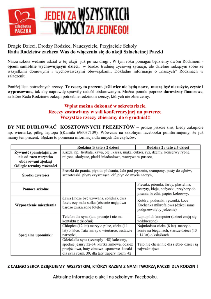 Drogie Dzieci, Drodzy Rodzice, Nauczyciele, Przyjaciele Szkoły Rada Rodziców zachęca Was do włączenia się do akcji Szlachetnej Paczki Nasza szkoła weźmie udział w tej akcji już po raz drugi . W tym roku pomagać będziemy dwóm Rodzinom ojcom samotnie wychowującym dzieci, w bardzo trudniej życiowej sytuacji, ale dzielnie radzącym sobie ze wszystkimi domowymi i wychowawczymi obowiązkami. Dokładne informacje o „naszych” Rodzinach w załączeniu. Poniżej lista potrzebnych rzeczy. Te rzeczy to prezent- jeśli więc nie będą nowe, muszą być niezużyte, czyste i wyprasowane, tak aby naprawdę sprawiły radość obdarowanym. Można pomóc poprzez darowizny finansowe, za które Rada Rodziców zakupi potrzebne rodzinom rzeczy, których nie zbierzemy. Wpłat można dokonać w sekretariacie. Rzeczy zostawiamy w sali konferencyjnej na parterze. Wszystkie rzeczy zbieramy do 6 grudnia!!! BY NIE DUBLOWAĆ KOSZTOWNYCH PREZENTÓW – proszę piszcie sms, kiedy zakupicie np. wiertarkę, piłkę, laptopa ((Kamila 696037139). Wówczas na szkolnym facebooku poinformujemy, że już mamy ten prezent. Będzie to pomocna informacja dla innych Darczyńców. Żywność (pamiętajmy, ze nie od razu wszystko obdarowani zjedzą) Odległe terminy ważności Rodzina 1/ tato z 2 dzieci Rodzina 2 / tato z 3 dzieci Każda, np. herbata, kawa, olej, kasza, mąka, cukier, ryż, dżemy, konserwy rybne, mięsne, słodycze, płatki śniadaniowe, warzywa w puszce, Proszki do prania, płyn do płukania, żele pod prysznic, szampony, pasty do zębów, szczoteczki, płyny czyszczące, cif, płyn do mycia naczyń, Środki czystości Plecaki, piórniki, farby, plastelina, zeszyty, kleje, nożyczki, przybory do pisania, kredki, papier kolorowy, Pomoce szkolne Wyposażenie mieszkania Specjalne upominki: Ława (może być używana, solidna), dwa fotele czy mała sofka (obecnie mają dwa bardzo zniszczone fotele) Telefon dla syna (tato pracuje i nie ma kontaktu z dziećmi) Chłopiec (12 lat) marzy o piłce, córka (11 lat) o lalce. Tata marzy o wiertarce, zestawie narzędzi, Odzież dla syna (szczupły 148) kalesony, spodnie jeansy 32-34, kurtka zimowa, odzież przejściowa, buty zimowe- sportowe kozaki dla syna rozm. 39, dla taty trapery rozm. 42 Kołdry, poduszki, ręczniki, koce Kuchenka mikrofalowa (dzieci same podgrzewałyby jedzenie) Laptop lub komputer (dzieci czują się wykluczone) Najmłodsza córka (8 lat) marzy o koniu na biegunach, starsze dzieci (13 i 14 lat) o książkach Tato nie chciał nic dla siebie- dzieci są najważniejsze Z CAŁEGO SERCA DZIĘKUJEMY WSZYSTKIM, KTÓRZY RAZEM Z NAMI TWORZĄ PACZKI DLA RODZIN ! Aktualne informacje o akcji na szkolnym Facebooku.