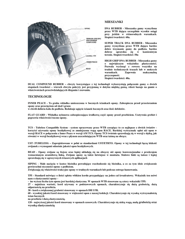 MIESZANKI DNA RUBBER - Mieszanka gumy wymyślona przez WTB dająca szczególnie wysokie osiągi przy jeździe w różnorodnych warunkach. Stopień twardości: 60a. SUPER TRACK DNA RUBBER - Mieszanka gumy wymyślona przez WTB dająca bardzo dobre trzymanie gumy do podłoża. bardzo dobrze sprawdza się w kamienistym terenie. Stopień twardości: 50a HIGH GRIP DNA RUBBER - Mieszanka gumy o największym wskaźniku plastyczności. Pozwala wycisnąć z roweru wszystko na trudnie technicznych trasach lub w mokrych warunkach. Zapewnia maksymalną przyczepność. Stopień twardości: 40a. DUAL COMPOUND RUBBER – chwyty korzystające z tej technologii wykorzystują połączenie gumy o dwóch stopniach twardości – wierzch chwytu pokryty jest przyjemną w dotyku miękką gumą, rdzeń bazuje na gumie o właściwościach przeciwdziałających ślizganiu i zsuwaniu. TECHNOLOGIE INNER PEACE - To gruba wkładka umieszczona w bocznych ściankach opony. Zabezpiecza przed przecieraniem opony oraz przecięciom od skał i gruzu w chwili dobicia koła do podłoża. Redukuje ugięcie ścianek bocznych oraz ilość defektów. FLAT GUARD - Wkładka nylonowa zabezpieczająca środkową część opony przed przebiciem. Usztywnia grzbiet i poprawia właściwości toczne opony. TCS - Tubeless Compatible System - system opracowany przez WTB czerpiący to co najlepsze z dwóch światów korzyści używania opony bezdętkowej ze zmniejszona wagą opon RACE. Bardziej wytrzymały oplot niż opon w wersji RACE w połączeniu z Inner Peace w wersji AM TCS. Opony TCS świetnie sprawdzają się w wersji z dętką, jak również w wersji bezdętkowej wraz z płynem uszczelniającym WTB oraz taśmą na obręcz. UST (TUBELESS) – Zaprojektowane w pełni ze standardami UST/ETRTO. Opony w tej technologii łączą lekkość zwijanek z wymogami odnośnie jakości opon bezdętkowych. BEAD - Opony zwijane są lżejsze oraz lepiej układają się na obręczy niż opony konwencjonalne z przekrojem wzmacnianym aramidową linką. Zwijane opony są także łatwiejsze w montażu. Stalowe linki są tańsze i lepiej sprawdzają się w agresywnych triasowych aplikacjach SIPING - Małe nacięcia w kostce bieżnika powodujące rozchodzenie się bieżnika, a co za tym idzie zwiększenie powierzchni styczności opony z podłożem. Zwiększają się właściwości trakcyjne opony w trudnych warunkach lub podczas ostrego hamowania. TPI - Standard mówiący o ilości splotu włókien kordu przypadający na jeden cal kwadratowy. Wskaźnik ten mówi nam o elastyczności opony - im wyższa liczba tym opona jest bardziej elastyczna. W oponach WTB stosowane są cztery wskaźniki TPI: 27 - najniższa wartość, kord używany w podstawowych oponach, charakteryzuje się dużą grubością, dużą odpornością na przebicia. 30 - kord o zwiększonej grubości stosowany w oponach DH I FR. 60 - wysokiej jakości kord stosowany w większości opon z naszej kolekcji. Charakteryzuje się wysoką wytrzymałością ścian bocznych na przebicia i dużą elastycznością. 120 - najwyższej jakości kord stosowany w oponach szosowych. Charakteryzuje się niską wagą, małą grubością oraz wysoką elastycznością
